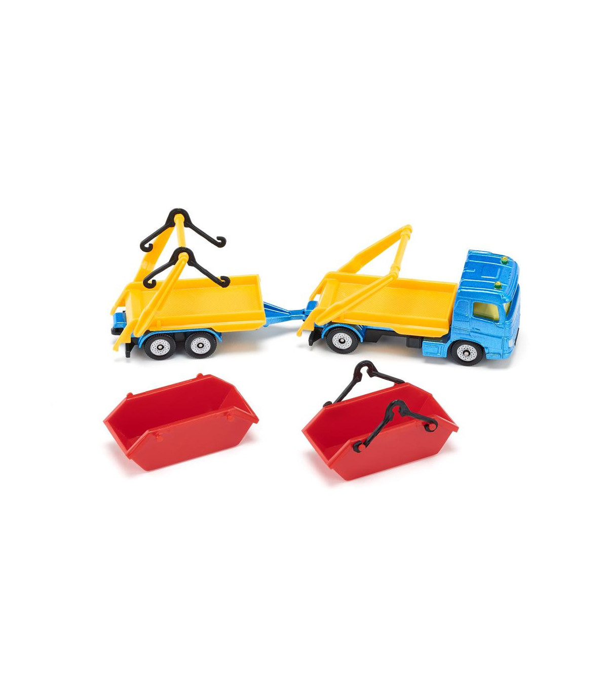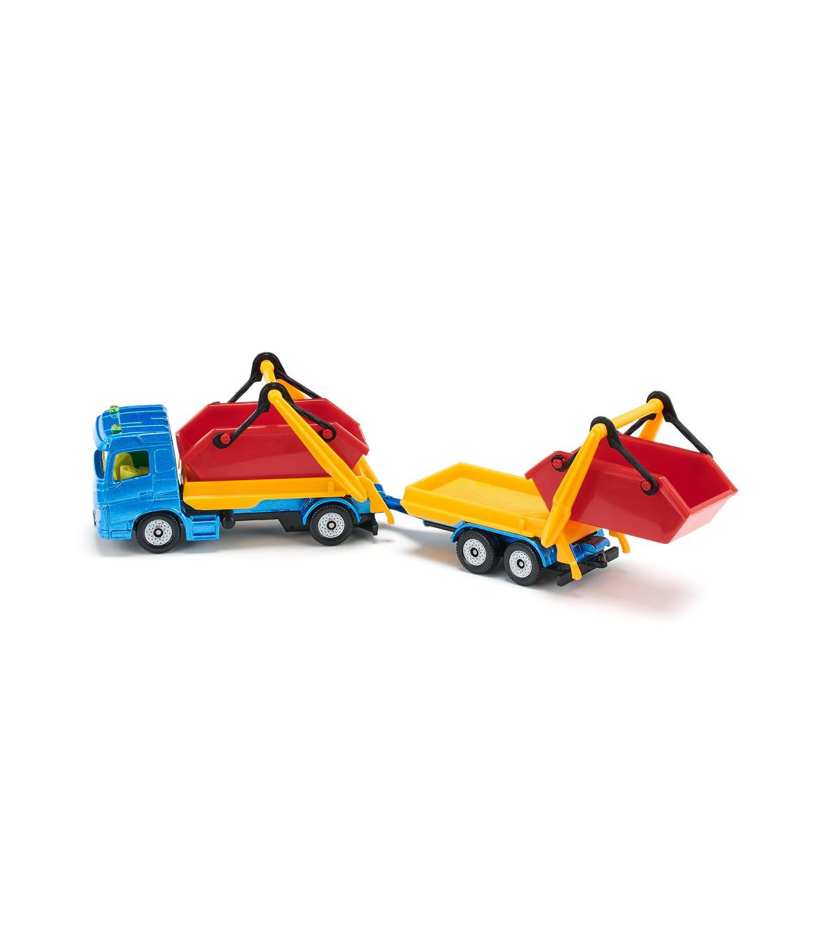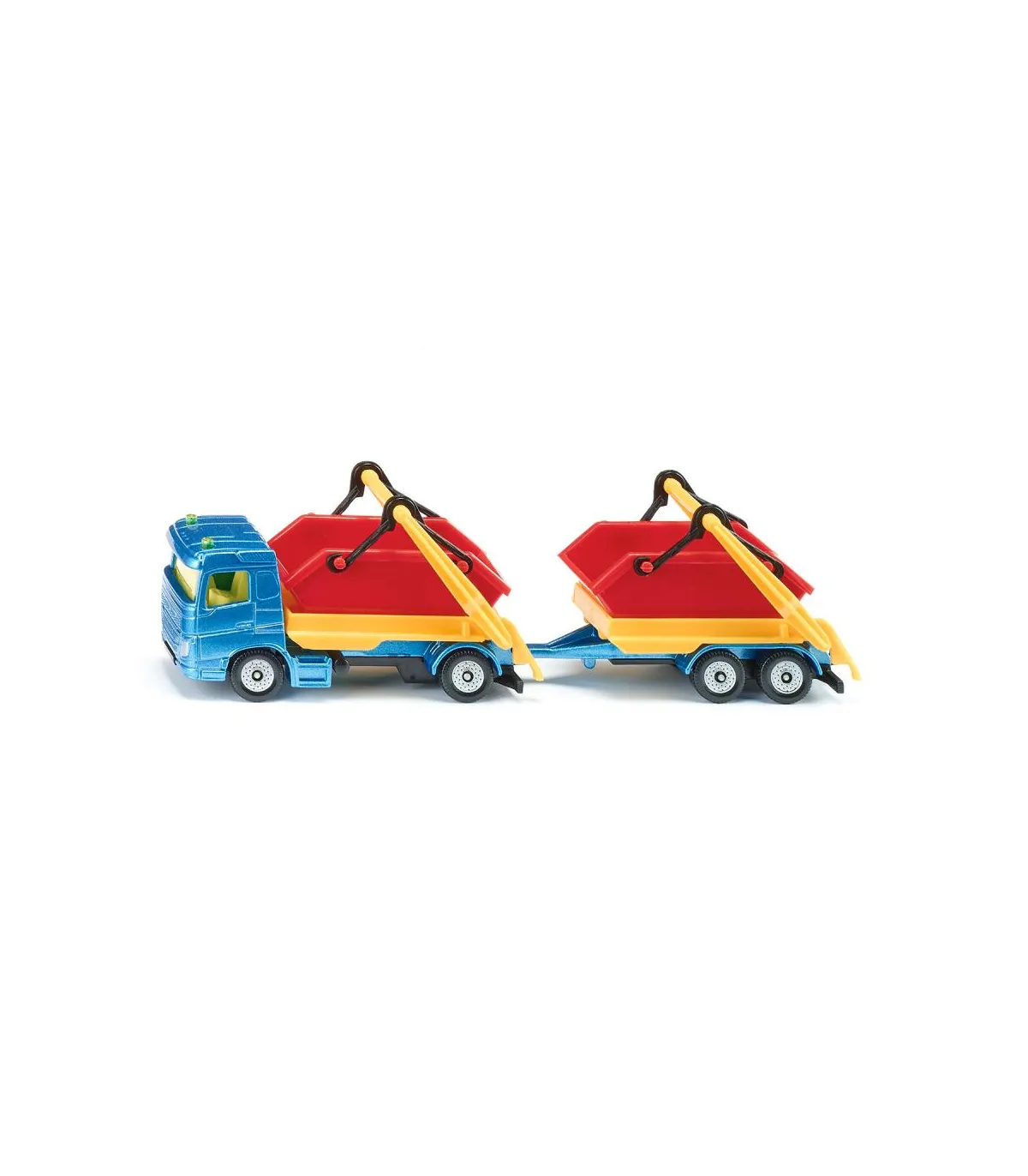 Ya sea arena, piedras o escombros de construcción: ¡el camión con tolva y remolque realmente puede deshacerse de cualquier cosa! El vehículo tractor es un camión de dos ejes con cabina metálica, el remolque tiene un chasis con eje tándem y plataforma metálica. En el camión y en el remolque se puede transportar un contenedor. El dispositivo de depósito en ambas partes del vehículo es móvil, de modo que los contenedores se pueden cargar y descargar fácilmente. Las ruedas de marcha suave en todo el tren garantizan la movilidad y facilitan las maniobras. Los contenedores de color rojo brillante contrastan sorprendentemente con el camión azul con brazos abatibles amarillos. ¡Con este colorido y versátil tren de vehículos podrás recrear una y otra vez nuevos escenarios de obras!