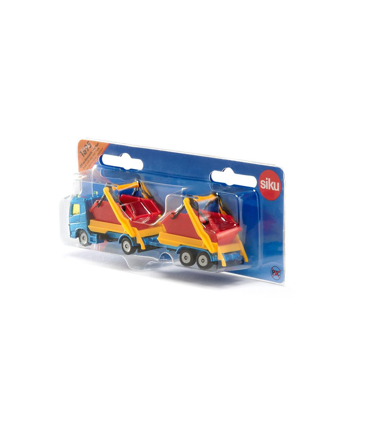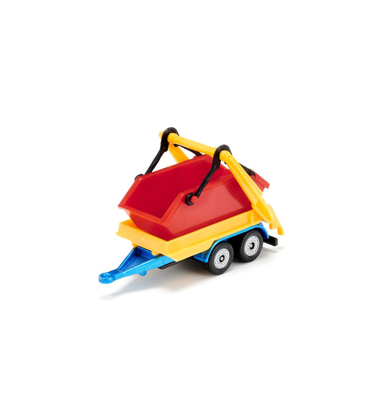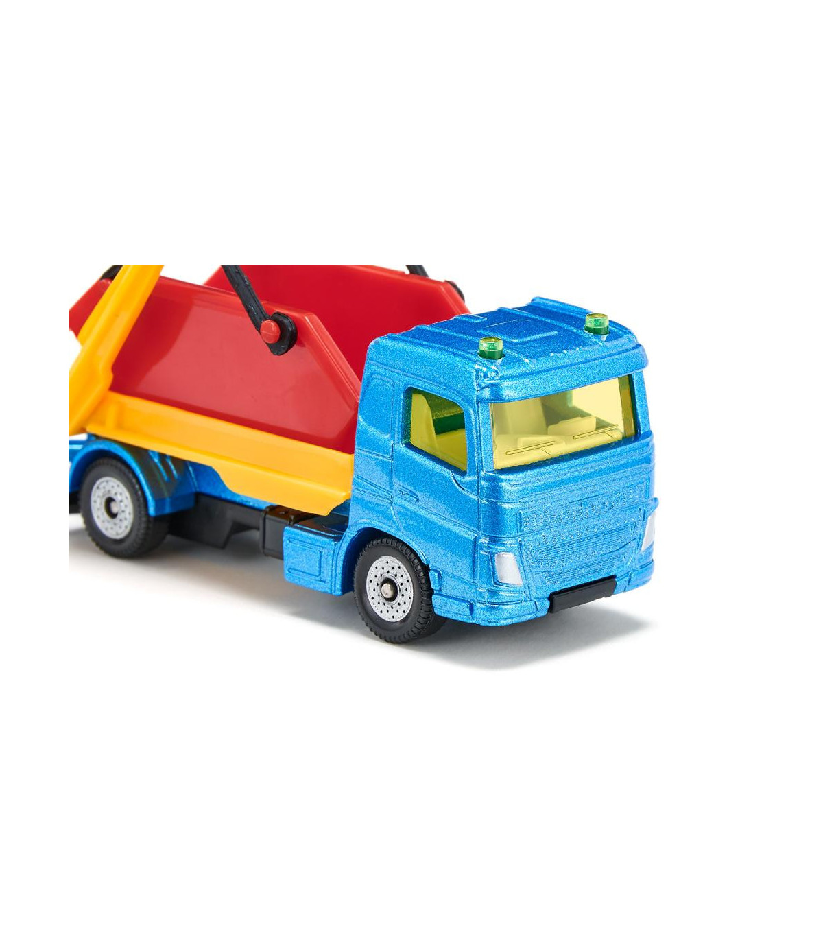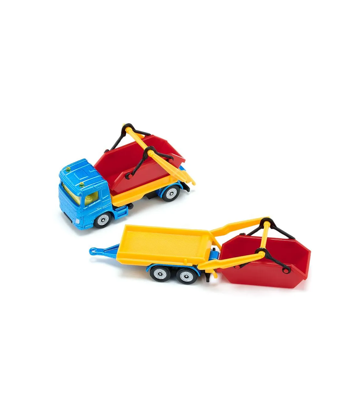 Ya sea arena, piedras o escombros de construcción: ¡el camión con tolva y remolque realmente puede deshacerse de cualquier cosa! El vehículo tractor es un camión de dos ejes con cabina metálica, el remolque tiene un chasis con eje tándem y plataforma metálica. En el camión y en el remolque se puede transportar un contenedor. El dispositivo de depósito en ambas partes del vehículo es móvil, de modo que los contenedores se pueden cargar y descargar fácilmente. Las ruedas de marcha suave en todo el tren garantizan la movilidad y facilitan las maniobras. Los contenedores de color rojo brillante contrastan sorprendentemente con el camión azul con brazos abatibles amarillos. ¡Con este colorido y versátil tren de vehículos podrás recrear una y otra vez nuevos escenarios de obras!