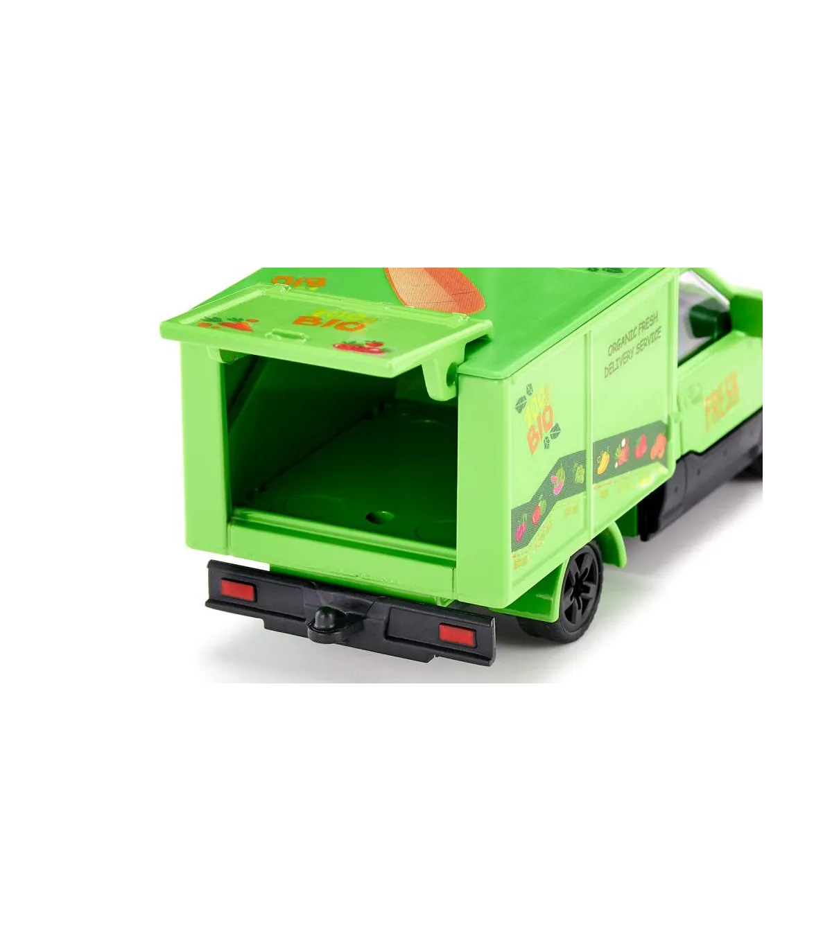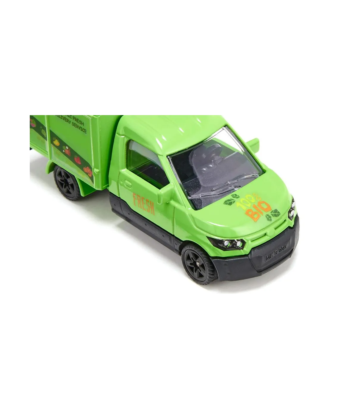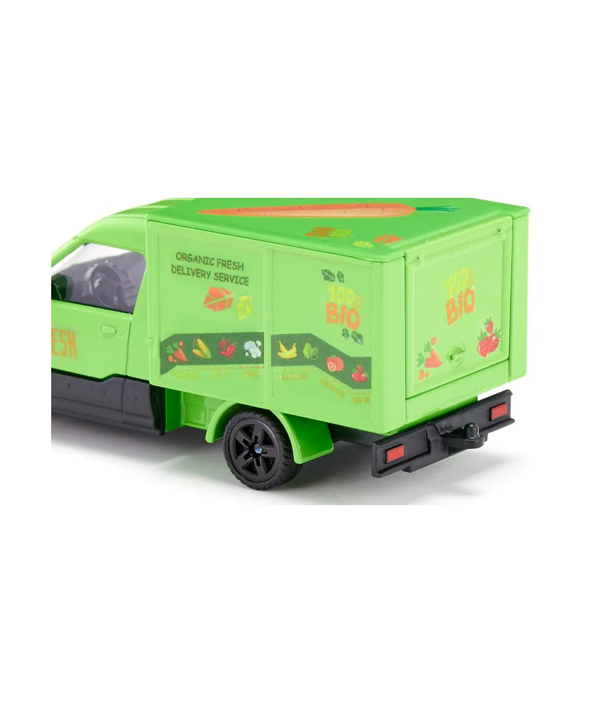 Huevos y leche frescos, pan de campo crujiente, frutas jugosas y verduras crujientes directamente del campo: con el servicio de entrega BIO la comida llega directamente a su puerta en la ciudad. Y el medio ambiente no sólo se tiene en cuenta en la mercancía, sino también durante el transporte. Porque la entrega se realiza completamente libre de emisiones mediante un scooter eléctrico. La cabina del conductor de este modelo siku está hecha de metal, la carrocería es de plástico. Se puede abrir una trampilla en la parte trasera para cargar y descargar. La furgoneta se puede decorar aún más con las hojas de pegatinas incluidas con las palabras "Servicio de entrega de productos frescos ecológicos" en diferentes idiomas, así como con coloridas imágenes de frutas y verduras. Y como un servicio de reparto obviamente no puede prescindir de los productos adecuados, también hay cuatro láminas de cartón de las que se pueden extraer alimentos preimpresos, como frutas, verduras, huevos o leche. Sin embargo, sólo en dos de las cuatro hojas se muestran los elementos a todo color. Las otras dos láminas sólo tienen impresos los contornos, para que los niños se pongan creativos y pinten la comida como quieran.