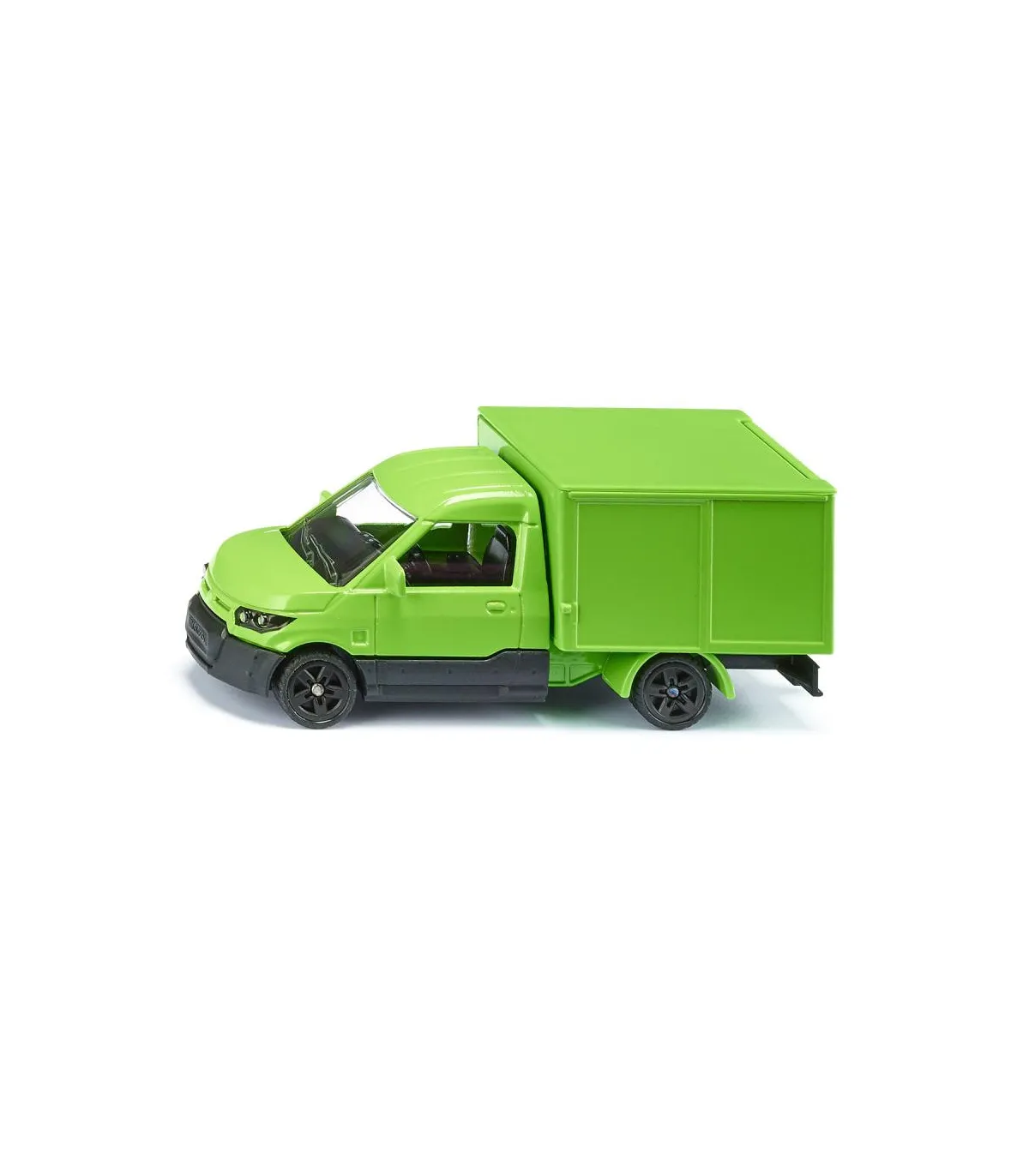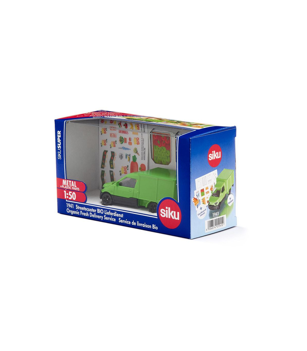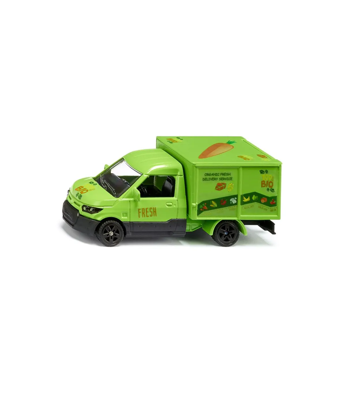 Huevos y leche frescos, pan de campo crujiente, frutas jugosas y verduras crujientes directamente del campo: con el servicio de entrega BIO la comida llega directamente a su puerta en la ciudad. Y el medio ambiente no sólo se tiene en cuenta en la mercancía, sino también durante el transporte. Porque la entrega se realiza completamente libre de emisiones mediante un scooter eléctrico. La cabina del conductor de este modelo siku está hecha de metal, la carrocería es de plástico. Se puede abrir una trampilla en la parte trasera para cargar y descargar. La furgoneta se puede decorar aún más con las hojas de pegatinas incluidas con las palabras "Servicio de entrega de productos frescos ecológicos" en diferentes idiomas, así como con coloridas imágenes de frutas y verduras. Y como un servicio de reparto obviamente no puede prescindir de los productos adecuados, también hay cuatro láminas de cartón de las que se pueden extraer alimentos preimpresos, como frutas, verduras, huevos o leche. Sin embargo, sólo en dos de las cuatro hojas se muestran los elementos a todo color. Las otras dos láminas sólo tienen impresos los contornos, para que los niños se pongan creativos y pinten la comida como quieran.
