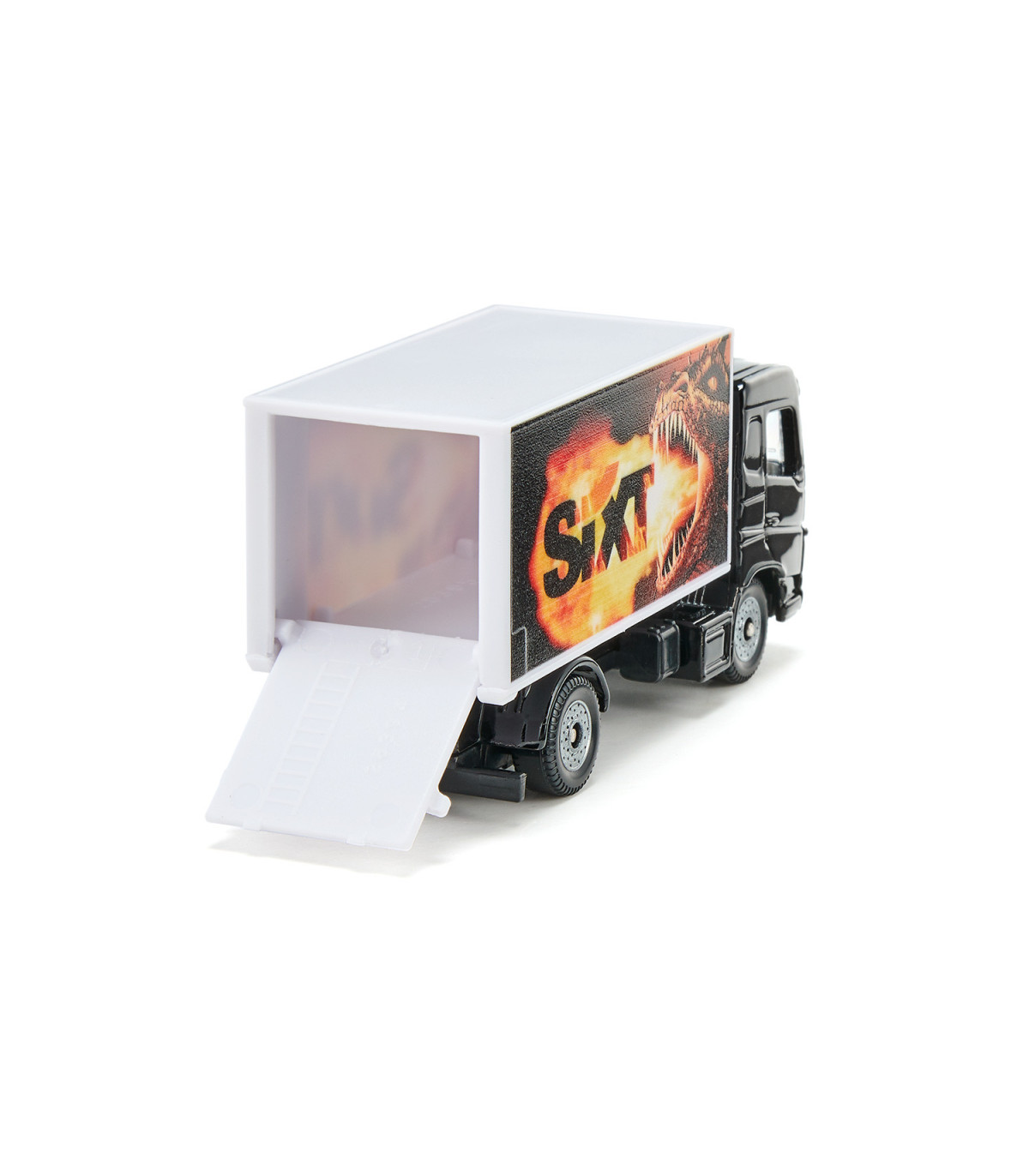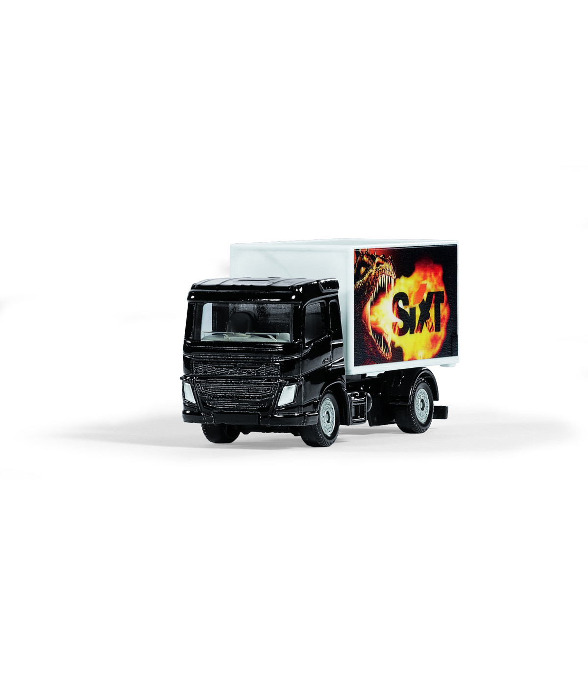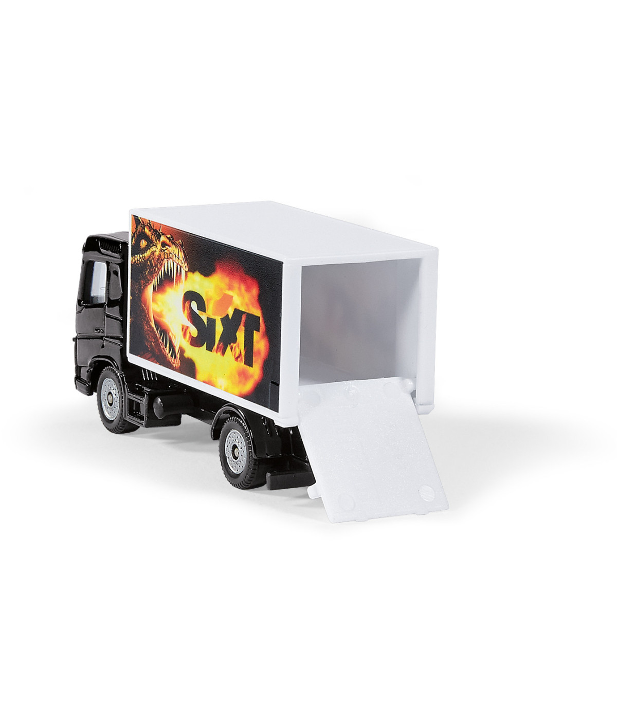¿Te estas moviendo? ¿O tal vez el coche es demasiado pequeño para transportar objetos especialmente voluminosos? No hay problema: ¡todo cabe en el camión de alquiler con carrocería de caja de Sixt! La cabina de metal está pintada de negro y se asienta sobre un chasis de plástico de dos ejes con ruedas libres. El portón trasero de la caja se puede abrir para cargar y descargar el camión. La enorme cabeza de dragón a los lados llama la atención