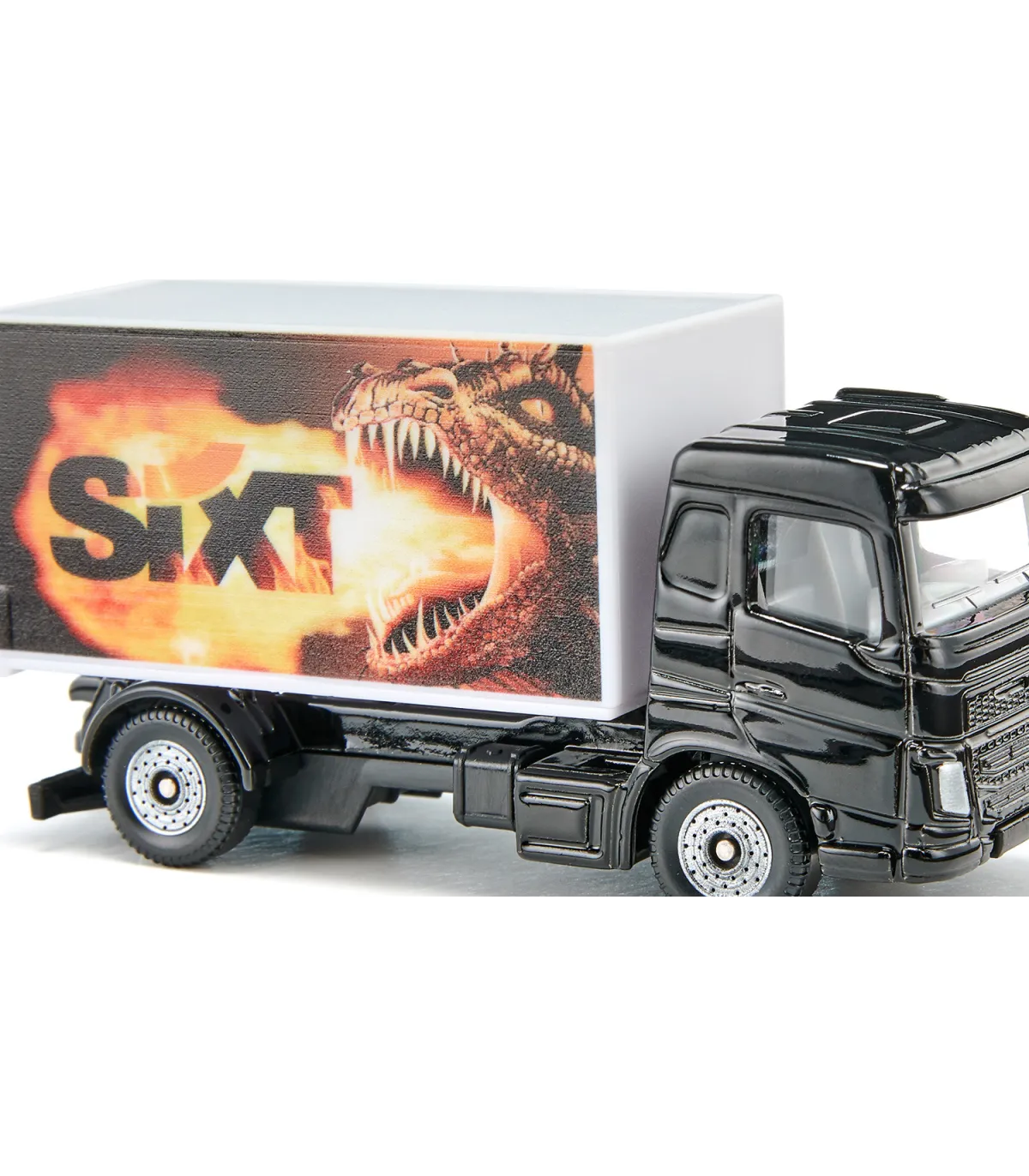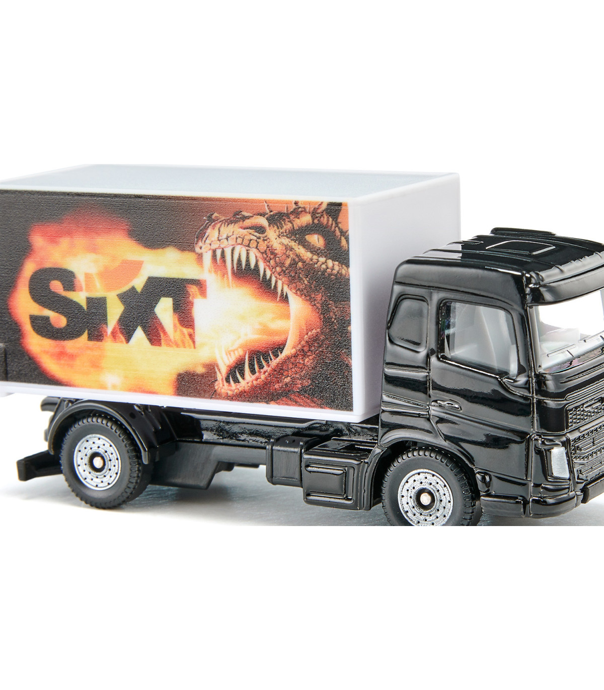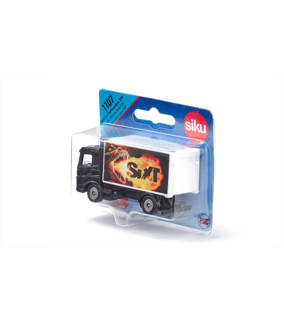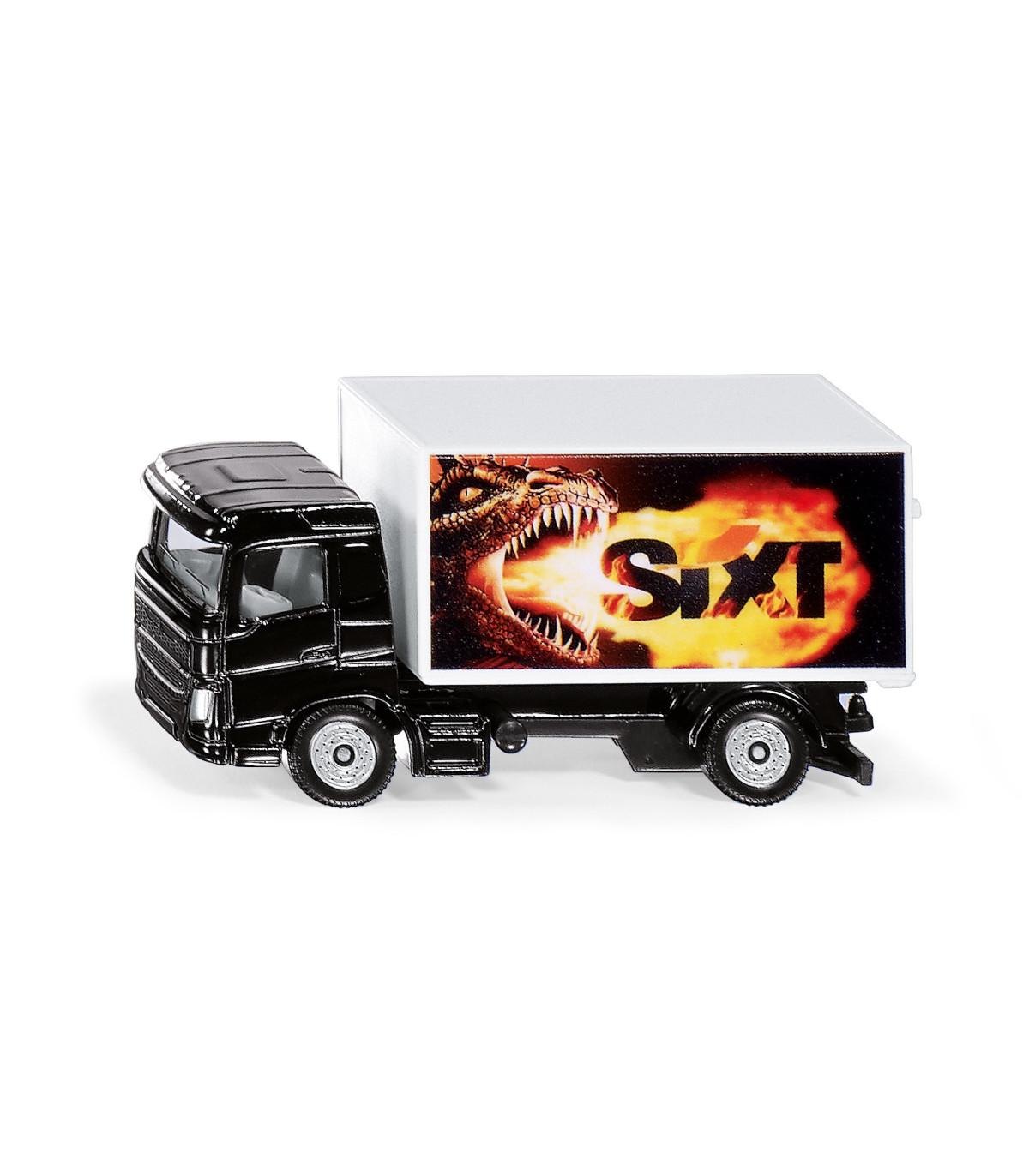 ¿Te estas moviendo? ¿O tal vez el coche es demasiado pequeño para transportar objetos especialmente voluminosos? No hay problema: ¡todo cabe en el camión de alquiler con carrocería de caja de Sixt! La cabina de metal está pintada de negro y se asienta sobre un chasis de plástico de dos ejes con ruedas libres. El portón trasero de la caja se puede abrir para cargar y descargar el camión. La enorme cabeza de dragón a los lados llama la atención