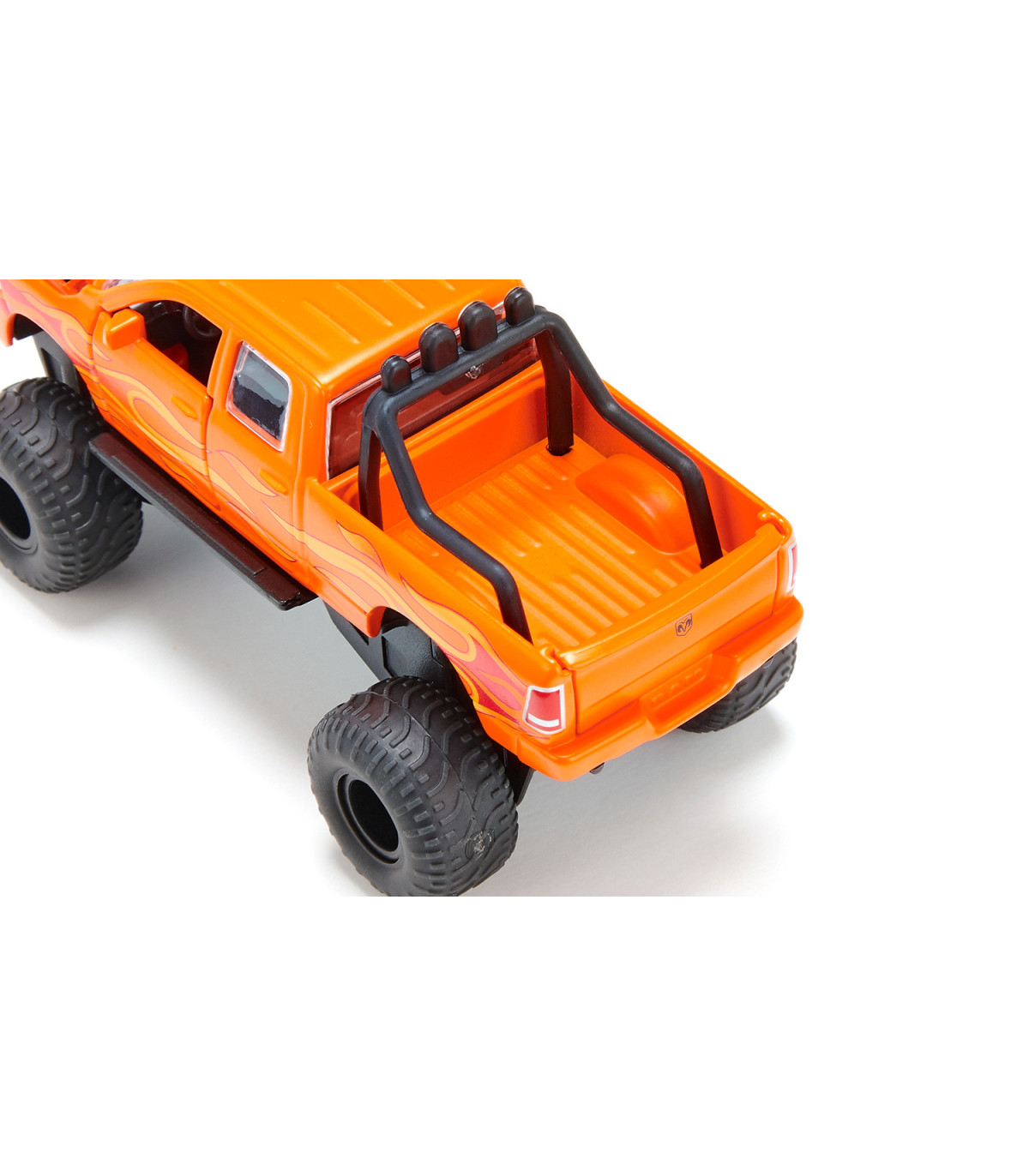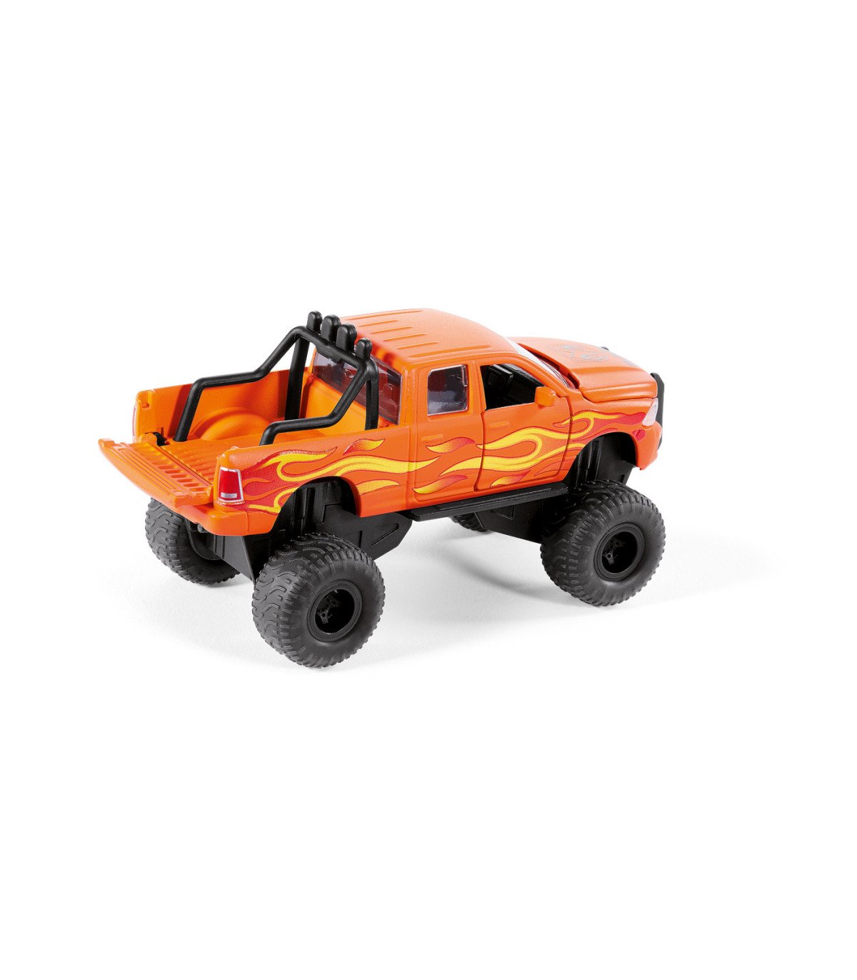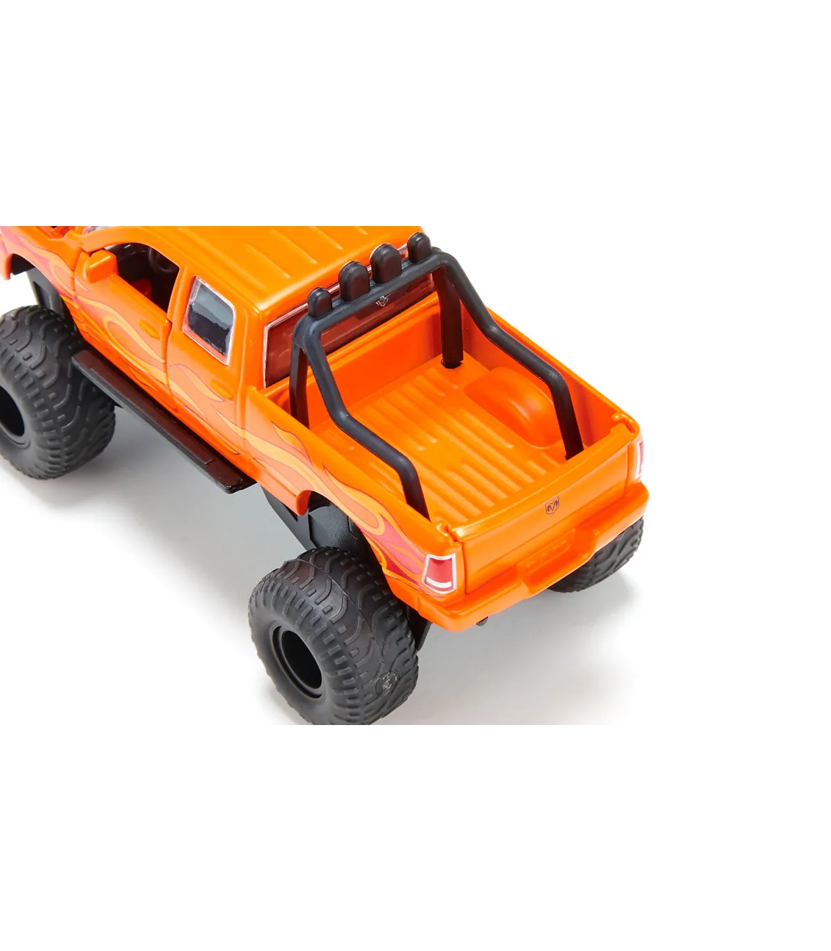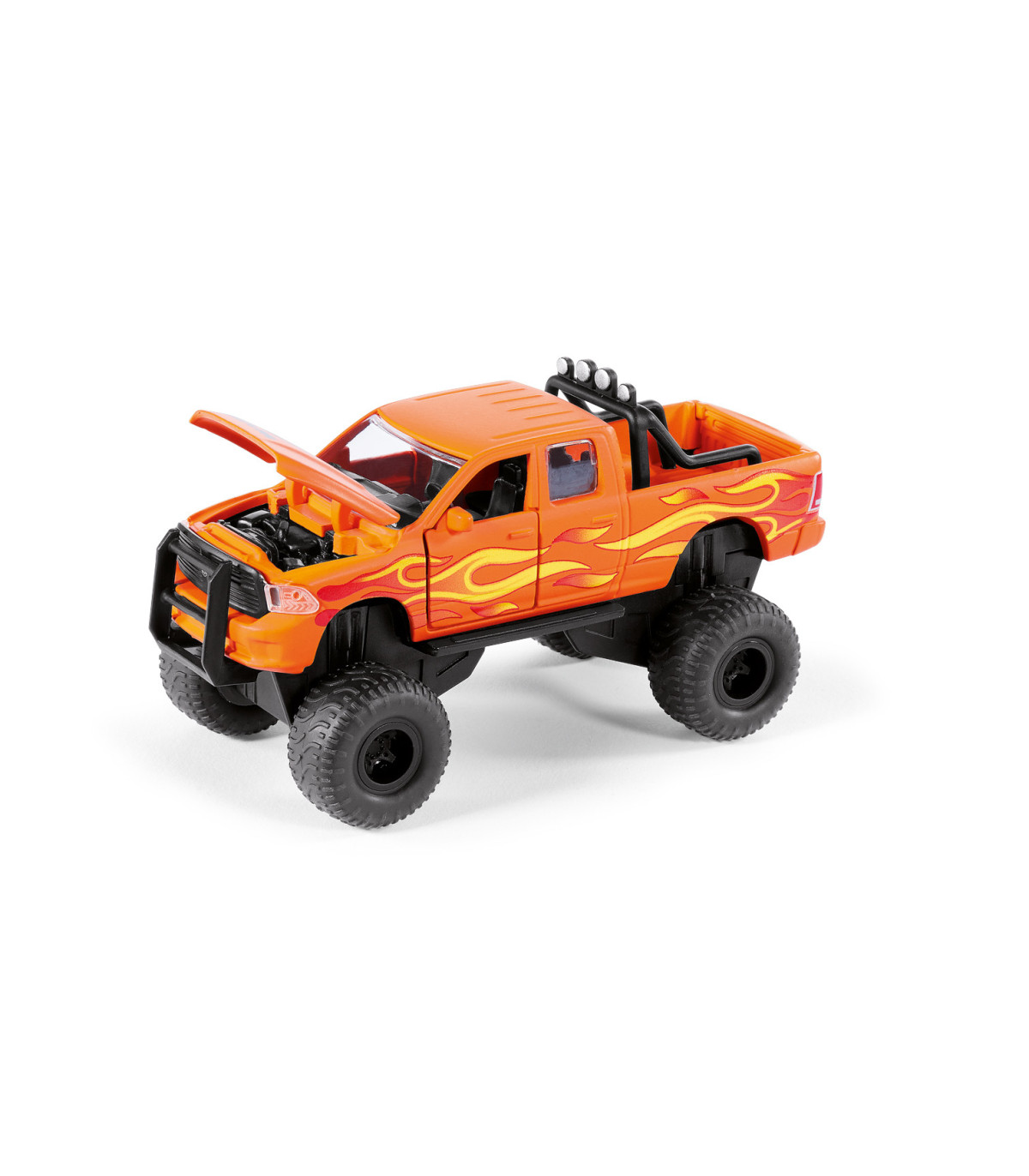 Esta popular versión personalizada estadounidense de la Dodge RAM no sólo tiene llamas en la carrocería, sino también mucha presión en la caldera: ¡con 395 CV bajo el capó! El frente está adornado con el típico logo con la cabeza carnosa de un carnero, que simboliza poder y fuerza. El conocido bullbar, una enorme barra protectora frontal, refuerza su aspecto especialmente robusto. En la zona de carga también se fija un soporte sobre el que se monta una unidad de iluminación con cuatro focos. La carrocería de este modelo siku está fabricada en metal, el capó, las puertas y el portón trasero se pueden abrir. Cada uno de sus ejes tiene muelles individuales y las ruedas se pueden cambiar. Como versión personalizada superior en color naranja brillante con neumáticos tipo globo particularmente gruesos y anchos e impresión de llamas en ambos lados, la RAM 1500 tiene una apariencia impresionante que se ve con bastante frecuencia en las carreteras estadounidenses.