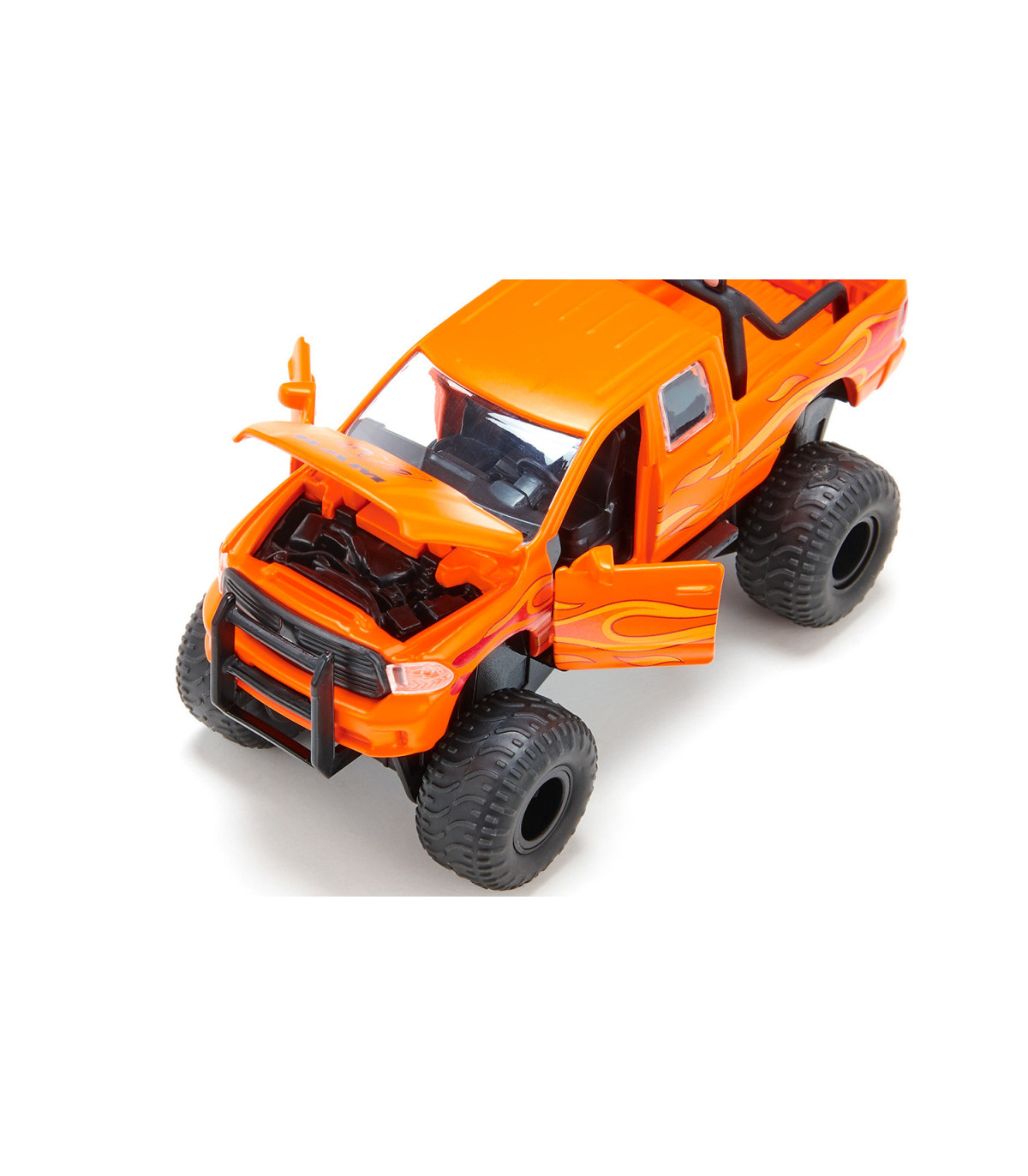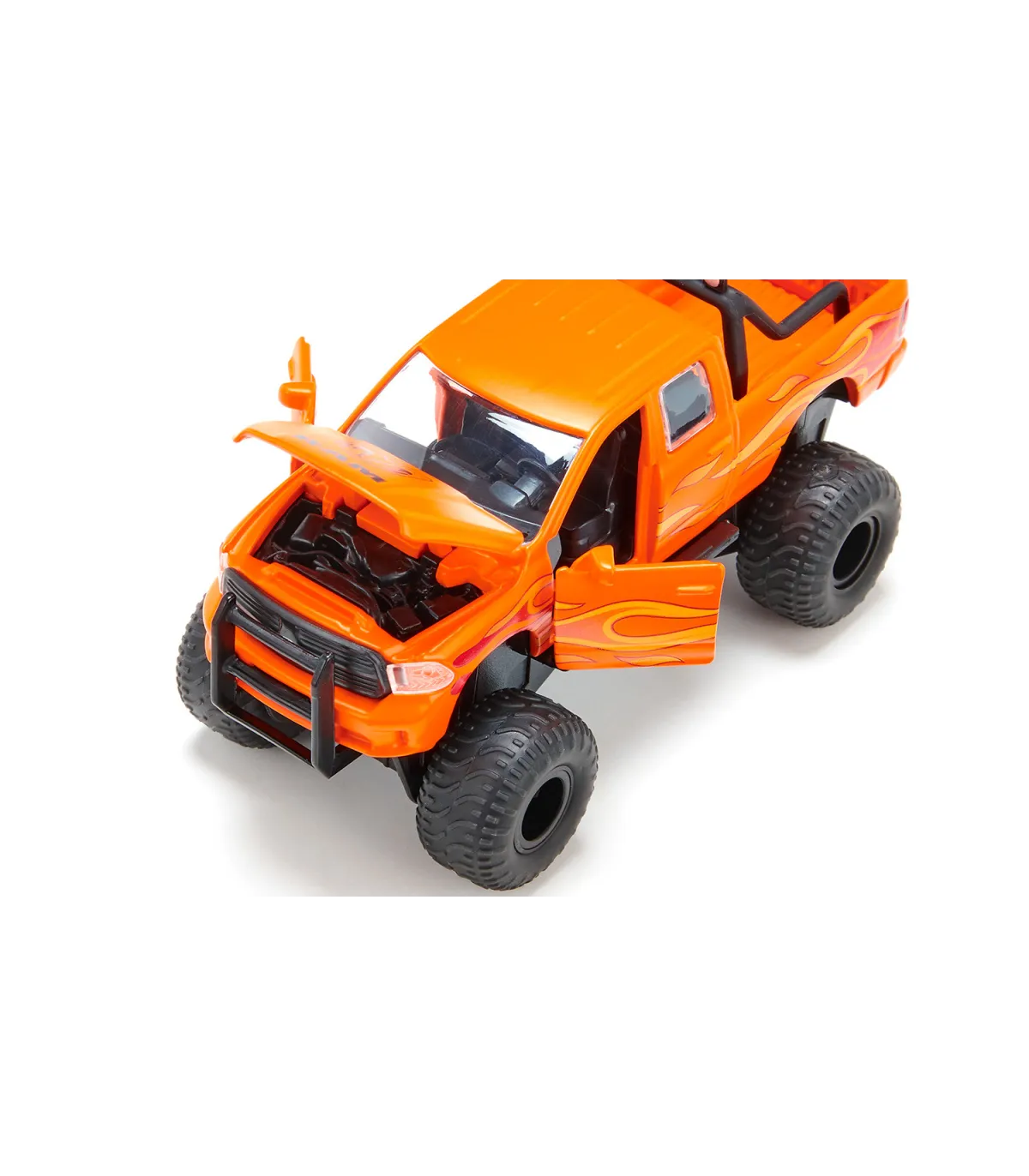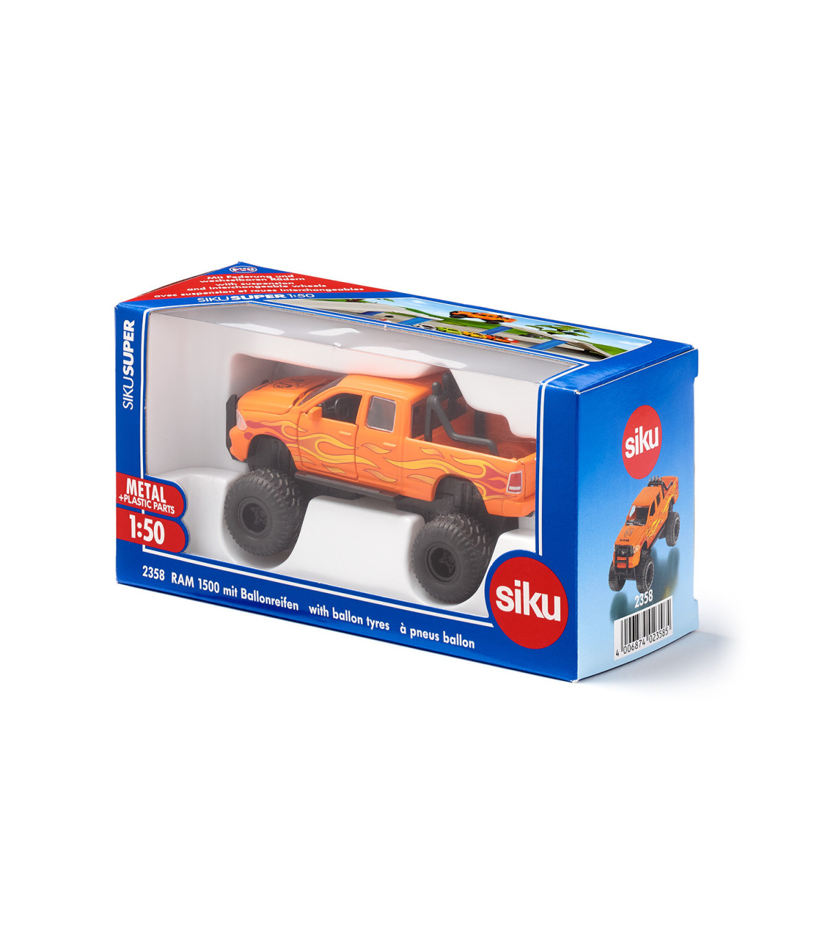 Esta popular versión personalizada estadounidense de la Dodge RAM no sólo tiene llamas en la carrocería, sino también mucha presión en la caldera: ¡con 395 CV bajo el capó! El frente está adornado con el típico logo con la cabeza carnosa de un carnero, que simboliza poder y fuerza. El conocido bullbar, una enorme barra protectora frontal, refuerza su aspecto especialmente robusto. En la zona de carga también se fija un soporte sobre el que se monta una unidad de iluminación con cuatro focos. La carrocería de este modelo siku está fabricada en metal, el capó, las puertas y el portón trasero se pueden abrir. Cada uno de sus ejes tiene muelles individuales y las ruedas se pueden cambiar. Como versión personalizada superior en color naranja brillante con neumáticos tipo globo particularmente gruesos y anchos e impresión de llamas en ambos lados, la RAM 1500 tiene una apariencia impresionante que se ve con bastante frecuencia en las carreteras estadounidenses.