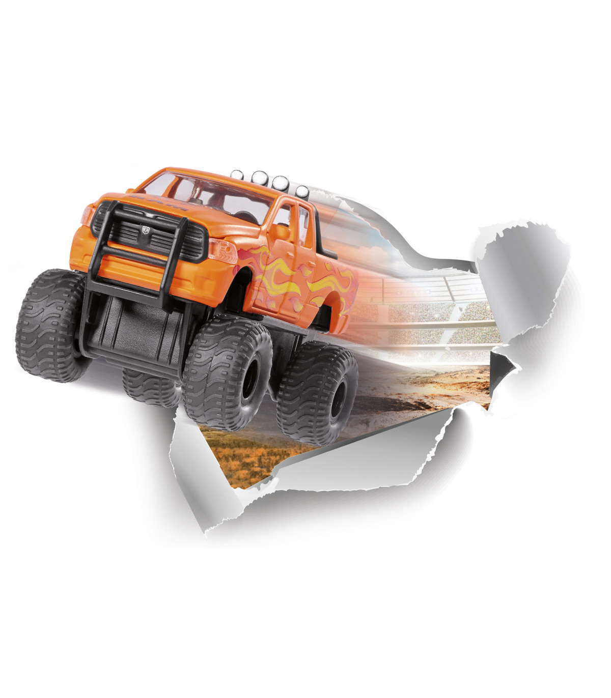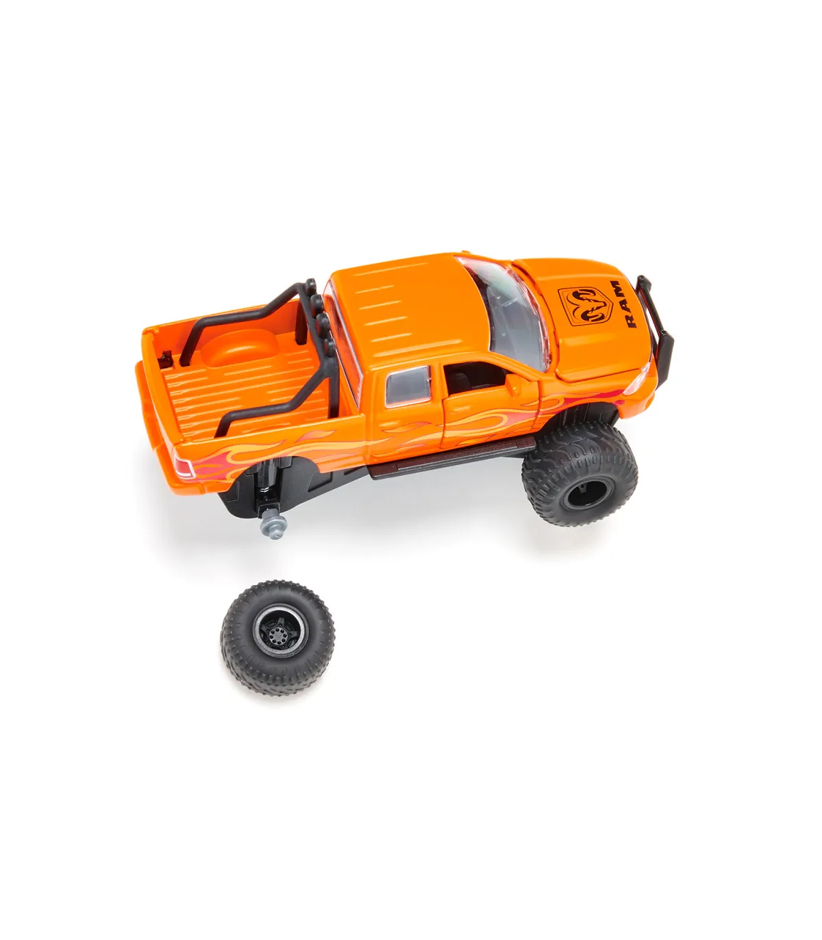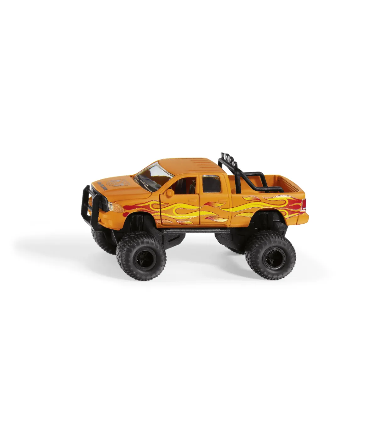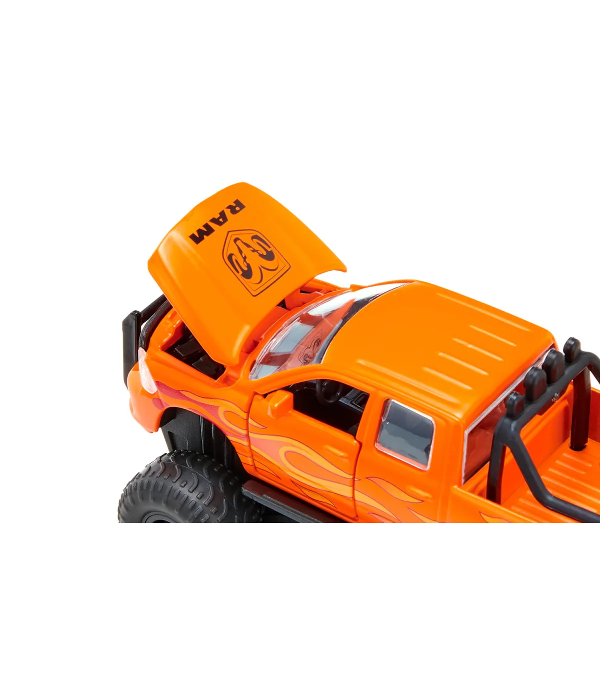 Esta popular versión personalizada estadounidense de la Dodge RAM no sólo tiene llamas en la carrocería, sino también mucha presión en la caldera: ¡con 395 CV bajo el capó! El frente está adornado con el típico logo con la cabeza carnosa de un carnero, que simboliza poder y fuerza. El conocido bullbar, una enorme barra protectora frontal, refuerza su aspecto especialmente robusto. En la zona de carga también se fija un soporte sobre el que se monta una unidad de iluminación con cuatro focos. La carrocería de este modelo siku está fabricada en metal, el capó, las puertas y el portón trasero se pueden abrir. Cada uno de sus ejes tiene muelles individuales y las ruedas se pueden cambiar. Como versión personalizada superior en color naranja brillante con neumáticos tipo globo particularmente gruesos y anchos e impresión de llamas en ambos lados, la RAM 1500 tiene una apariencia impresionante que se ve con bastante frecuencia en las carreteras estadounidenses.