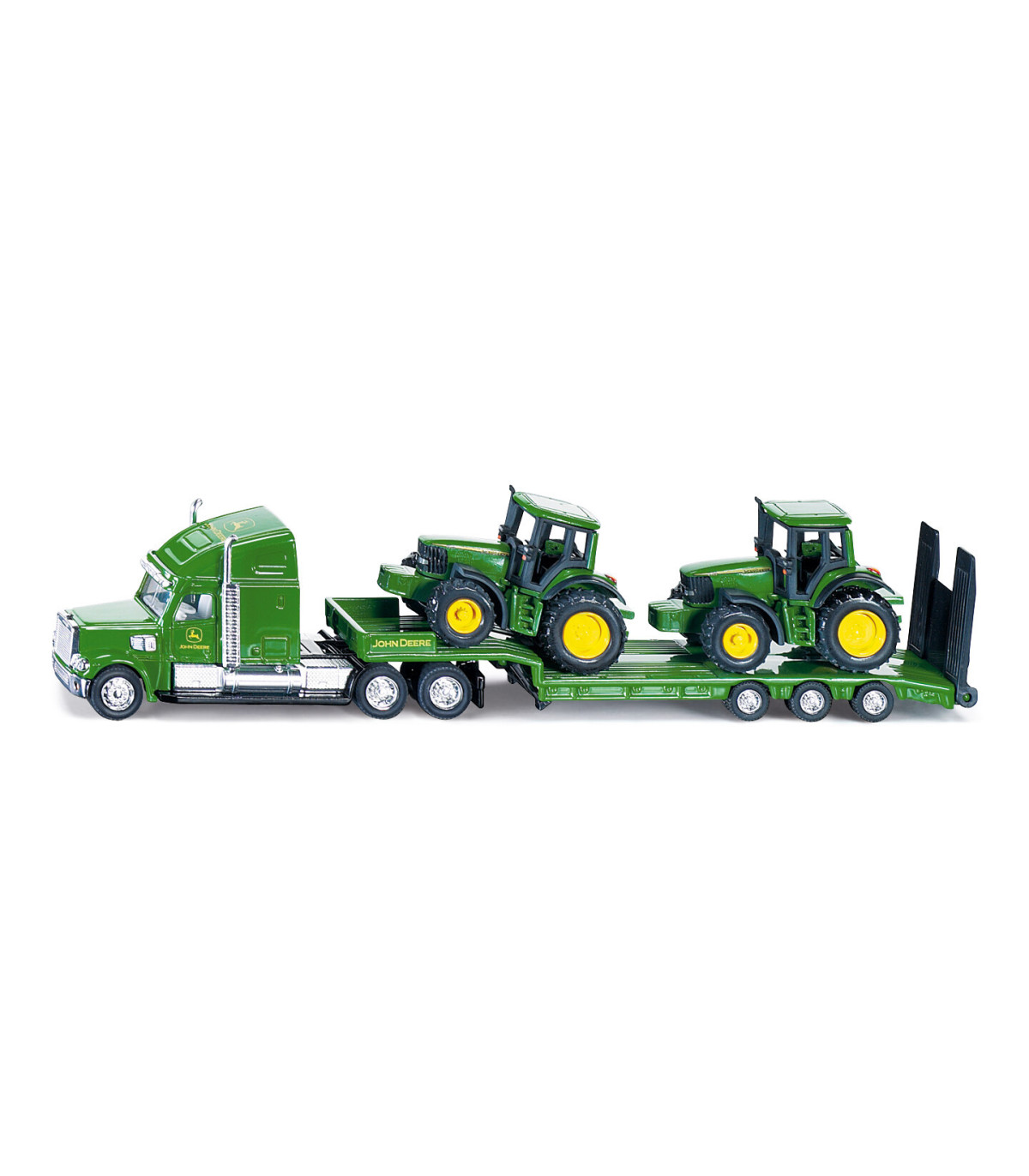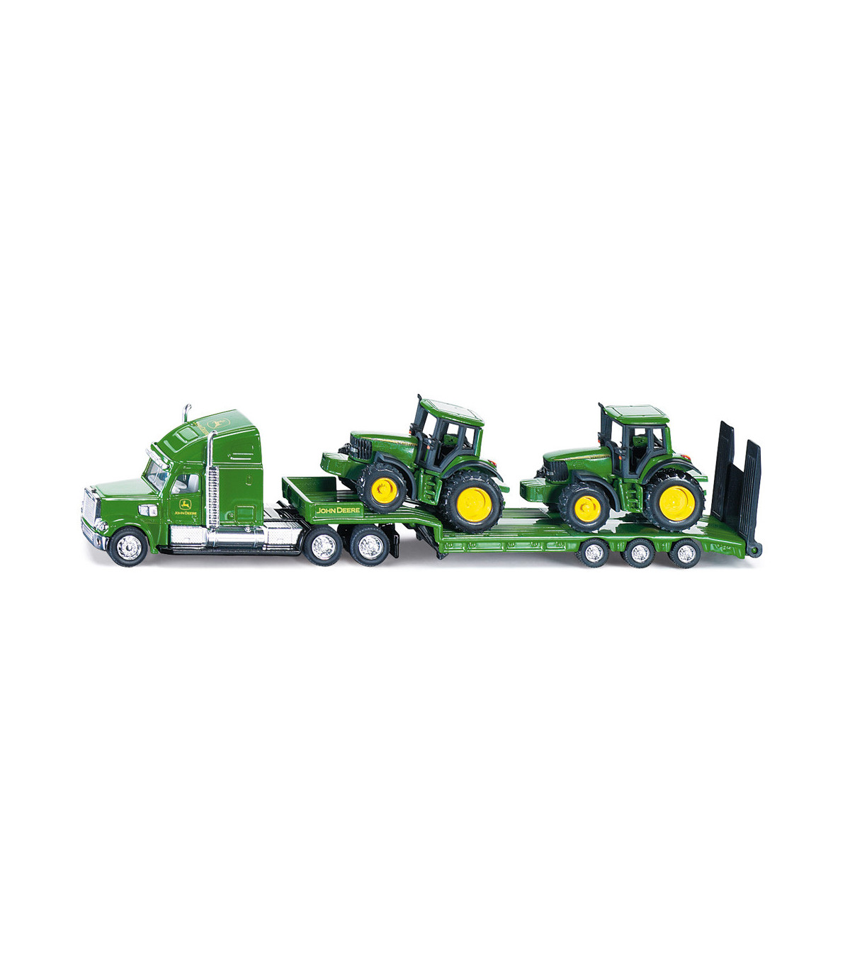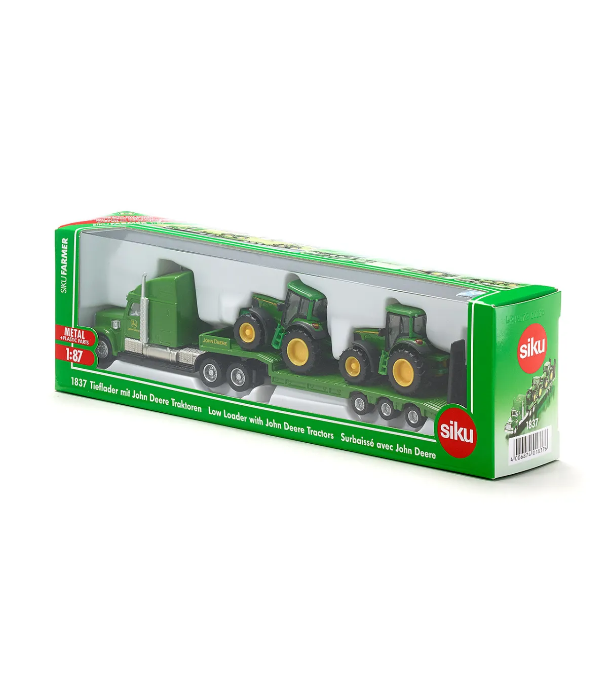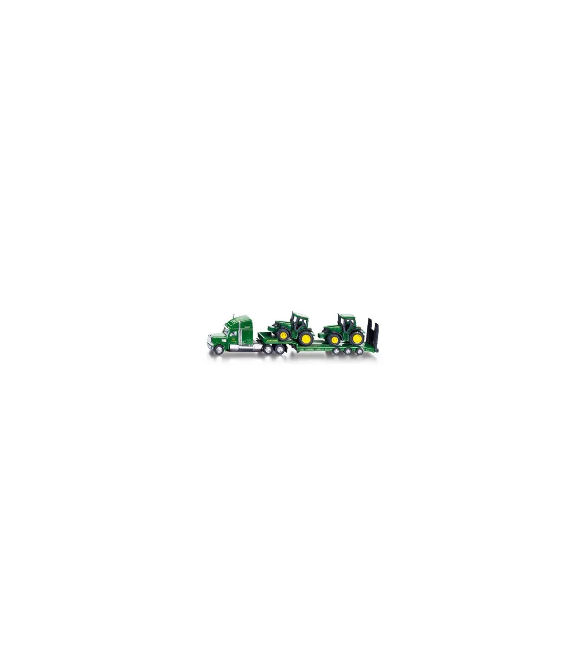 El exclusivo camión con remolque transporta fácilmente 2 tractores SIKU. Todos los vehículos están fabricados con piezas de metal y plástico de alta calidad en escala 1:87 y los neumáticos de goma permiten un fácil transporte sobre diversas superficies. El camión no es sólo un juguete, sino también una interesante incorporación a muchas colecciones.