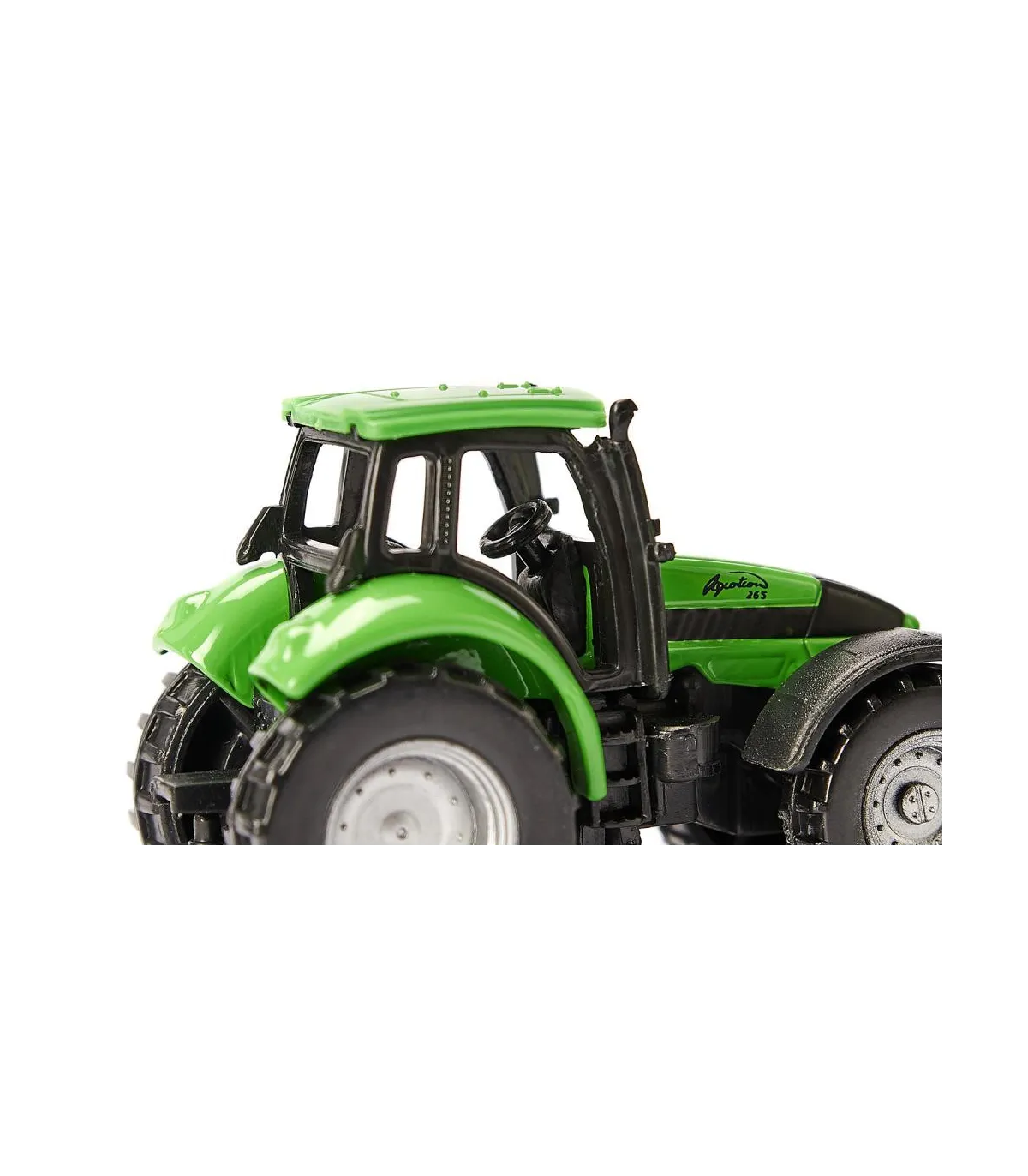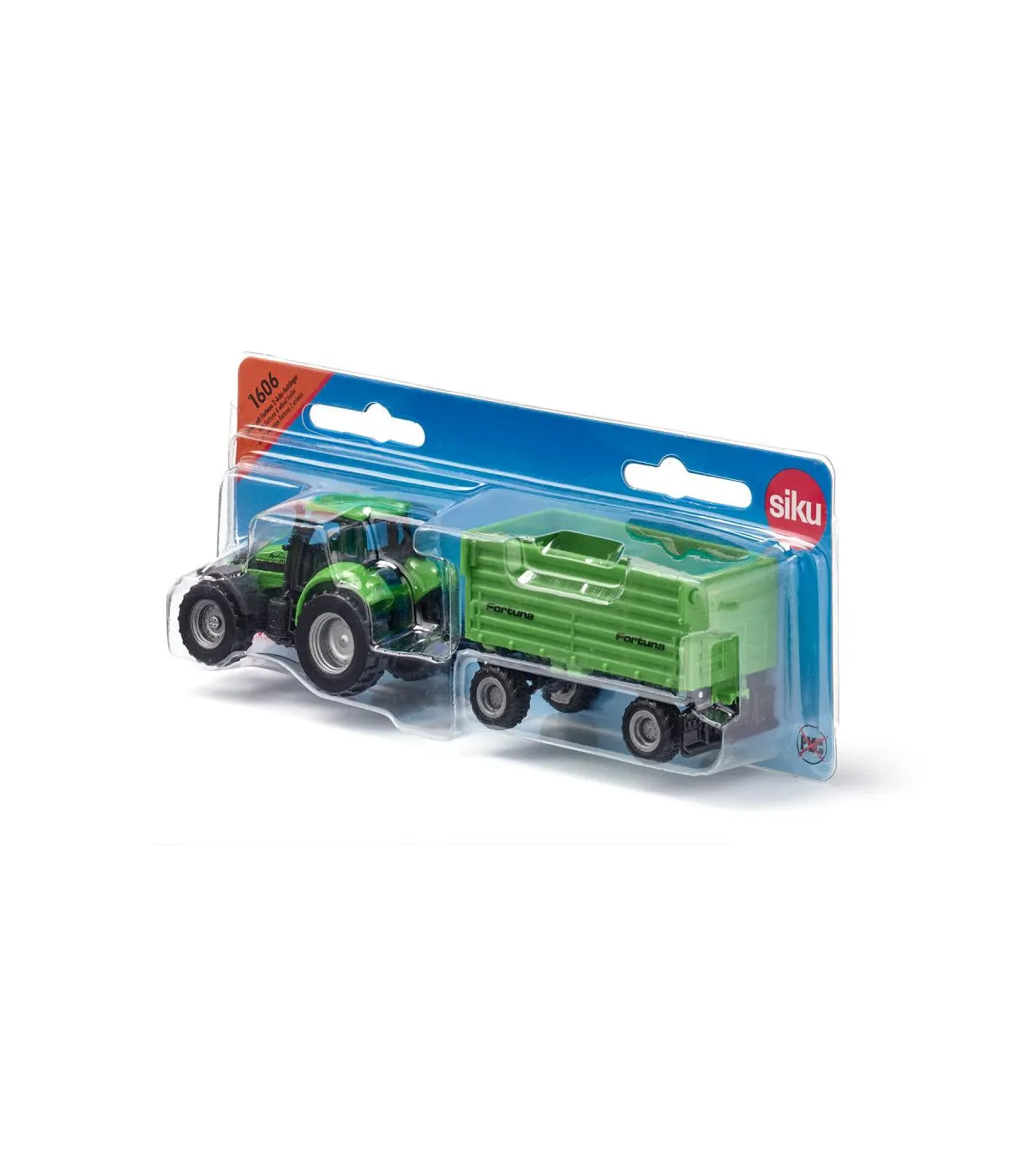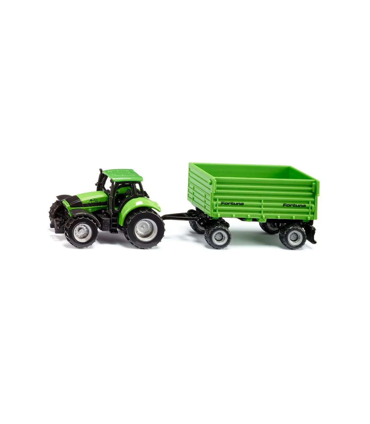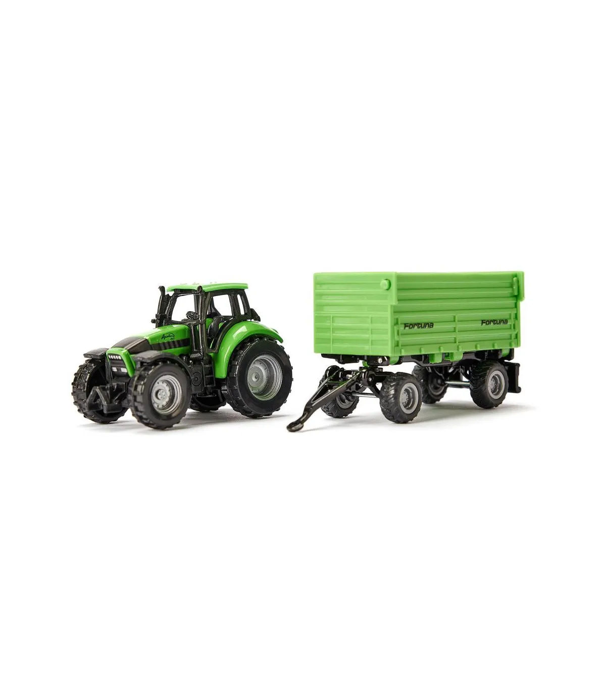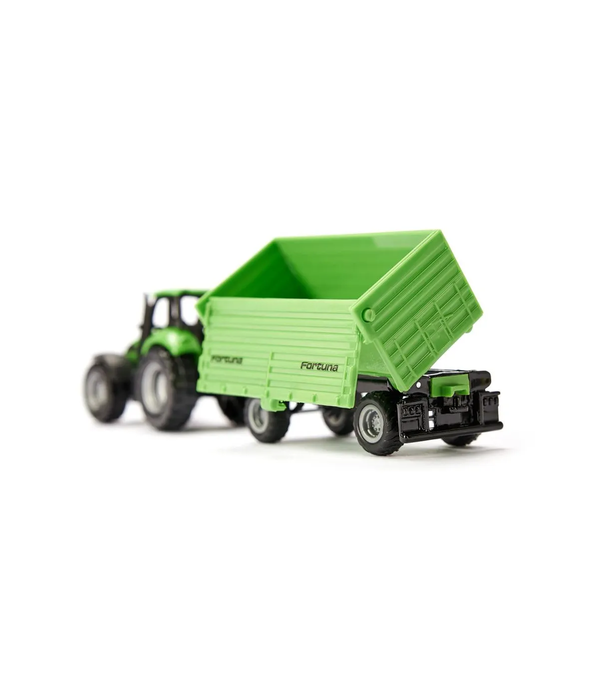 Tractor y remolque Fortuna de 2 ejes - resistente. Más fuerte. ¡Deutz Agrotrón! El modelo 265 puede acelerar el velocímetro hasta unos impresionantes 50 km/h gracias a sus 262 CV. ¡Una potencia así es imprescindible para todas las operaciones agrícolas en la vida real y en el juego! El coloso verde y negro se presenta como modelo siku de metal y plástico con ruedas de marcha suave. La cabina es desmontable y muestra el interior de la cabina del conductor. El chasis con barra de tiro del remolque es de metal con ruedas de goma; La cubeta es de plástico y se puede inclinar hacia la izquierda y la trampilla se puede abrir en el lado izquierdo del cuerpo. Gracias al acoplamiento estándar siku, el tractor y el remolque se combinan y están listos para su uso en un instante.