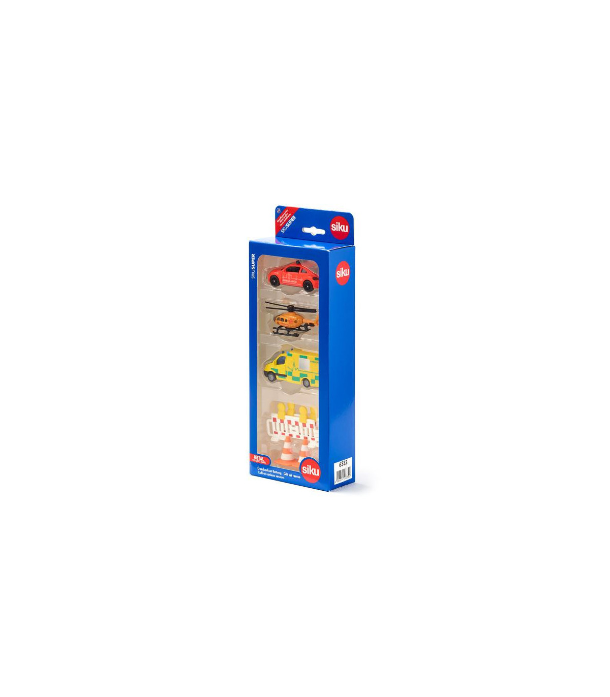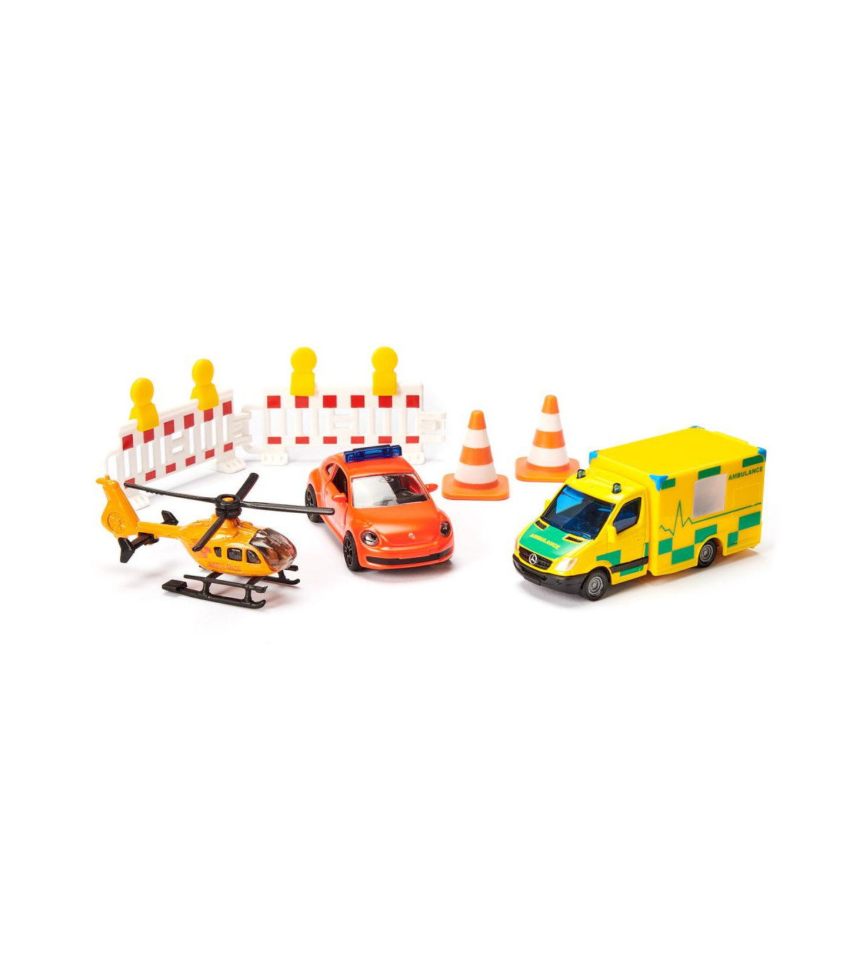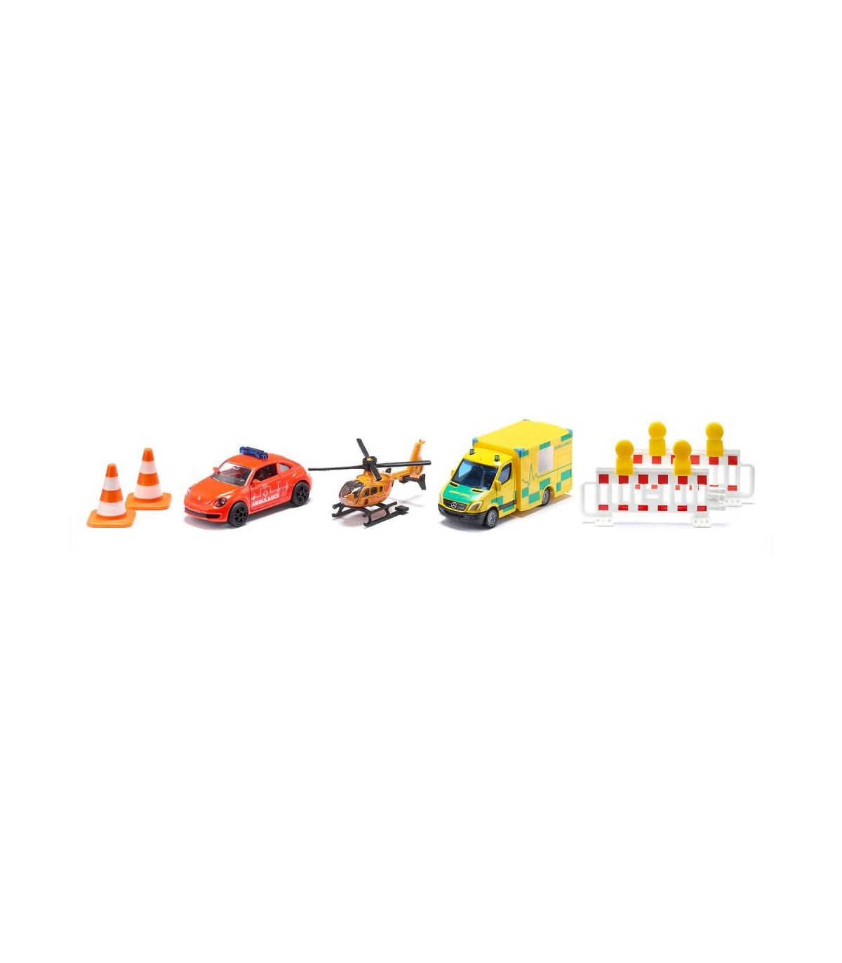 En una situación de emergencia, cada segundo cuenta. Por eso es importante que los rescatistas lleguen rápidamente al lugar. Ya sea en la carretera o desde el aire, con el set de rescate de siku la ayuda está al alcance de la mano, ¡porque los socorristas ya están en camino! El set se compone de tres modelos de vehículos y diversos accesorios. La ambulancia de emergencia es un VW Escarabajo con la inscripción internacional “Ambulance”, pintura operativa roja y barras luminosas azules en el techo. Las puertas del vehículo se pueden abrir. Una Mercedes Sprinter de color amarillo brillante con elaboradas señales multicolores y el letrero verde "Ambulance" en los costados corre en su ayuda como una ambulancia. También se utiliza un helicóptero como apoyo aéreo. Las palas de su rotor son plegables y la hélice se puede girar. Para asegurar el lugar del accidente, el set también contiene dos balizas de advertencia y dos torres de alta tensión de color blanco anaranjado.