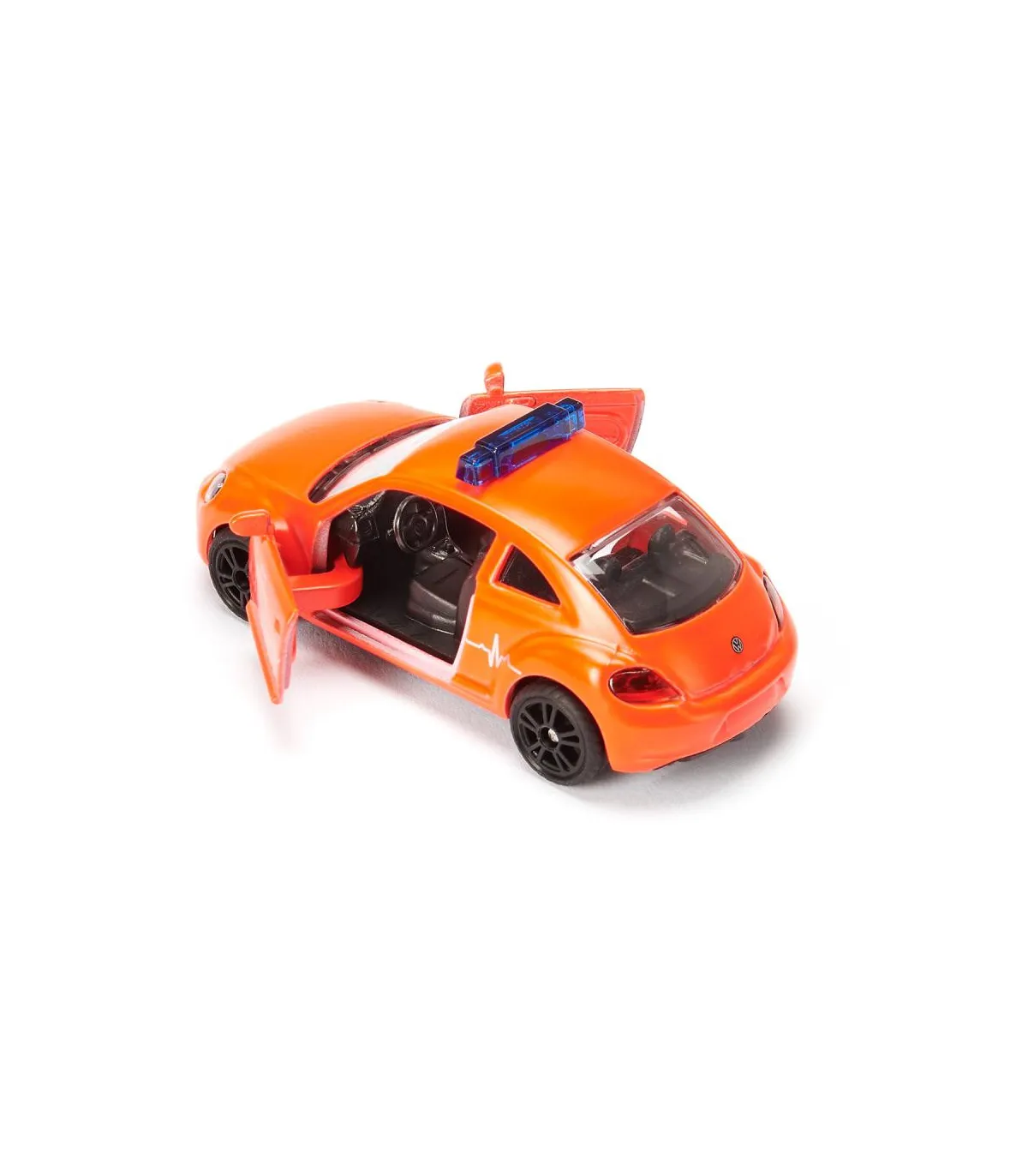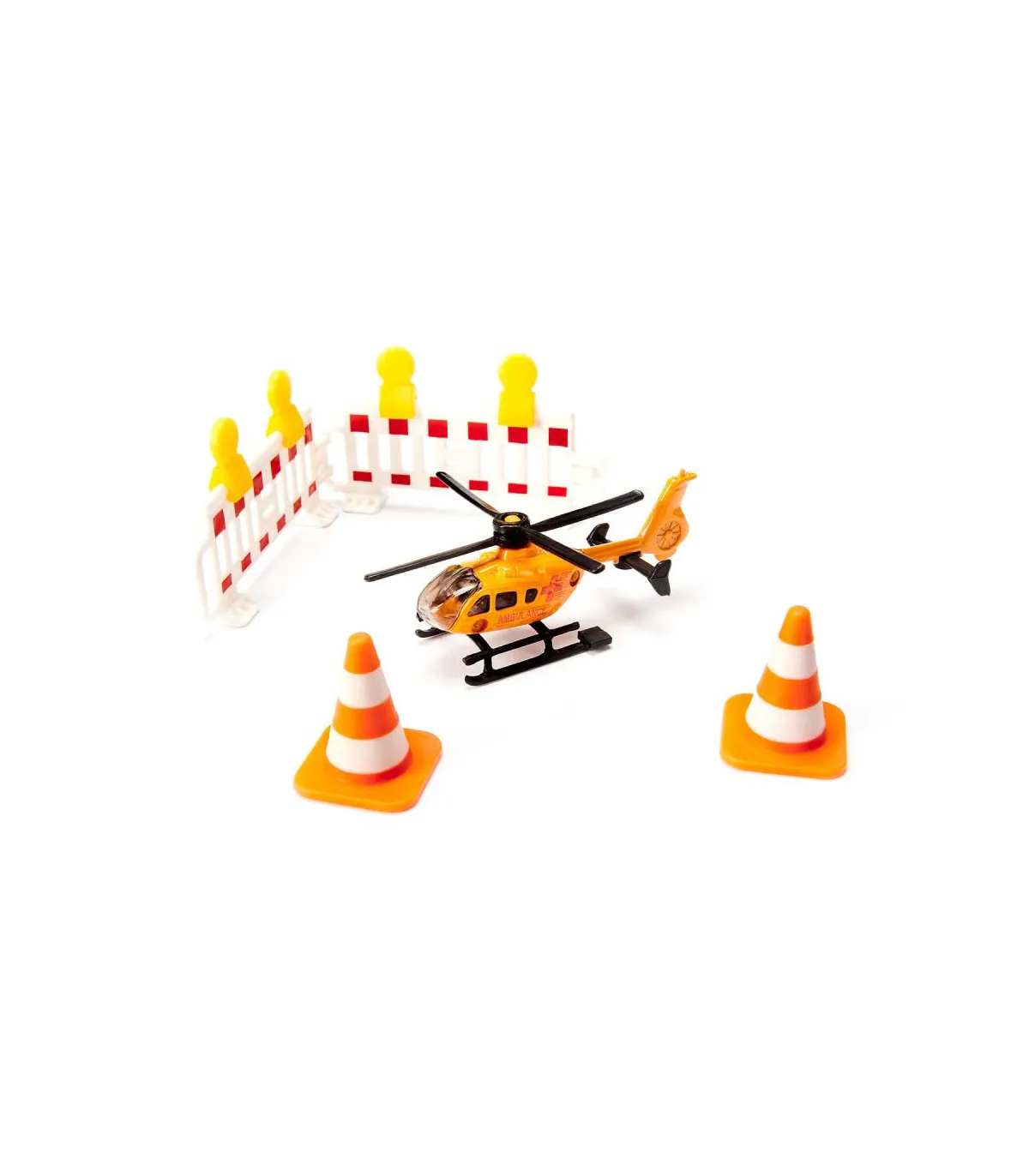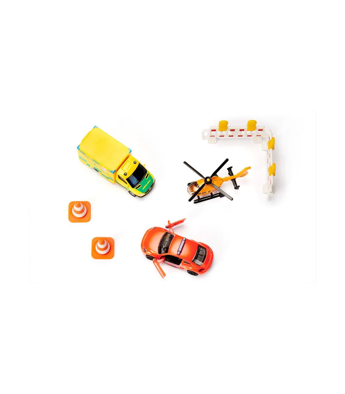 En una situación de emergencia, cada segundo cuenta. Por eso es importante que los rescatistas lleguen rápidamente al lugar. Ya sea en la carretera o desde el aire, con el set de rescate de siku la ayuda está al alcance de la mano, ¡porque los socorristas ya están en camino! El set se compone de tres modelos de vehículos y diversos accesorios. La ambulancia de emergencia es un VW Escarabajo con la inscripción internacional “Ambulance”, pintura operativa roja y barras luminosas azules en el techo. Las puertas del vehículo se pueden abrir. Una Mercedes Sprinter de color amarillo brillante con elaboradas señales multicolores y el letrero verde "Ambulance" en los costados corre en su ayuda como una ambulancia. También se utiliza un helicóptero como apoyo aéreo. Las palas de su rotor son plegables y la hélice se puede girar. Para asegurar el lugar del accidente, el set también contiene dos balizas de advertencia y dos torres de alta tensión de color blanco anaranjado.