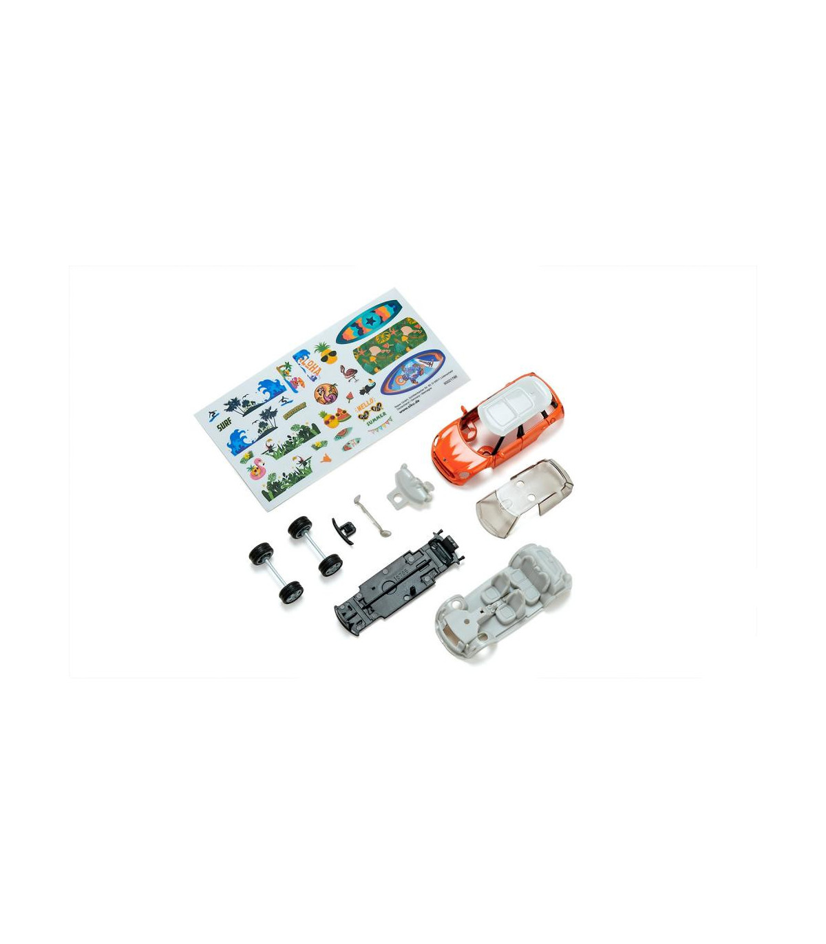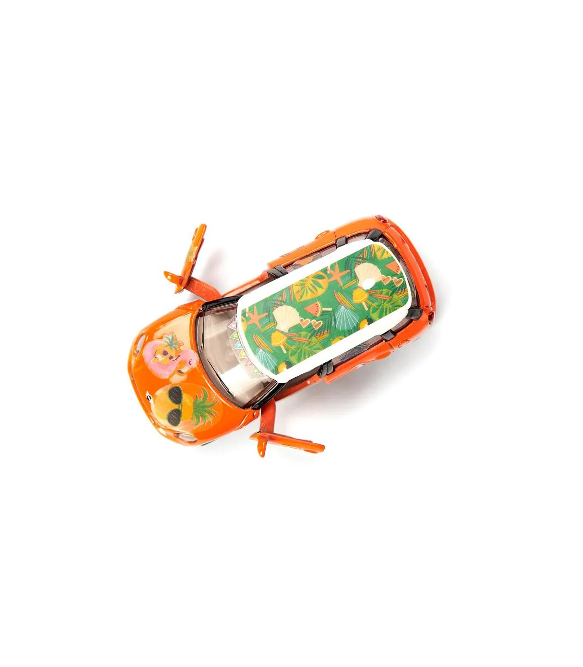 ¡Sol de verano! Cuando llega el Mini Countryman Summer, ¡inmediatamente te sientes como si estuvieras de vacaciones! Esto no se debe sólo al alegre color naranja de su cuerpo, sino sobre todo a la hoja de pegatinas incluida con muchas pegatinas de colores. Con motivos típicos del verano, como palmeras, sol, gaviotas, surfistas y salpicaduras de agua, el modelo se puede transformar en un instante en un moderno coche de vacaciones. Sin embargo, primero hay que montarlo, porque para que las manualidades sean aún más divertidas, el coche viene con una carrocería de metal, llantas deportivas y puertas que se abren en varias piezas. ¡Estos se pueden armar fácilmente y el Mini Countryman Summer está listo para un paseo a la playa!