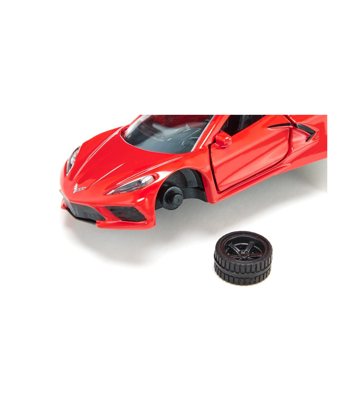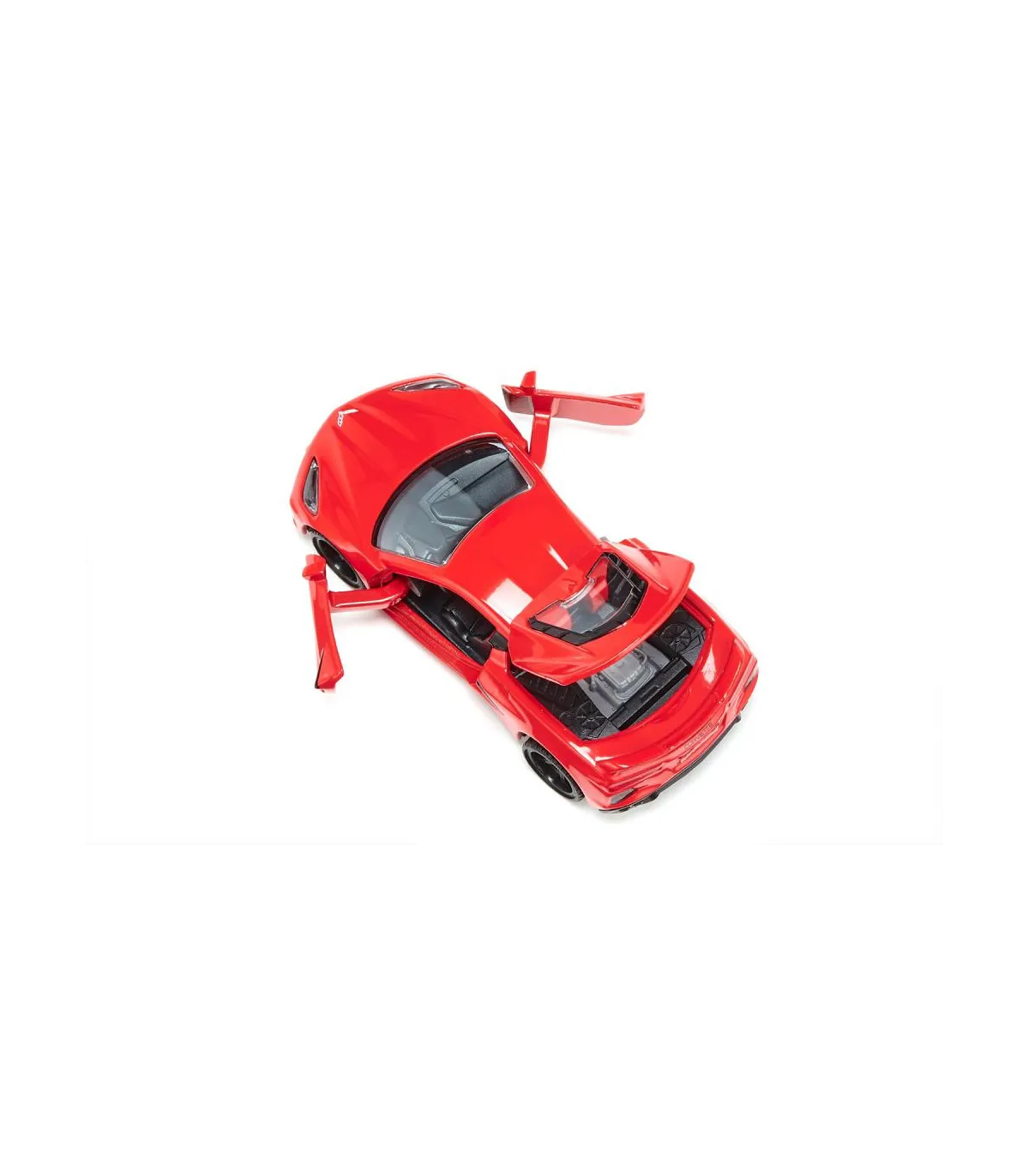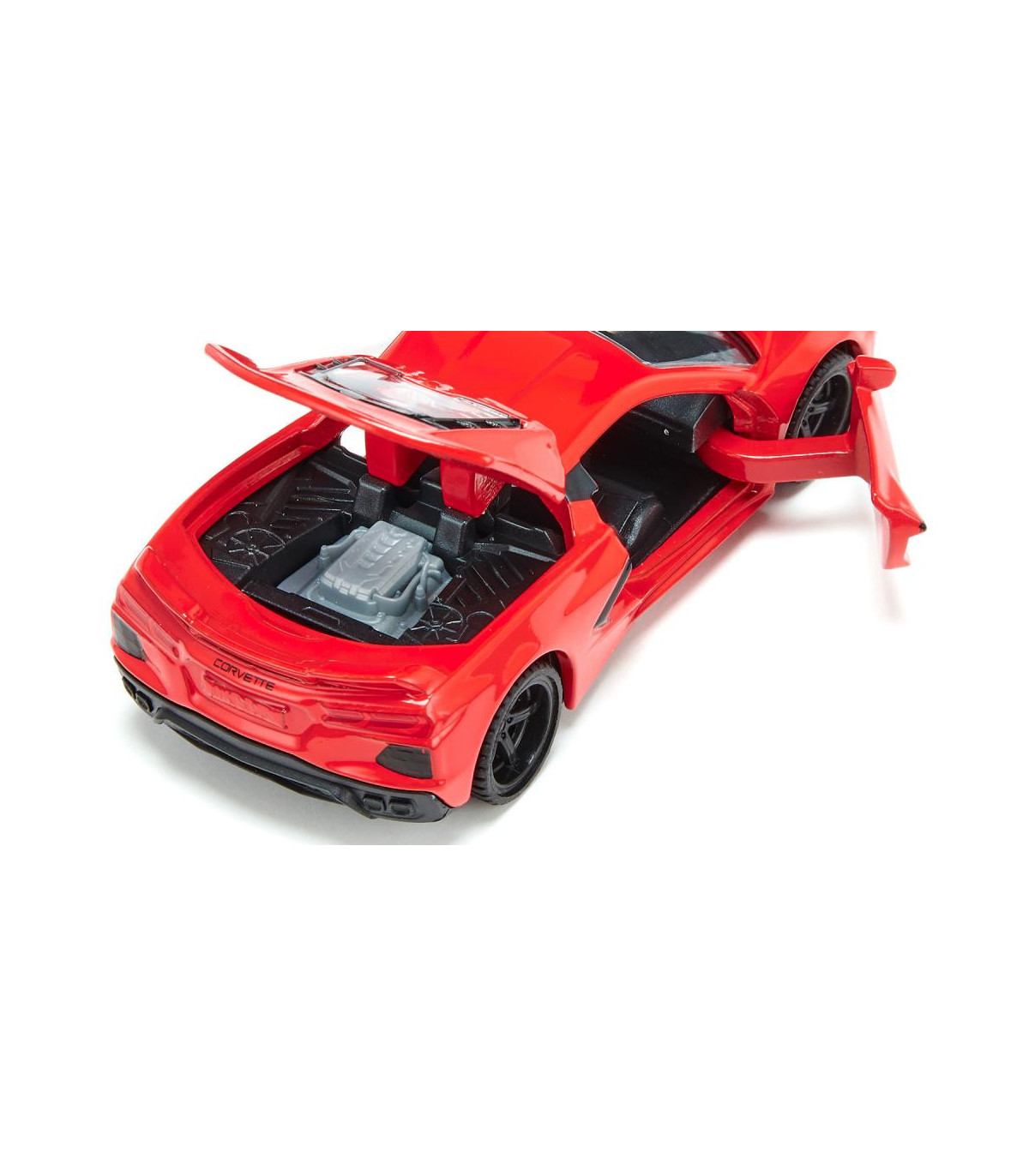 Con el modelo C8 Stingray, el ícono del auto deportivo estadounidense Corvette está creando una verdadera revolución: por primera vez en los casi 70 años de tradición del vehículo, el motor ya no está instalado en la parte delantera, sino en el centro del bastidor del vehículo. Esto baja y desplaza el centro de gravedad, un cambio que tiene un impacto directo en el comportamiento de conducción: el coupé parece significativamente más ágil. Los datos de rendimiento superiores al promedio del Corvette siempre han sido impresionantes. Con su motor V8 de casi 500 CV, puede pasar de 0 a 100 en poco menos de tres segundos, y la aguja del velocímetro sólo se detiene en la increíble cifra de 312 km/h. En el modelo siku, las puertas y el capó trasero se pueden abrir por ambos lados. Esto proporciona una visión clara del motor detallado, que se encuentra directamente detrás de los asientos. Las ruedas del vehículo son cambiables.