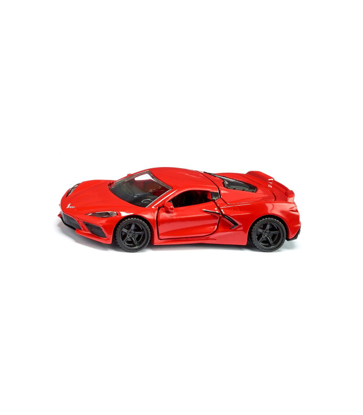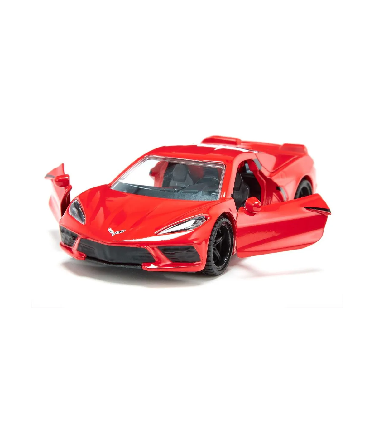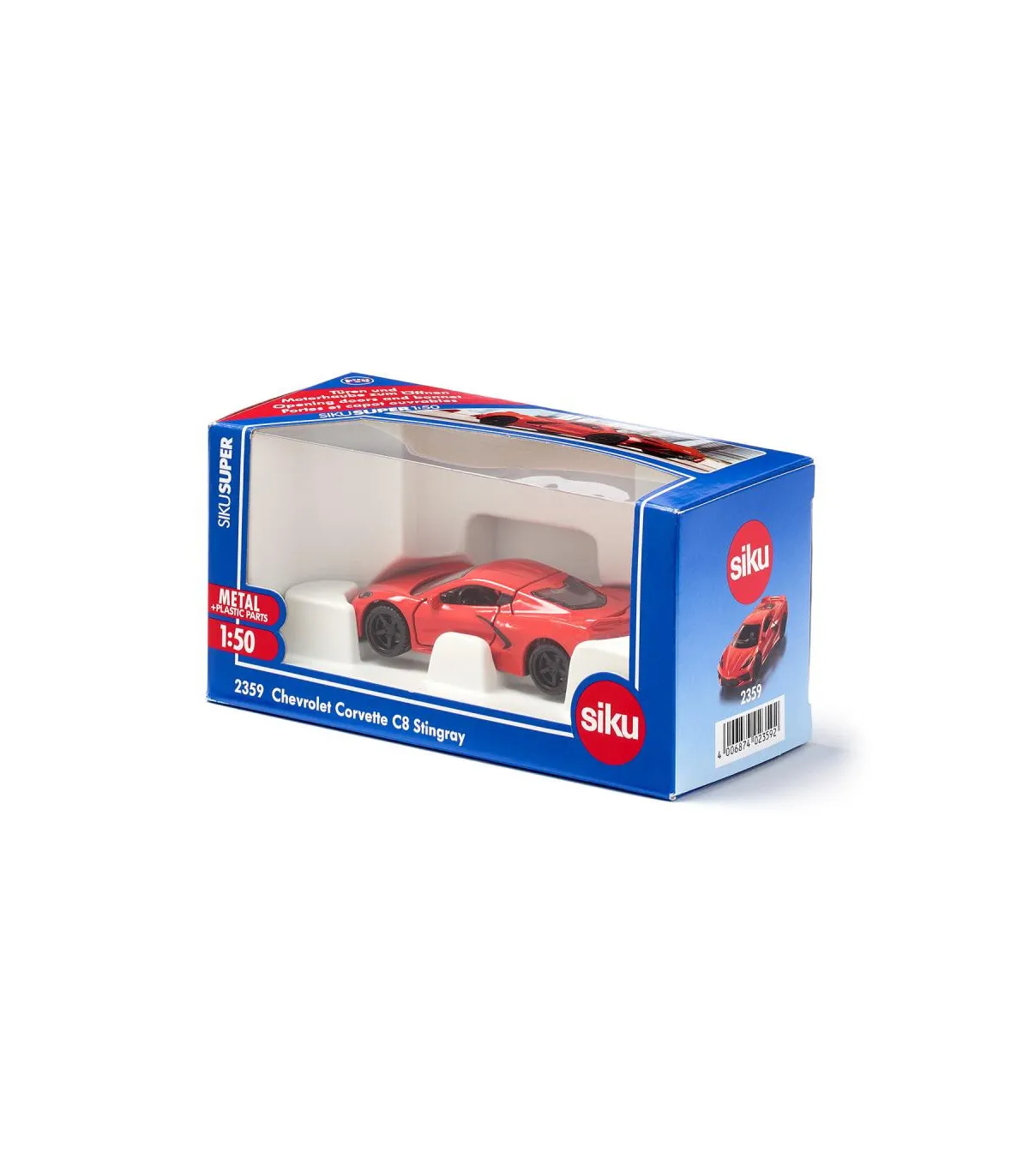Con el modelo C8 Stingray, el ícono del auto deportivo estadounidense Corvette está creando una verdadera revolución: por primera vez en los casi 70 años de tradición del vehículo, el motor ya no está instalado en la parte delantera, sino en el centro del bastidor del vehículo. Esto baja y desplaza el centro de gravedad, un cambio que tiene un impacto directo en el comportamiento de conducción: el coupé parece significativamente más ágil. Los datos de rendimiento superiores al promedio del Corvette siempre han sido impresionantes. Con su motor V8 de casi 500 CV, puede pasar de 0 a 100 en poco menos de tres segundos, y la aguja del velocímetro sólo se detiene en la increíble cifra de 312 km/h. En el modelo siku, las puertas y el capó trasero se pueden abrir por ambos lados. Esto proporciona una visión clara del motor detallado, que se encuentra directamente detrás de los asientos. Las ruedas del vehículo son cambiables.