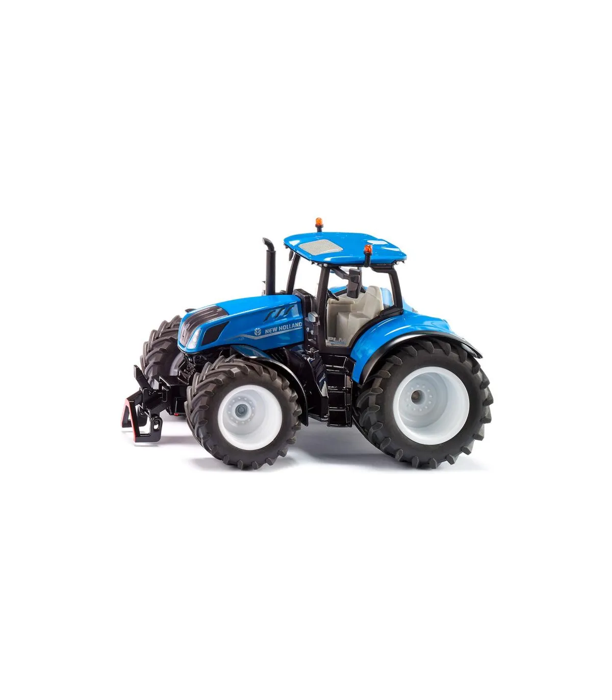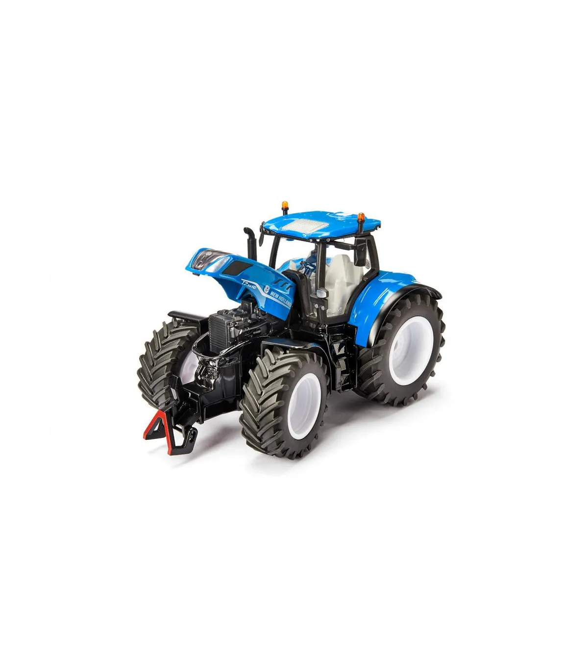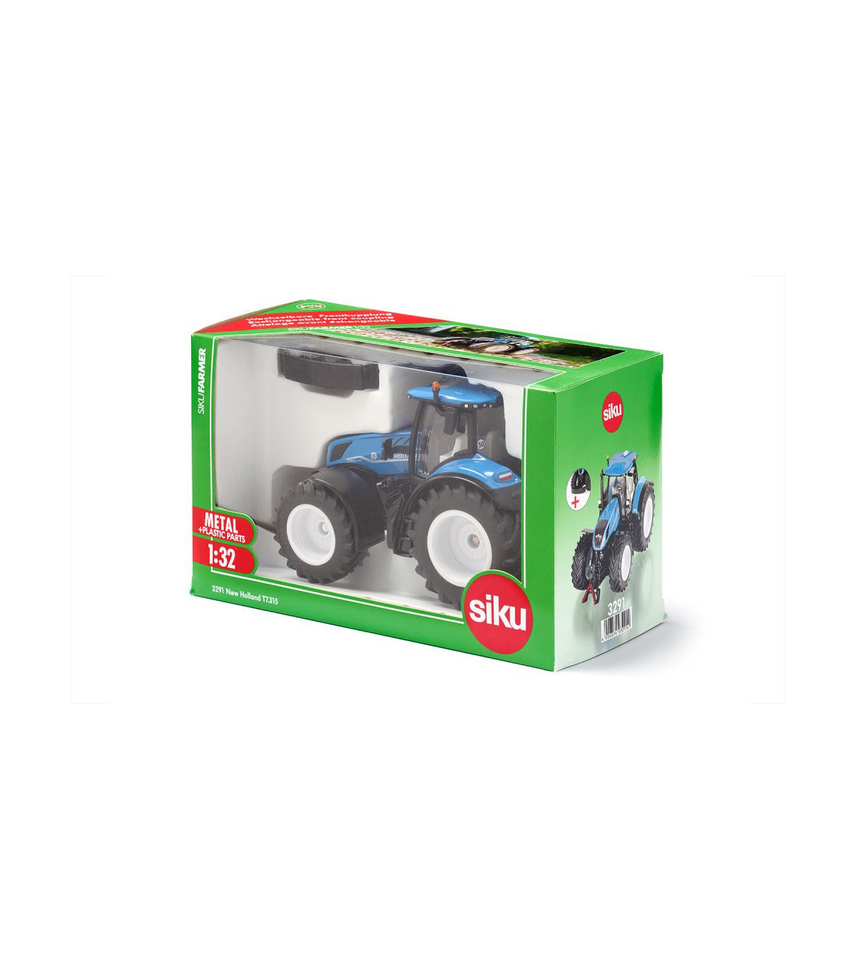 Si se quiere avanzar en la agricultura moderna, hay que ser fuerte. Y eso es exactamente lo que es el T7 Heavy Duty de New Holland. Un tractor de alta gama con más potencia y un confort de primer nivel que también tiene algo que ofrecer visualmente. El T7 Heavy Duty puede entregar hasta 315 hp para el uso de los equipos de trabajo más pesados. El modelo superior entre los tractores grandes es lo suficientemente potente para trabajos de tracción, labranza, empacado y transporte. La carrocería del modelo siku está fabricada en metal, la cabina es acristalada y desmontable. El detallado diseño también crea una auténtica sensación de tractor en el interior. El eje delantero se mueve mediante un muñón de dirección y el capó se puede abrir. El tractor New Holland tiene un acoplamiento estándar siku en la parte trasera y delantera y, por lo tanto, se puede combinar con todos los remolques y accesorios de la serie siku Farmer. Se incluye como accesorio un peso frontal que se puede intercambiar con el enganche frontal mediante un sencillo mecanismo. No importa lo que se necesite, ¡el T7 Heavy Duty lo hará de manera confiable!