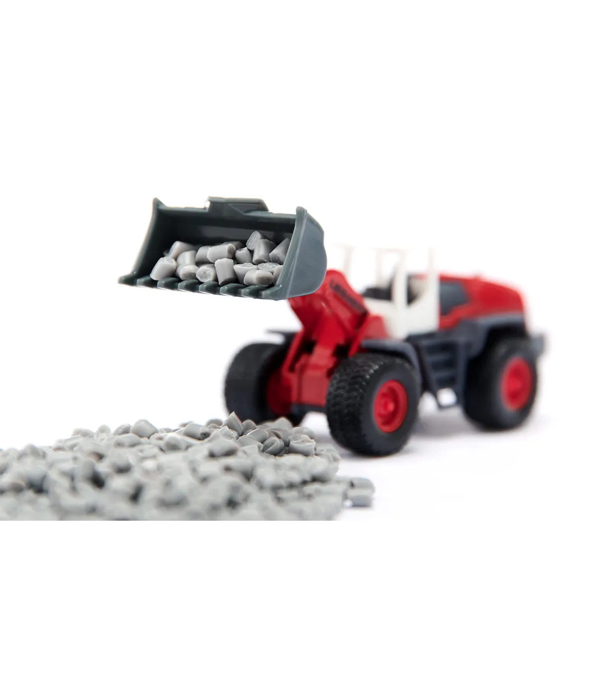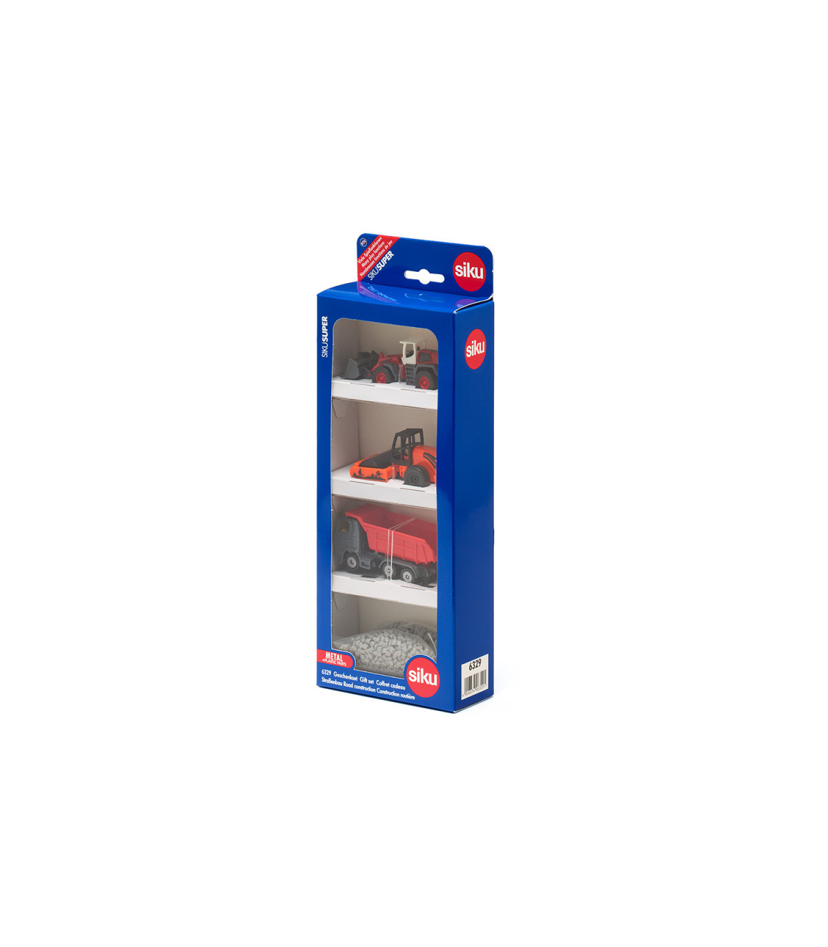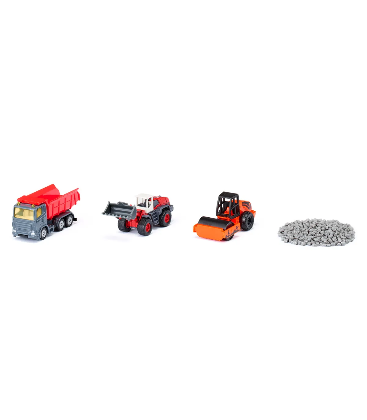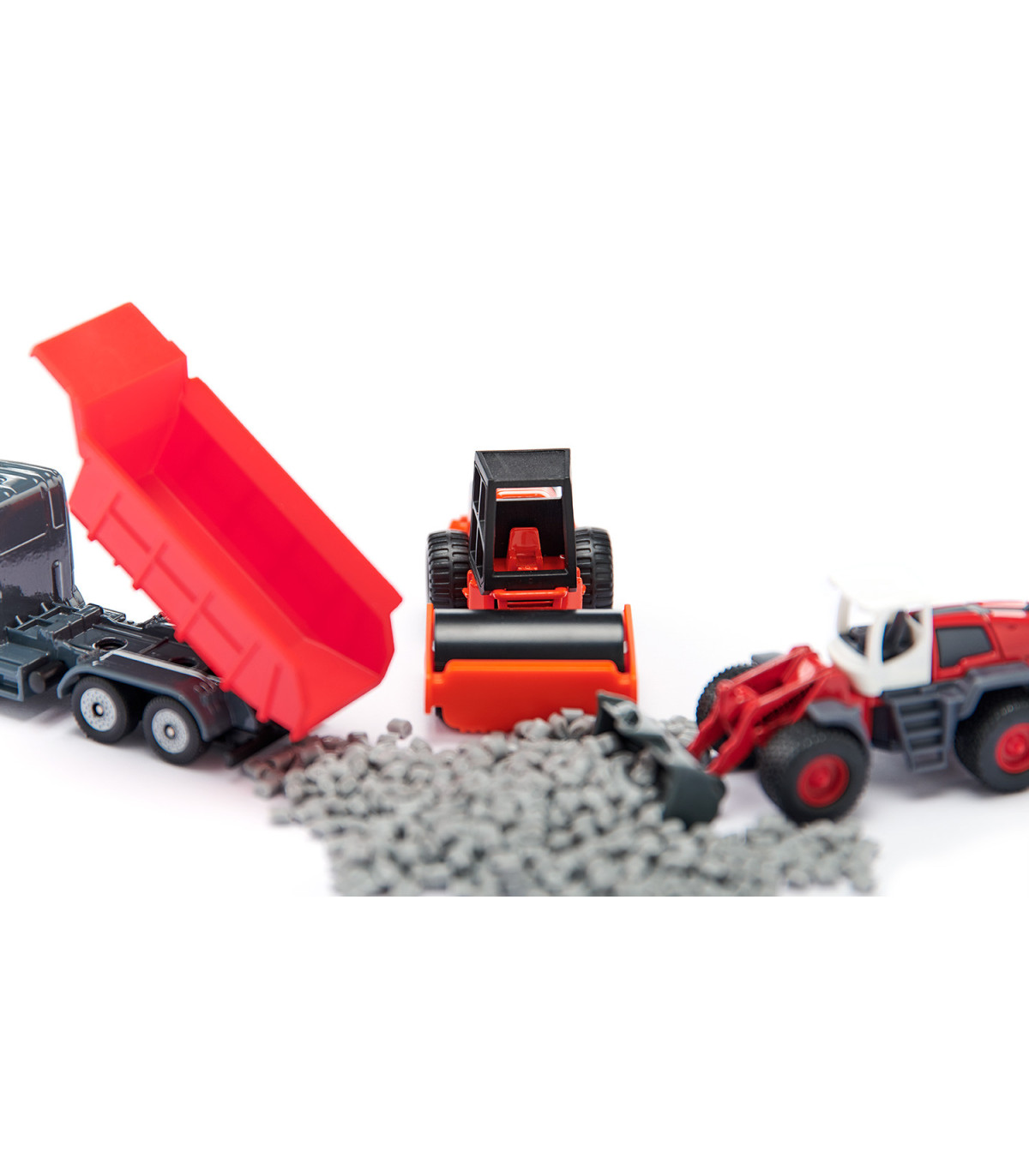¡Peligro! ¡Sitio de construcción por delante! Con este set de construcción de carreteras nada se interpone en el camino para renovar la carretera de juego, porque el set incluye todos los vehículos necesarios para un uso exitoso en la obra. El camión volquete gris transporta fácilmente materiales de construcción hacia y desde ellos y tiene una cubeta basculante. La cargadora sobre ruedas de Liebherr con brazo de carga móvil y pala carga cómodamente escombros o materiales de construcción y avanza con sus neumáticos de goma siempre exactamente donde más se necesita. La apisonadora garantiza que todos los materiales se apliquen con precisión. Gracias a un rodillo giratorio y a su resistente cuerpo metálico, esto se hace muy rápido. El juego también incluye un granulado gris que se puede cargar idealmente en el camión volquete con una pala cargadora. En combinación, estos vehículos de obra son imprescindibles para cualquiera que no pueda prescindir de una obra en su flota. Porque una cosa está clara: donde hay muchos coches siku en la carretera, ¡siempre hay algo que hacer para el equipo de construcción de carreteras!