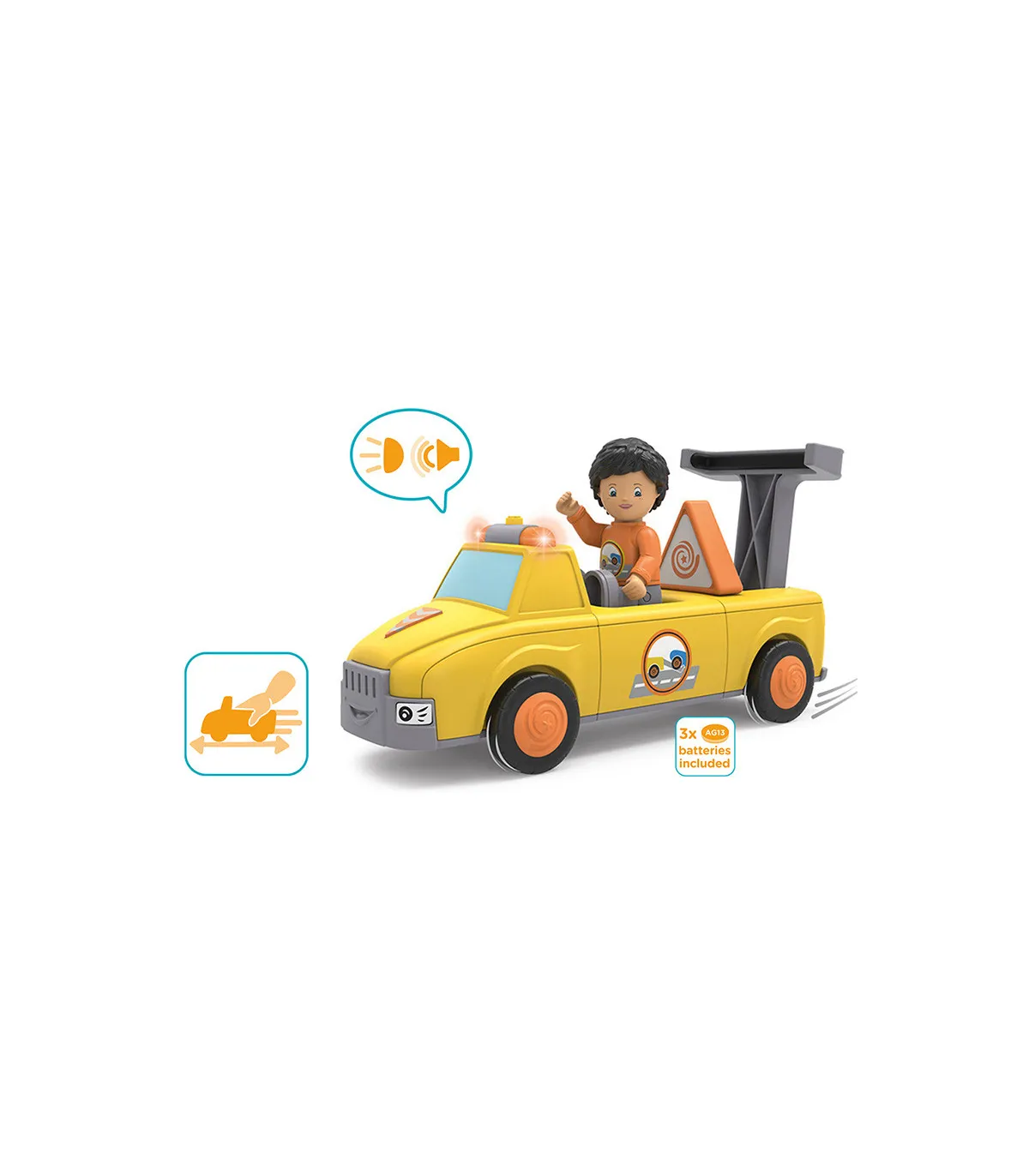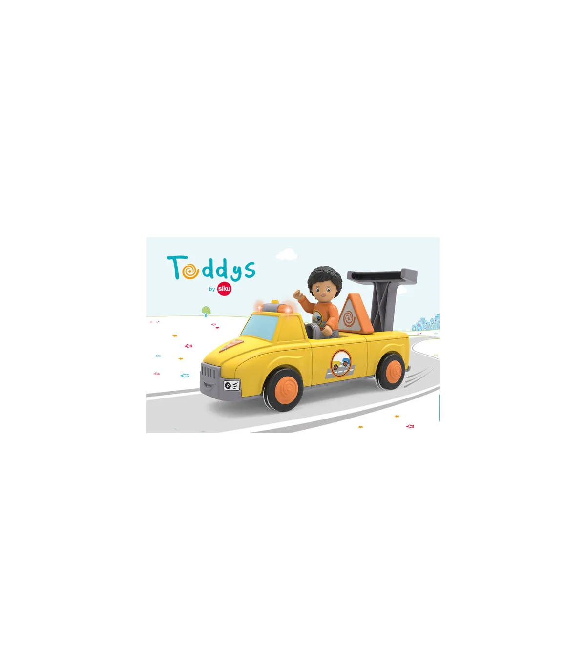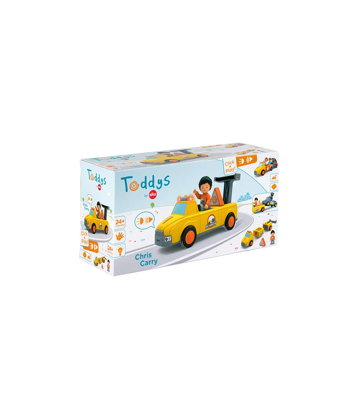 Chris y Carry están rápidamente en el lugar si Oldy se detiene o si otro equipo de Toddy tiene una avería. El equipo de remolque de color amarillo brillante es visible desde lejos. Ambos están bien equipados y son incansables en sus esfuerzos por recoger a sus amigos dondequiera que estén. Chris y Carry llegan con fuertes gritos y la luz amarilla parpadeando. En el lugar, Chris primero protege el punto de peligro con su triángulo de advertencia muy prominente. Pregunta qué ha pasado e inspecciona de cerca el vehículo. Si Chris no puede reparar el daño en el acto, pliega el súper soporte de remolque de Carry y fija de forma segura el coche averiado detrás de él. Ahora sólo tiene que recoger rápidamente su triángulo de advertencia y volver a insertarlo. Y luego se pasa al siguiente taller para que el coche vuelva a estar en condiciones. Emocionante juguete de primera calidad para niños a partir de 24 meses, con motor de fricción (motor volante) para fomentar la motricidad fina, la constancia, la paciencia y la diversión. El muñeco de Chris tiene partes móviles: la cabeza se puede girar, los brazos se pueden levantar y las piernas se pueden doblar. El vehículo Carry se puede dividir en tres partes y combinar con otros vehículos Toddys. Efectos de luz y sonido para apoyar las características del vehículo. El dispositivo de remolque abatible y el triángulo extraíble también estimulan la experiencia de juego. Chris Carry es compatible con componentes de otros fabricantes. Sistema siku “Click&Play”: Fácil de combinar gracias al sistema de giro y empuje de las piezas del vehículo