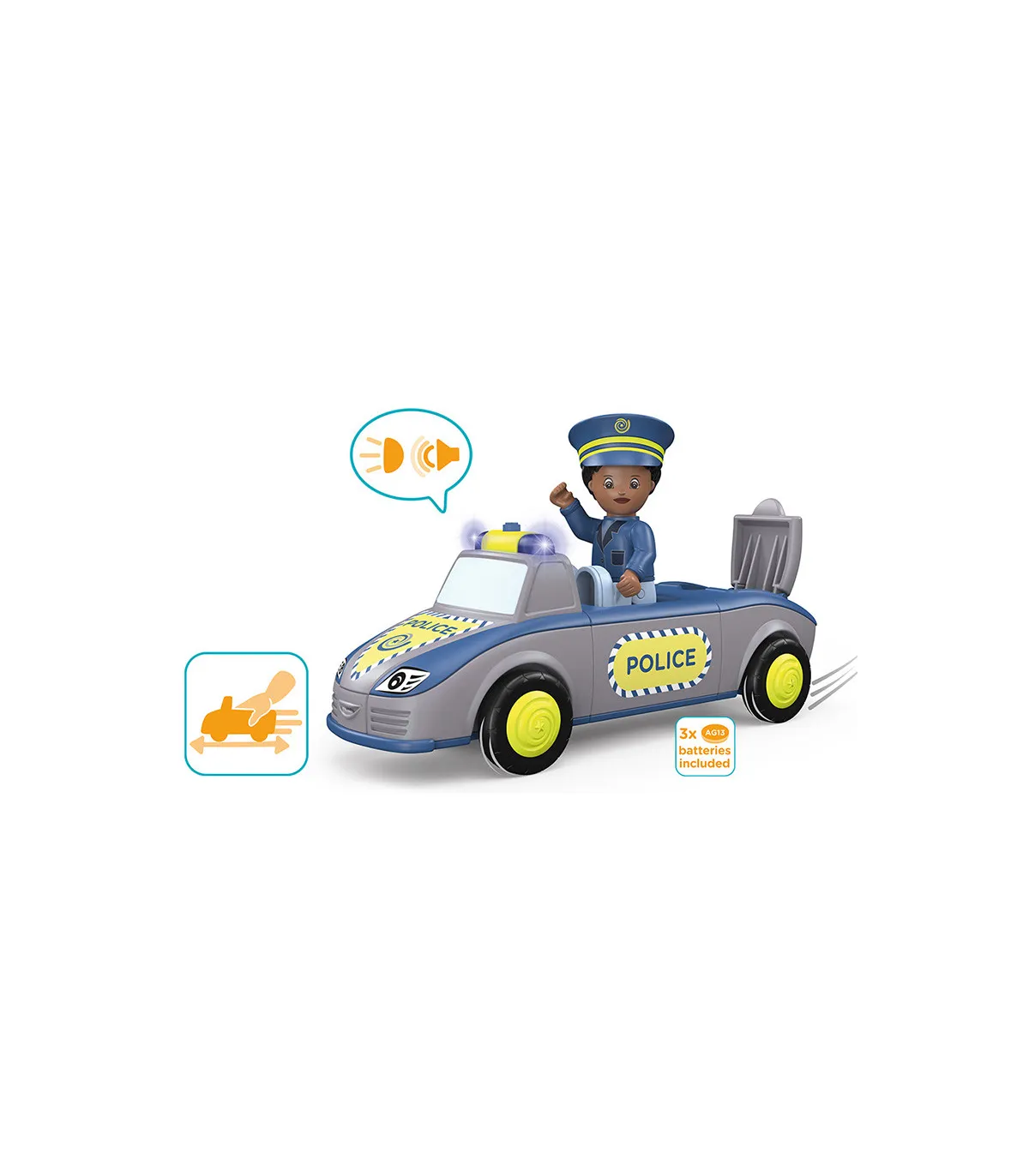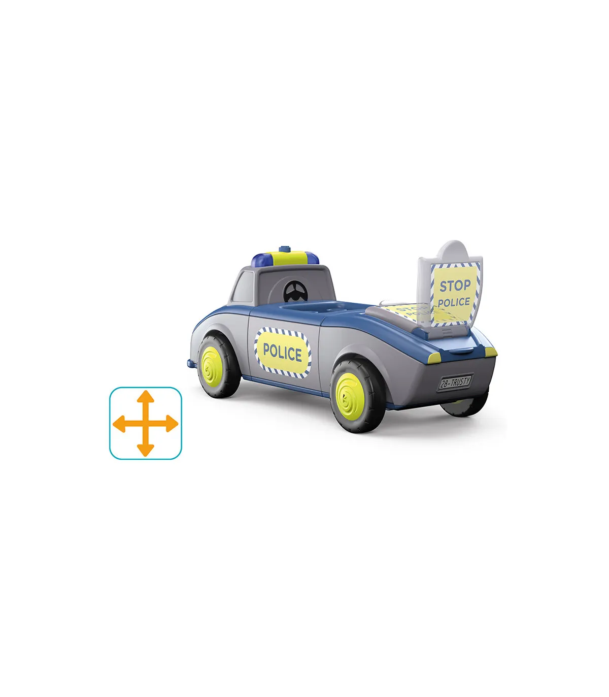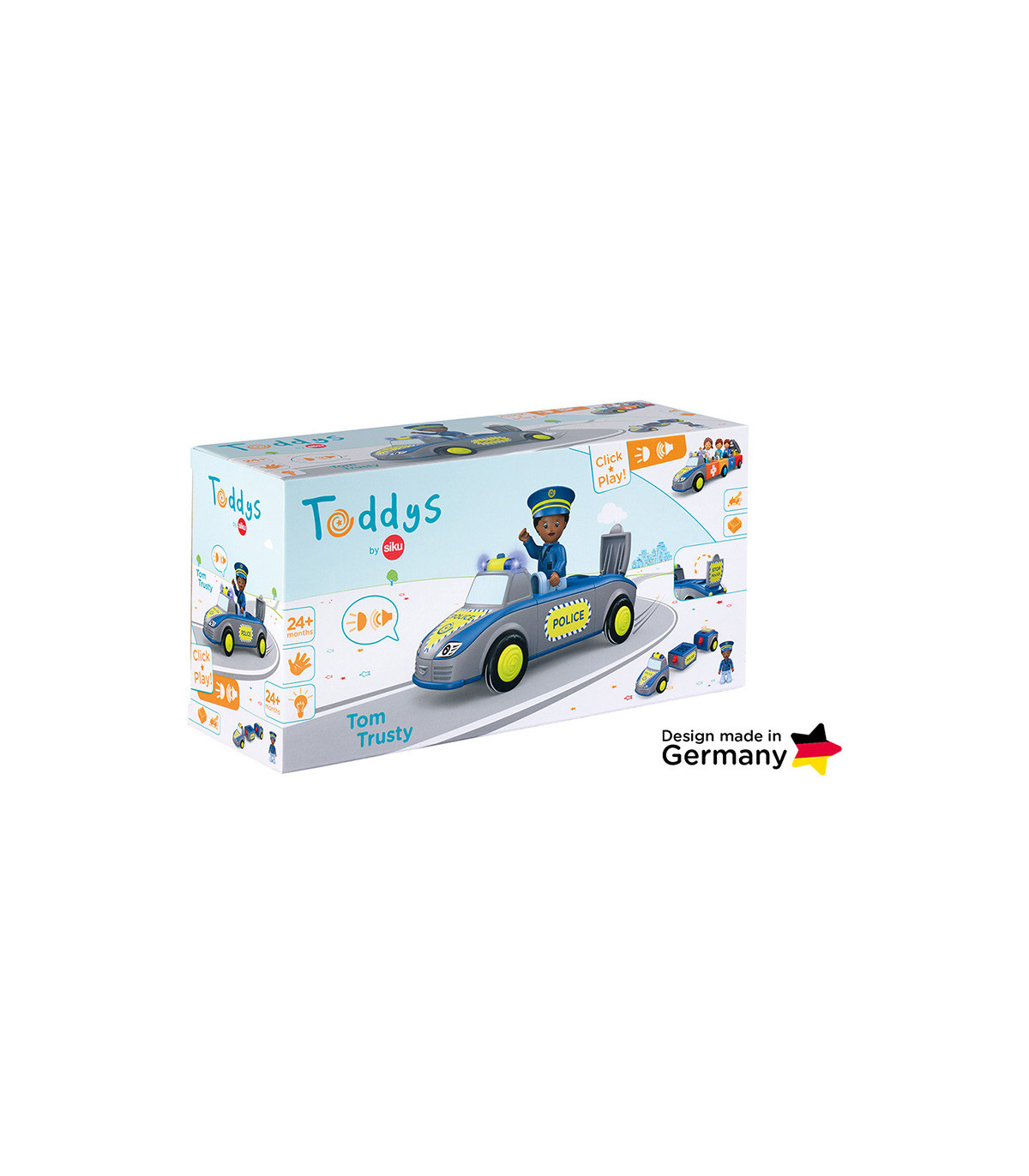 Alto – ¡¡¡Policía!!! Tom y Trusty garantizan el orden y ayudan siempre que pueden. Incluso para los Toddy es necesario hacer cumplir la ley, por lo que los dos suelen estar fuera de casa. Si hay un atasco, las veloces luces azules y las sirenas del equipo policial despejan la carretera. Atraviesan el campo y siempre llegan rápidamente al lugar. Pero su trabajo no siempre implica una emergencia. A veces está tranquilo, y Trusty asegura una calle usando su señal de alto, mientras Tom detiene los autos desde la otra dirección, para acompañar a una feliz mamá pato y sus patitos a través de la calle de manera segura. La pareja ciertamente nunca tiene tiempo para aburrirse y están encantados cada vez que pueden ayudar a sus amigos. Emocionante juguete de primera calidad para niños a partir de 24 meses, con motor de fricción (motor volante) para fomentar la motricidad fina, la constancia, la paciencia y la diversión. El muñeco de Tom tiene partes móviles: la cabeza se puede girar, los brazos se pueden levantar y las piernas se pueden doblar. El vehículo Trusty se puede dividir en tres partes y combinar con otros vehículos Toddys. Efectos de luz y sonido para apoyar las características del vehículo. El cartel plegable "STOP POLICÍA" también estimula la experiencia de juego. Tom Trusty es compatible con componentes de otros fabricantes. Sistema siku “Click&Play”: Fácil de combinar gracias al sistema de giro y empuje de las piezas del vehículo