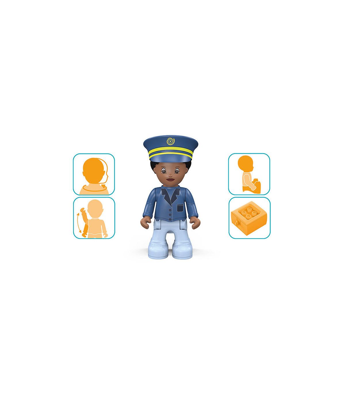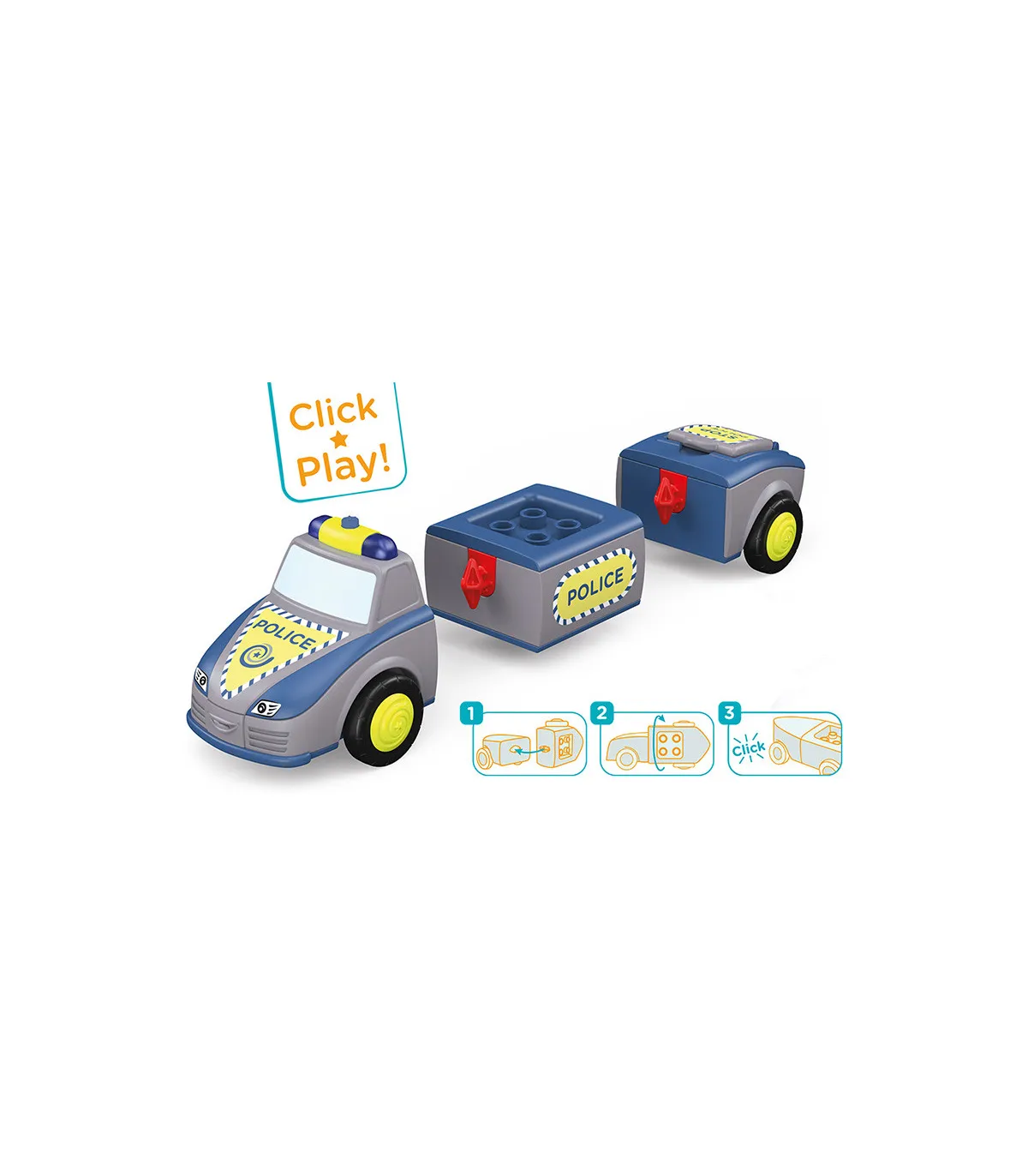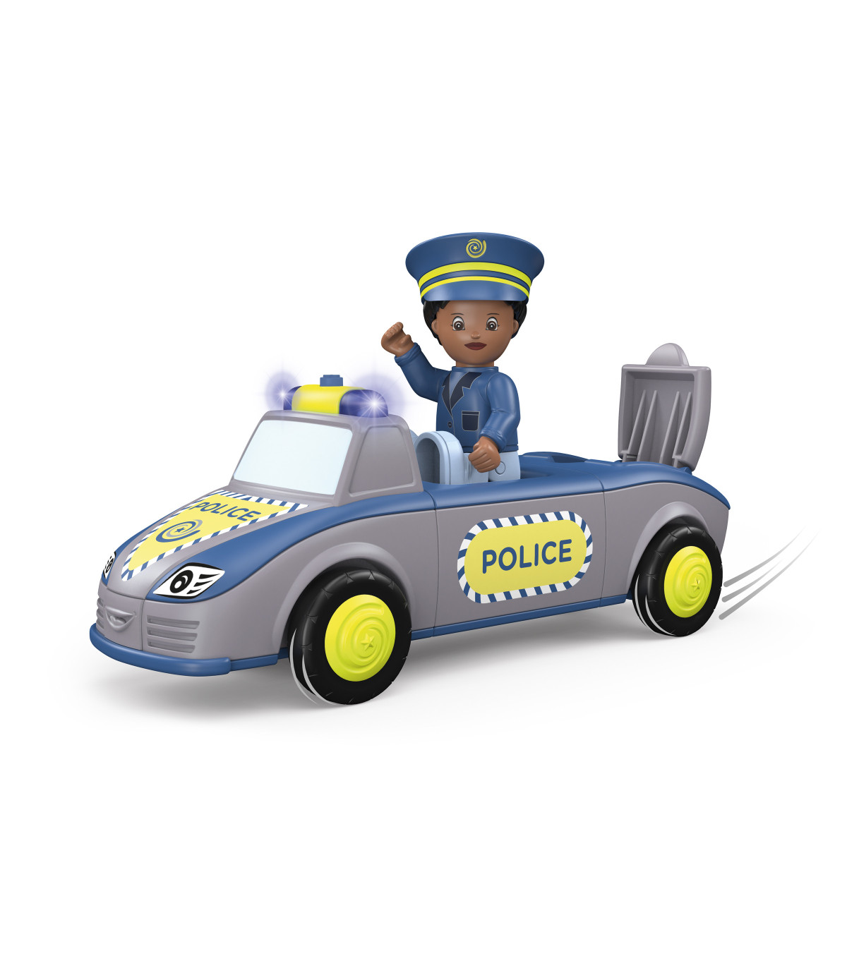 Alto – ¡¡¡Policía!!! Tom y Trusty garantizan el orden y ayudan siempre que pueden. Incluso para los Toddy es necesario hacer cumplir la ley, por lo que los dos suelen estar fuera de casa. Si hay un atasco, las veloces luces azules y las sirenas del equipo policial despejan la carretera. Atraviesan el campo y siempre llegan rápidamente al lugar. Pero su trabajo no siempre implica una emergencia. A veces está tranquilo, y Trusty asegura una calle usando su señal de alto, mientras Tom detiene los autos desde la otra dirección, para acompañar a una feliz mamá pato y sus patitos a través de la calle de manera segura. La pareja ciertamente nunca tiene tiempo para aburrirse y están encantados cada vez que pueden ayudar a sus amigos. Emocionante juguete de primera calidad para niños a partir de 24 meses, con motor de fricción (motor volante) para fomentar la motricidad fina, la constancia, la paciencia y la diversión. El muñeco de Tom tiene partes móviles: la cabeza se puede girar, los brazos se pueden levantar y las piernas se pueden doblar. El vehículo Trusty se puede dividir en tres partes y combinar con otros vehículos Toddys. Efectos de luz y sonido para apoyar las características del vehículo. El cartel plegable "STOP POLICÍA" también estimula la experiencia de juego. Tom Trusty es compatible con componentes de otros fabricantes. Sistema siku “Click&Play”: Fácil de combinar gracias al sistema de giro y empuje de las piezas del vehículo
