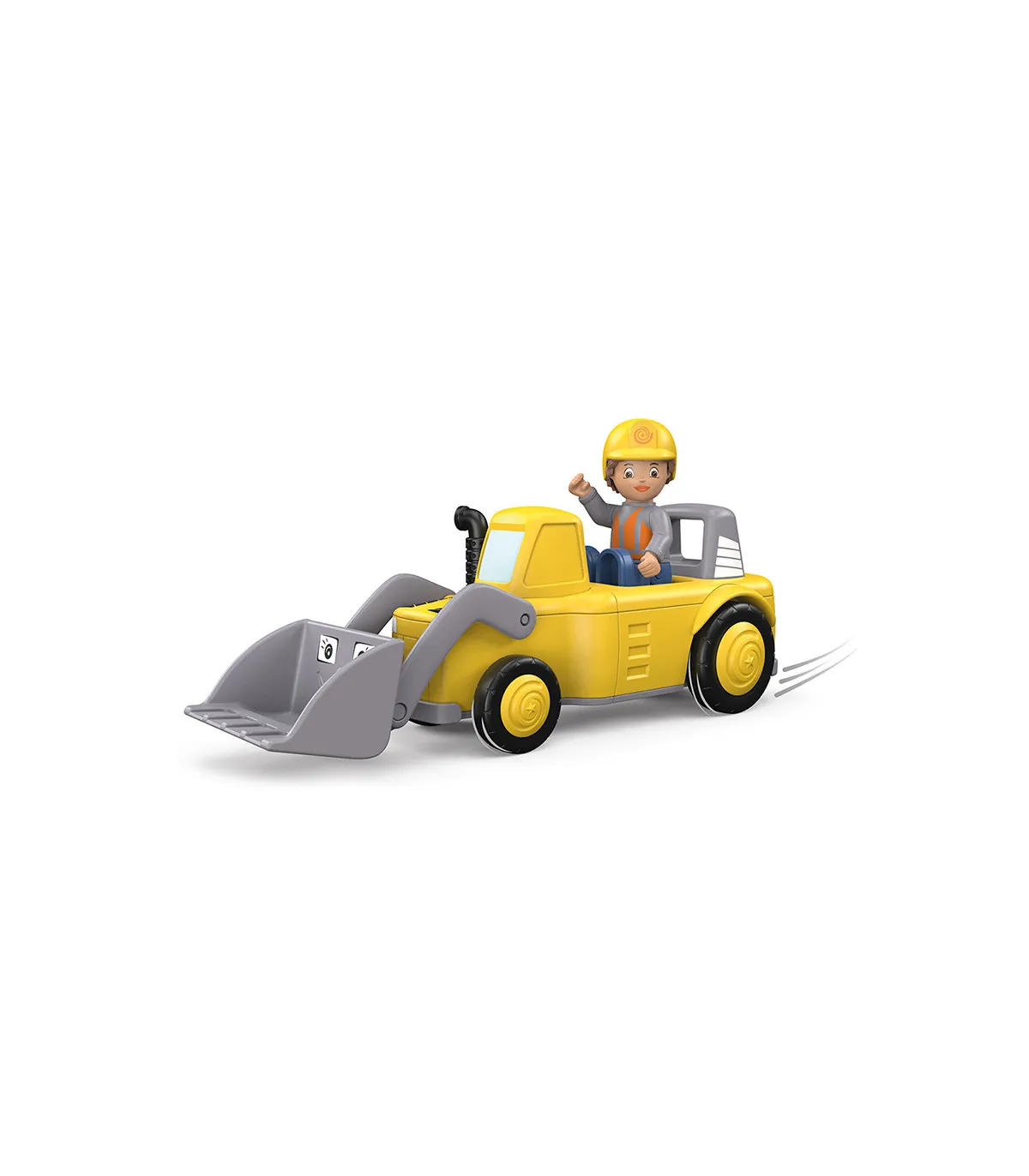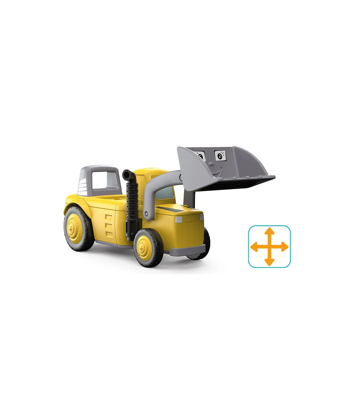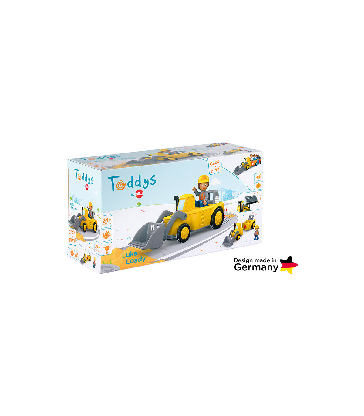 Luke y Loady, el cargador de ruedas amarillo, forman un equipo realmente fuerte. Su lema es: “¡Sigamos atrapados! ¡Ponte el casco y nos vamos! Los dos no tienen ningún problema para enfrentarse a un enorme montón de piedras o arena. Están felices cuando todos sus amigos en el mundo de Toddys pueden viajar con seguridad y no hay baches que puedan causar accidentes. Luke se arremanga y le echa una mano a Loady siempre que puede. Hay un agujero en el camino, así que Loady lo llena con arena y grava usando su súper pala para repararlo. Luke salta detrás de los controles y los dos pasan varias veces sobre el agujero lleno para compactarlo. ¡Brillante! El agujero ya ha sido llenado y los dos inspeccionan con orgullo su trabajo. Y ahora vamos a la siguiente obra. Emocionante juguete de primera calidad para niños a partir de 24 meses, con motor de fricción (motor volante) para fomentar la motricidad fina, la constancia, la paciencia y la diversión. El muñeco de Luke tiene partes móviles: la cabeza se puede girar, los brazos se pueden levantar y las piernas se pueden doblar. El vehículo Loady se puede dividir en dos partes y combinar con otros vehículos Toddys. La pala móvil y el enganche del remolque también estimulan la experiencia de juego. Luke Loady es compatible con componentes de otros fabricantes. Sistema siku “Click&Play”: Fácil de combinar gracias al sistema de giro y empuje de las piezas del vehículo