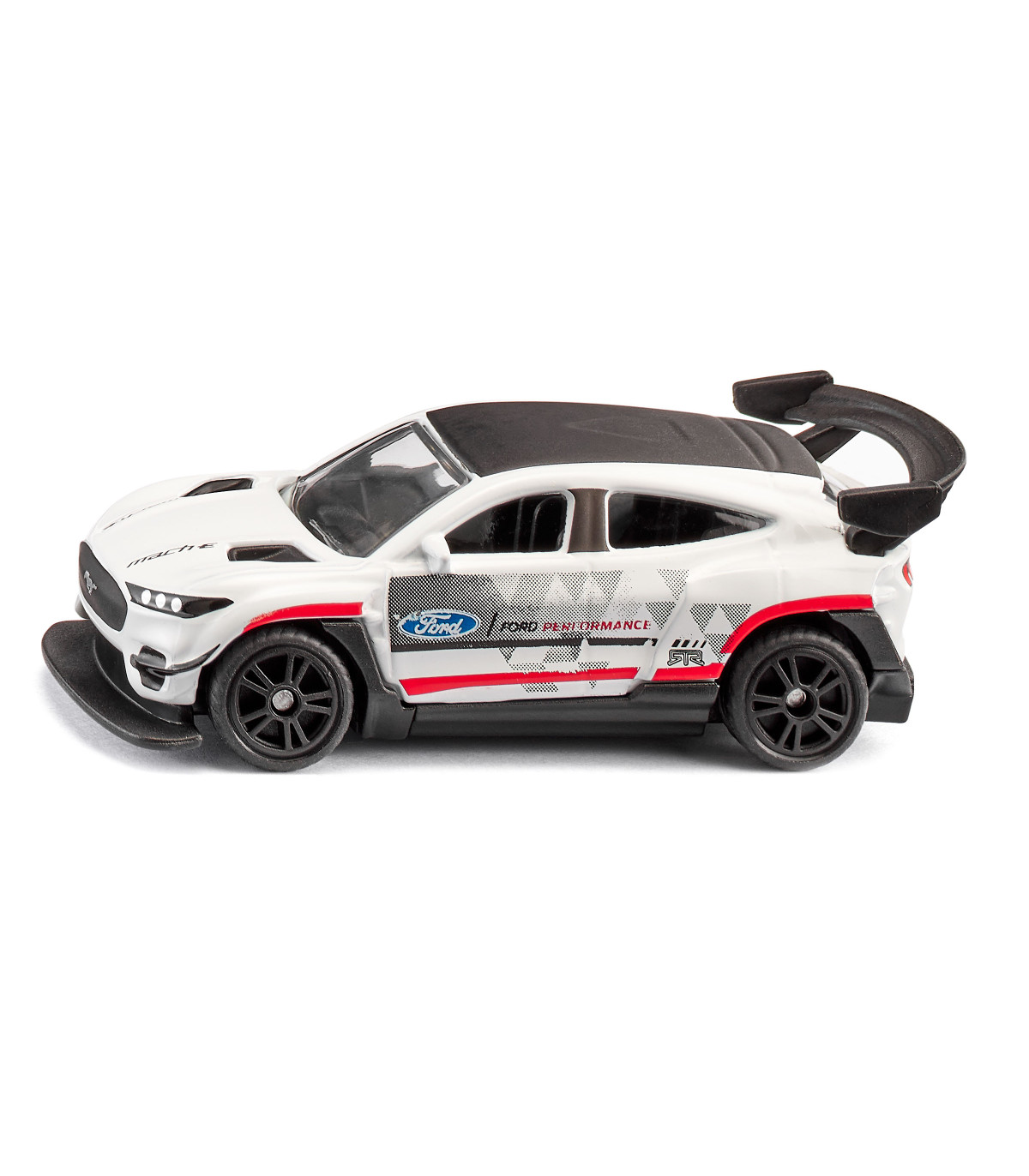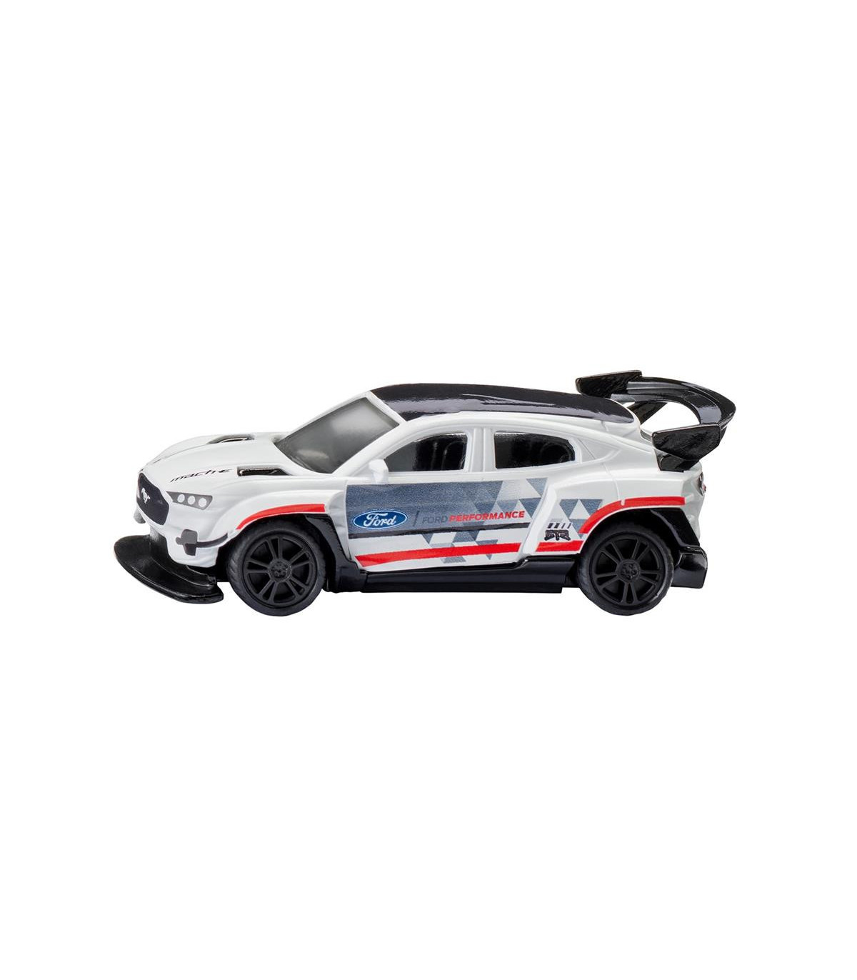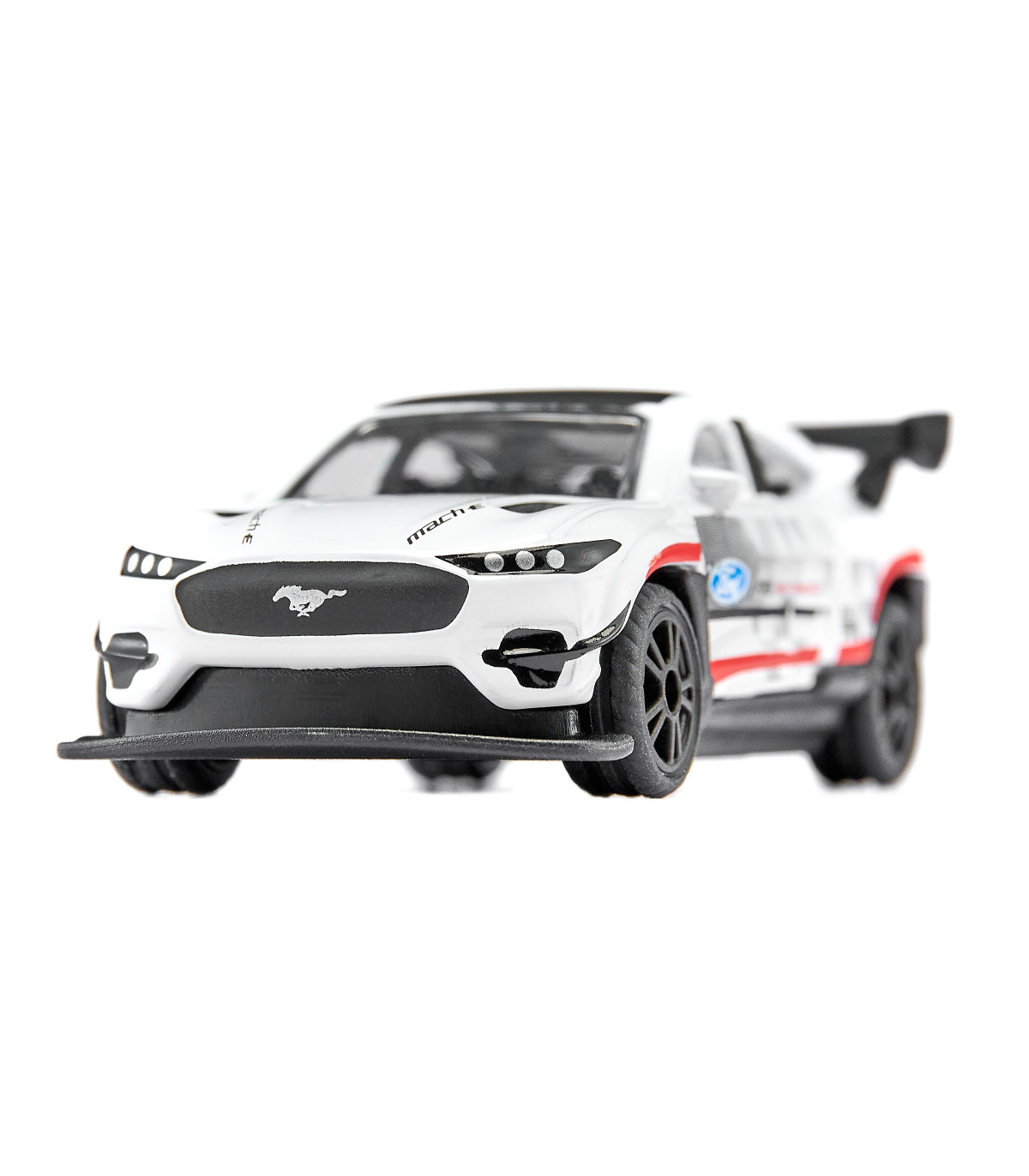 Damas y caballeros, están ante una obra maestra absoluta de la evolución automovilística: el Ford Mustang Mach-E 1400. ¡Es difícil creer que este elegante coche de carreras con un enorme alerón trasero y sus impresionantes 1.500 CV bajo el capó sea un vehículo eléctrico! 3, 2, 1, ¡VAMOS! El E-Mustang dispara sin esfuerzo a máxima velocidad y ha dejado atrás a la competencia en poco tiempo. Las llantas deportivas con neumáticos de goma ofrecen un agarre óptimo incluso en curvas cerradas. La carrocería metálica del coche de carreras también impresiona por su fantástico diseño de carreras y su elaborada impresión: blanco brillante con detalles multicolores y logotipos, además de las bestiales llantas negras... Un sueño para todos los fans del legendario americano. . La imagen detallada del coche de carreras original es, por cierto, una pieza única.