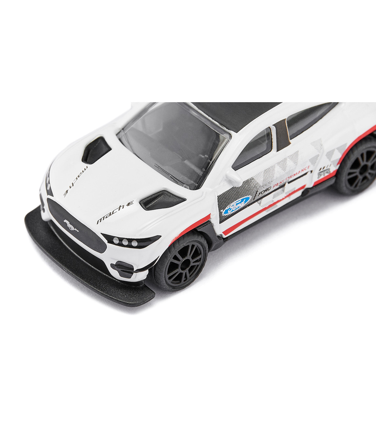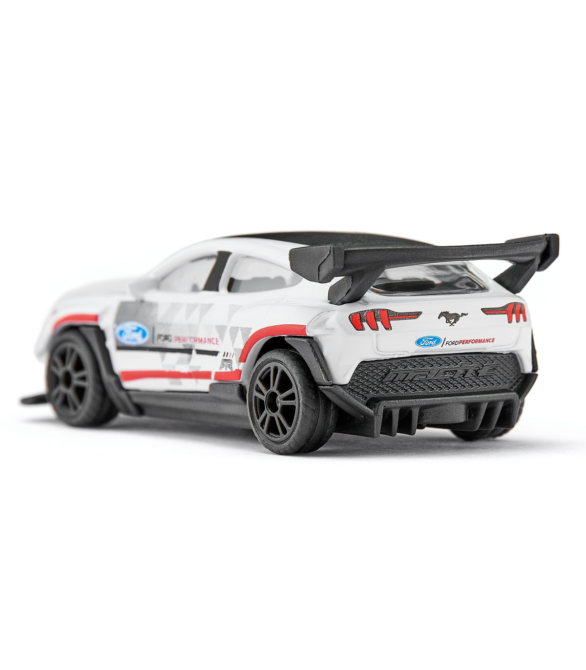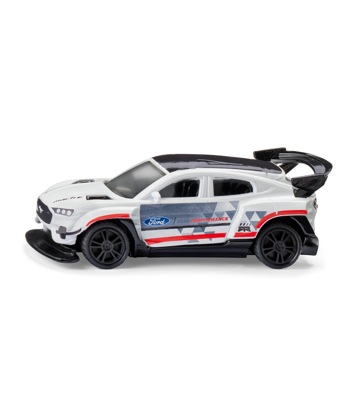 Damas y caballeros, están ante una obra maestra absoluta de la evolución automovilística: el Ford Mustang Mach-E 1400. ¡Es difícil creer que este elegante coche de carreras con un enorme alerón trasero y sus impresionantes 1.500 CV bajo el capó sea un vehículo eléctrico! 3, 2, 1, ¡VAMOS! El E-Mustang dispara sin esfuerzo a máxima velocidad y ha dejado atrás a la competencia en poco tiempo. Las llantas deportivas con neumáticos de goma ofrecen un agarre óptimo incluso en curvas cerradas. La carrocería metálica del coche de carreras también impresiona por su fantástico diseño de carreras y su elaborada impresión: blanco brillante con detalles multicolores y logotipos, además de las bestiales llantas negras... Un sueño para todos los fans del legendario americano. . La imagen detallada del coche de carreras original es, por cierto, una pieza única.
