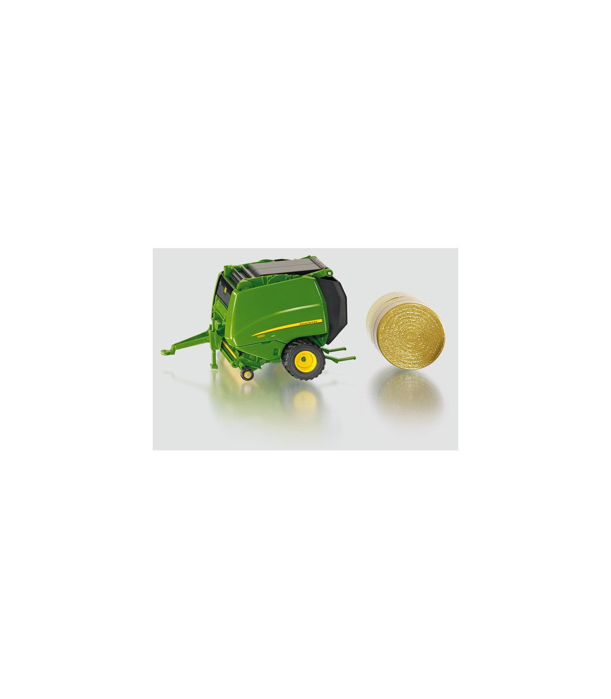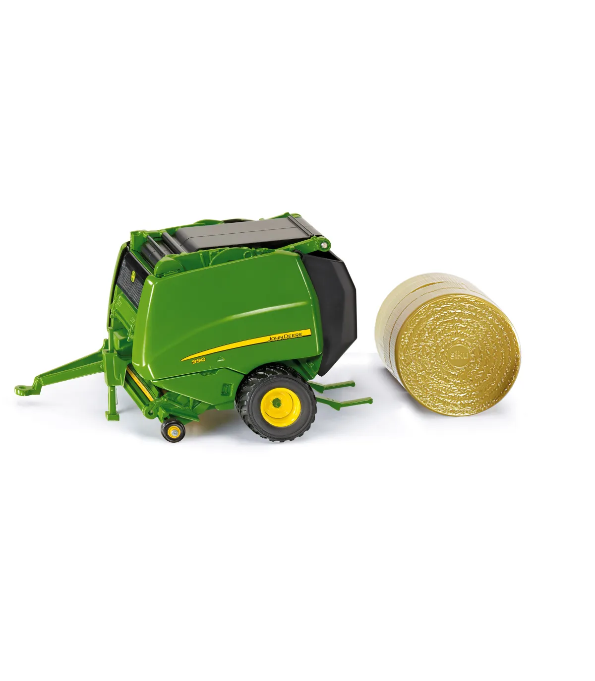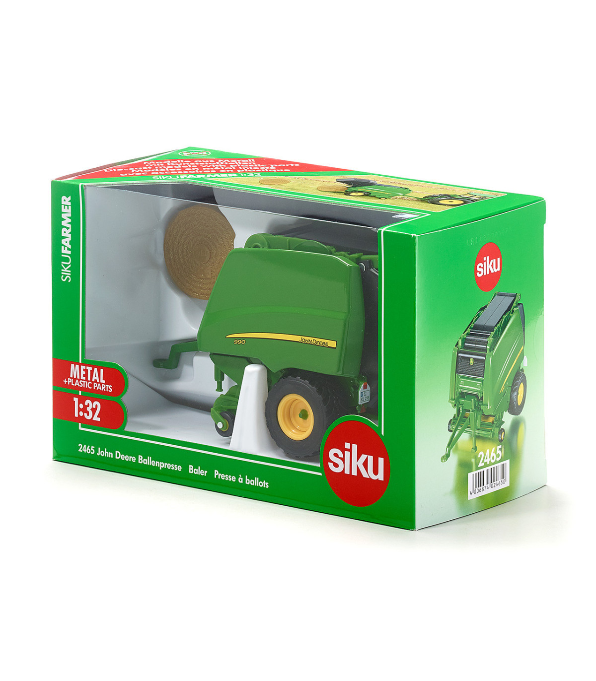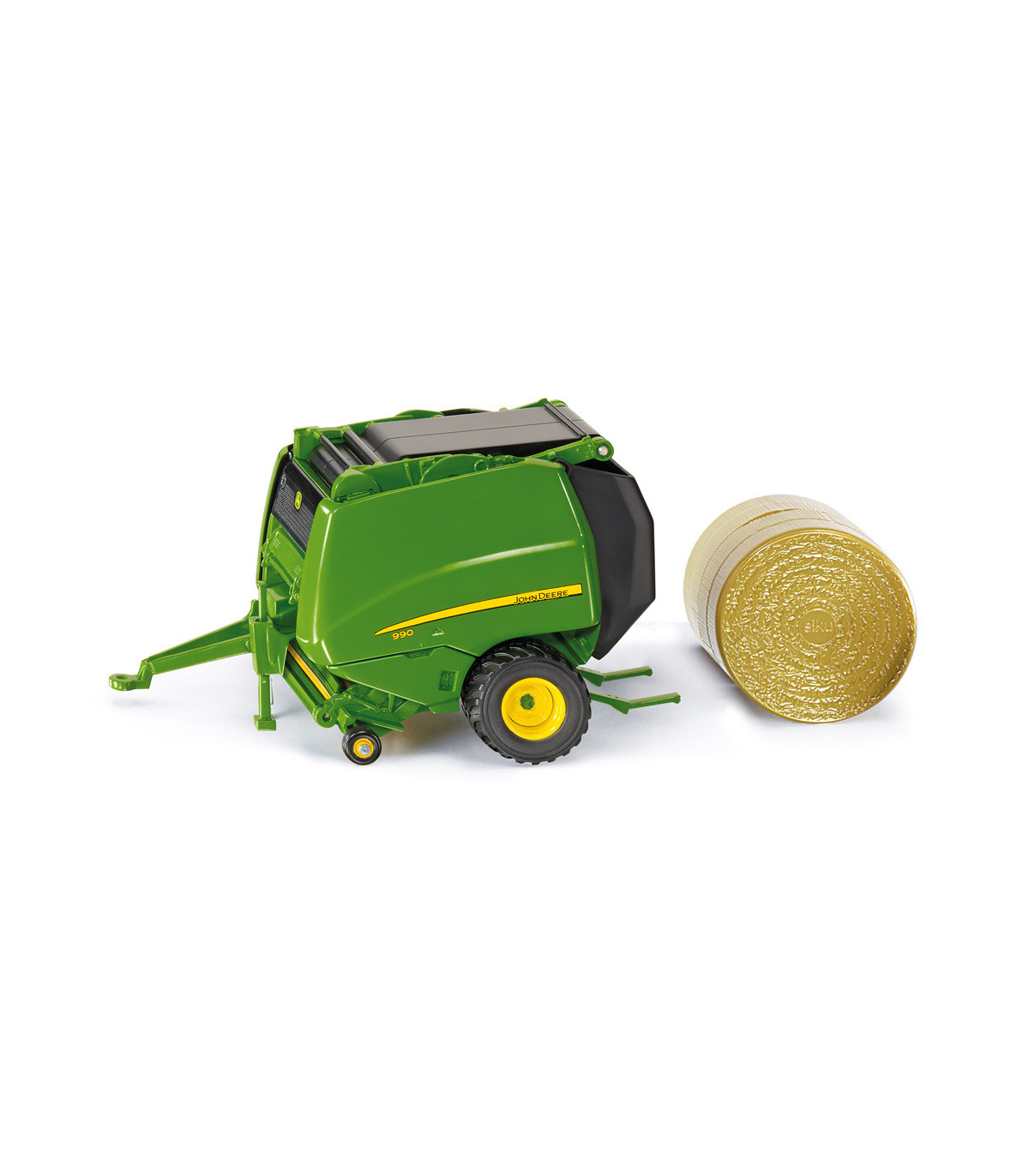 SIKU implementa la galardonada empacadora John Deere modelo 990 como un modelo detallado y de alta calidad a escala 1:32. El chasis de un solo eje está equipado con neumáticos y llantas originales. Las trampillas laterales de la máquina, al igual que el portón trasero, se pueden abrir y ofrecen una vista del interior, que se muestra con gran detalle. El recogedor y la pata de apoyo son móviles y, junto con la pintura y la impresión de alta calidad, contribuyen a la apariencia excepcional de este modelo. Se incluye una paca redonda como accesorio.