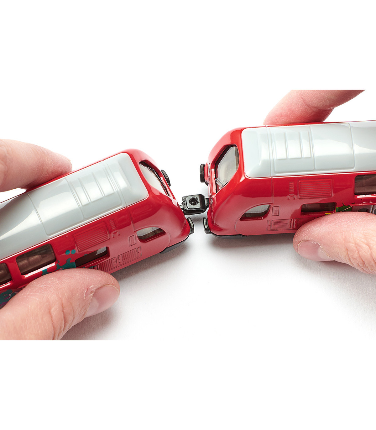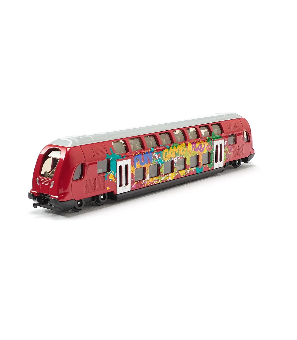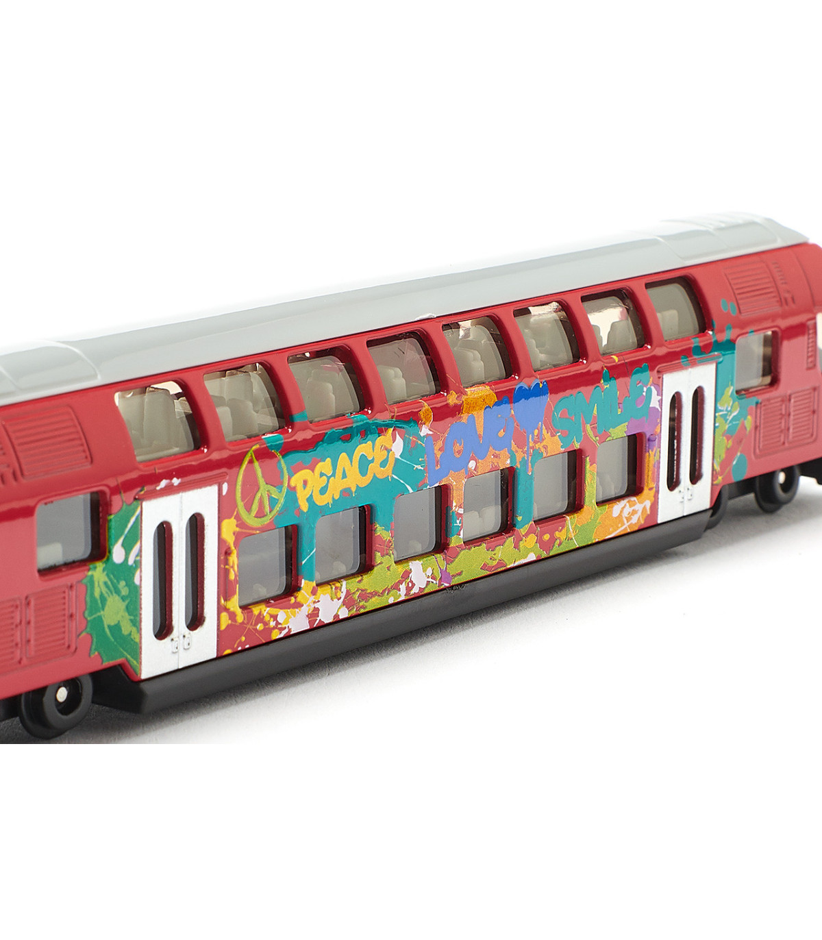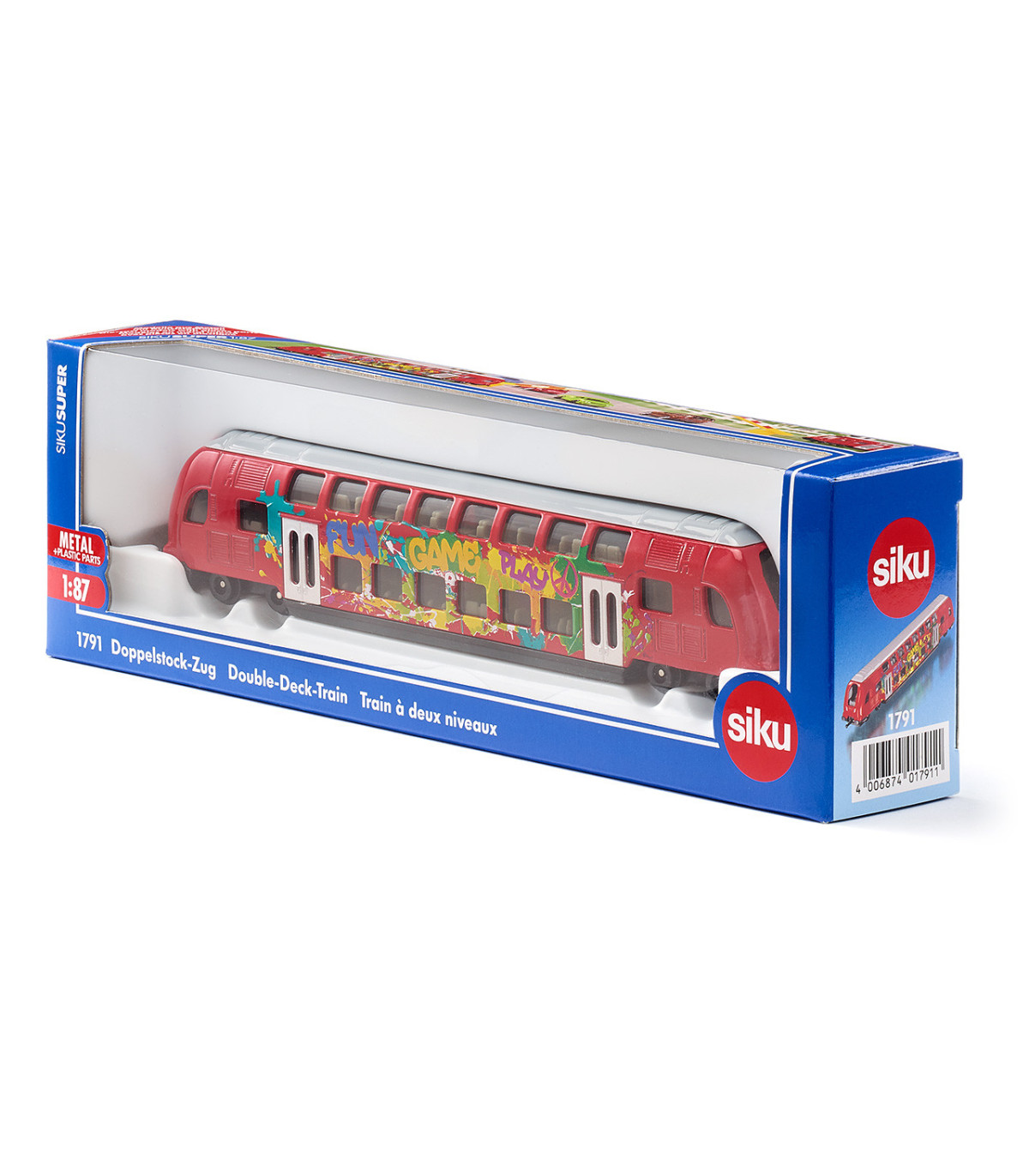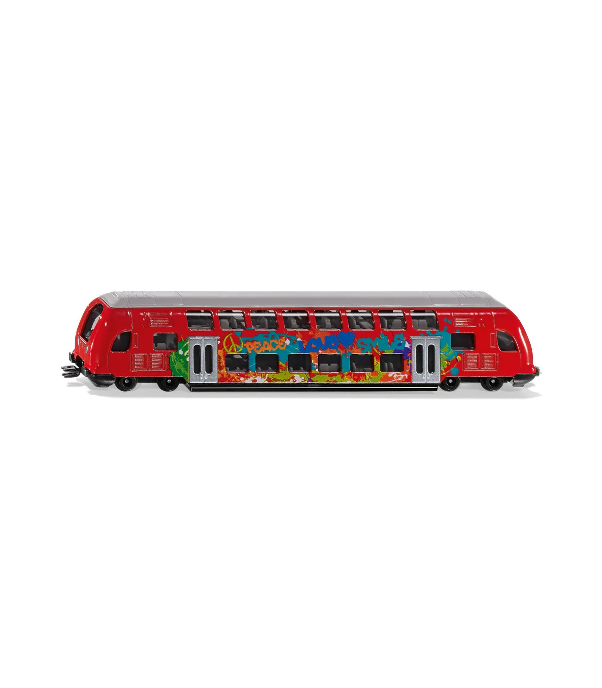 Atención: El tren de dos pisos SIKU llega al andén 1. El tren, fabricado en gran parte de metal, circula sobre ruedas de marcha suave y está impreso con coloridos grafitis. El tren de dos pisos SIKU está equipado con los acoplamientos estándar para trenes SIKU en la parte delantera y trasera. Esto significa que también se pueden acoplar otros trenes. El nuevo tren de dos pisos amplía el transporte público local con autobuses y trenes SIKU. En la estación ya se encuentran autobuses MAN de dos pisos (1884), tranvías SIKU (1895) y autobuses articulados SIKU (1617).