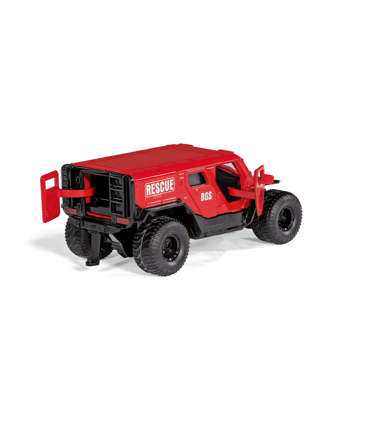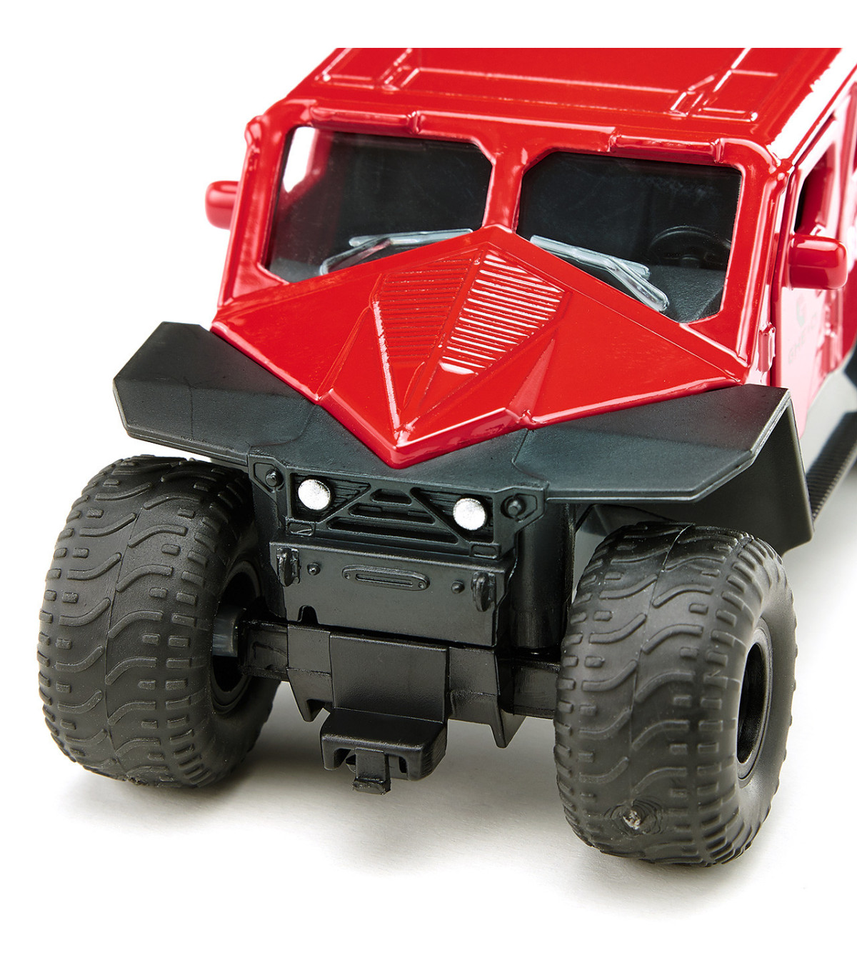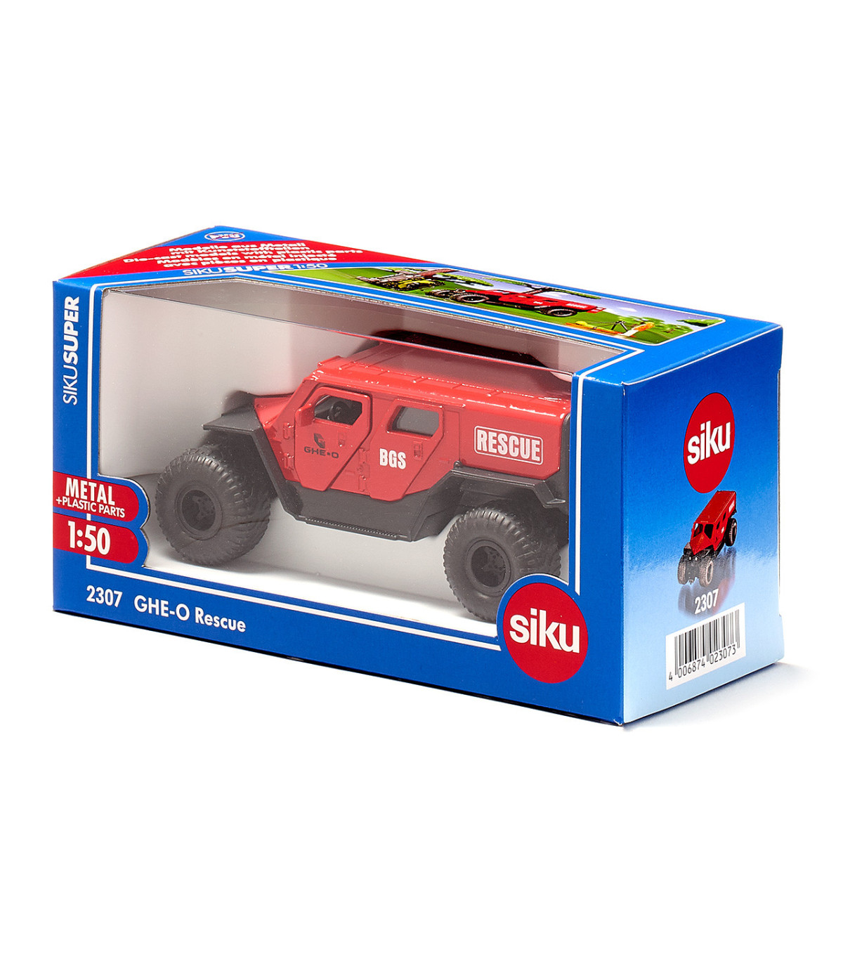 Esta ambulancia no necesita sirena ni luz de señalización. Impulsado por un gran motor V8, el camión monstruo GHE-O Rescue de estilo futurista se abre paso. Con los ejes delantero y trasero amortiguados y los grandes neumáticos tipo globo, la miniatura también está idealmente equipada para terrenos difíciles. Los neumáticos también se pueden quitar. En la miniatura a escala 1:50 se pueden abrir las puertas delanteras y traseras para poder empujar la camilla de rescate con la persona herida al interior del vehículo. ¡Misión de rescate cumplida!