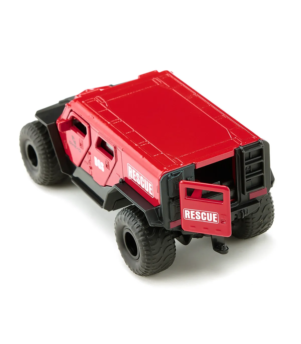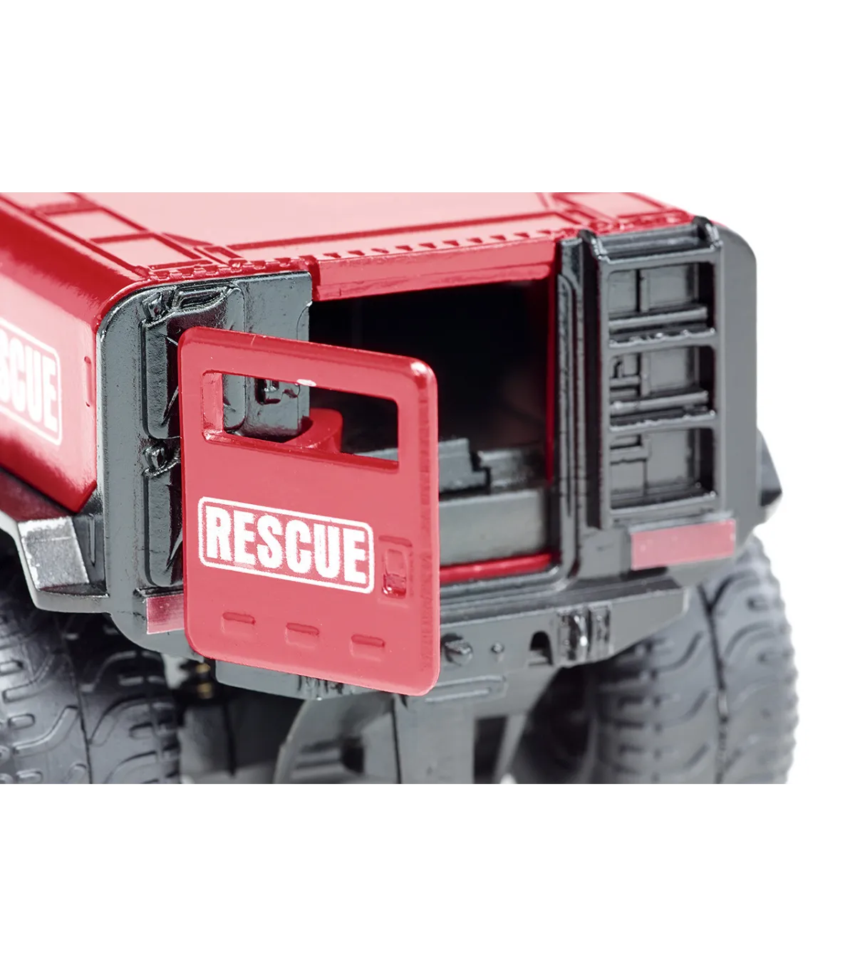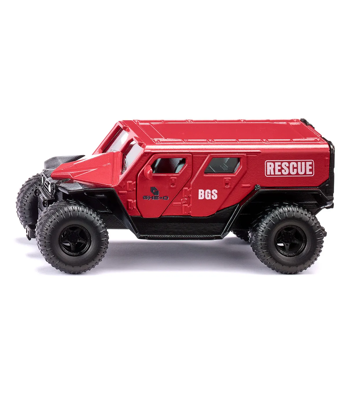 Esta ambulancia no necesita sirena ni luz de señalización. Impulsado por un gran motor V8, el camión monstruo GHE-O Rescue de estilo futurista se abre paso. Con los ejes delantero y trasero amortiguados y los grandes neumáticos tipo globo, la miniatura también está idealmente equipada para terrenos difíciles. Los neumáticos también se pueden quitar. En la miniatura a escala 1:50 se pueden abrir las puertas delanteras y traseras para poder empujar la camilla de rescate con la persona herida al interior del vehículo. ¡Misión de rescate cumplida!