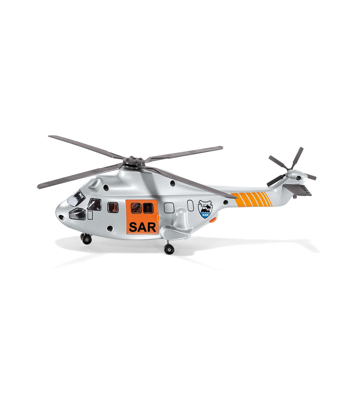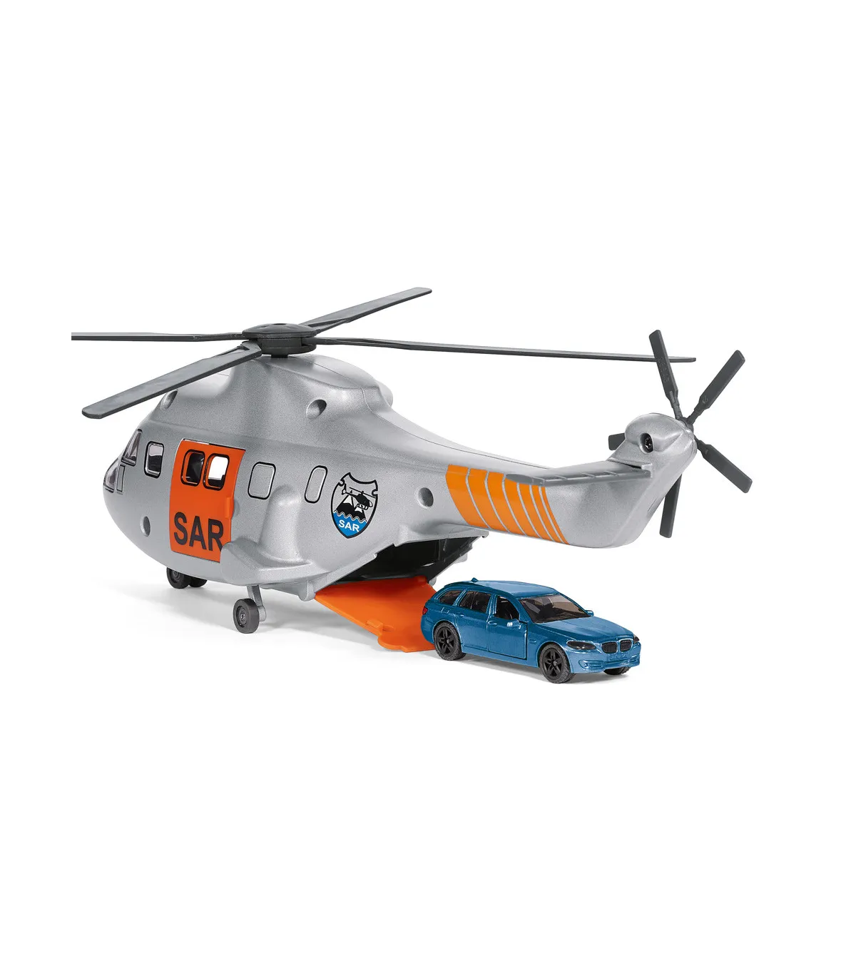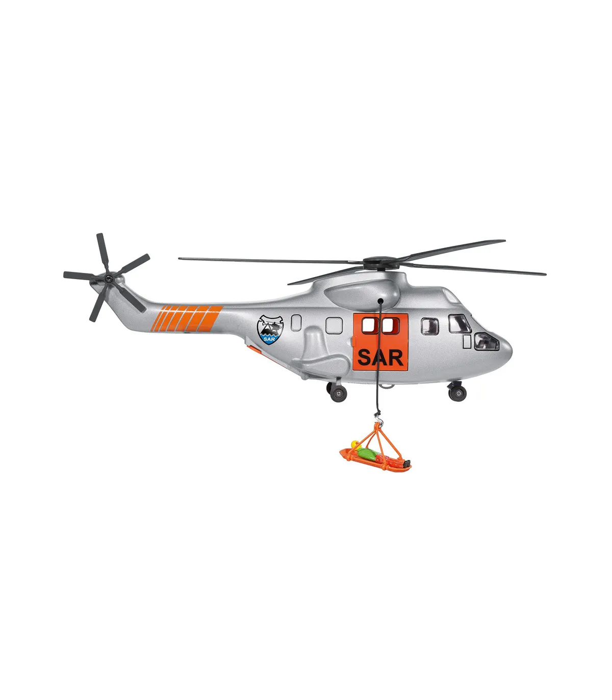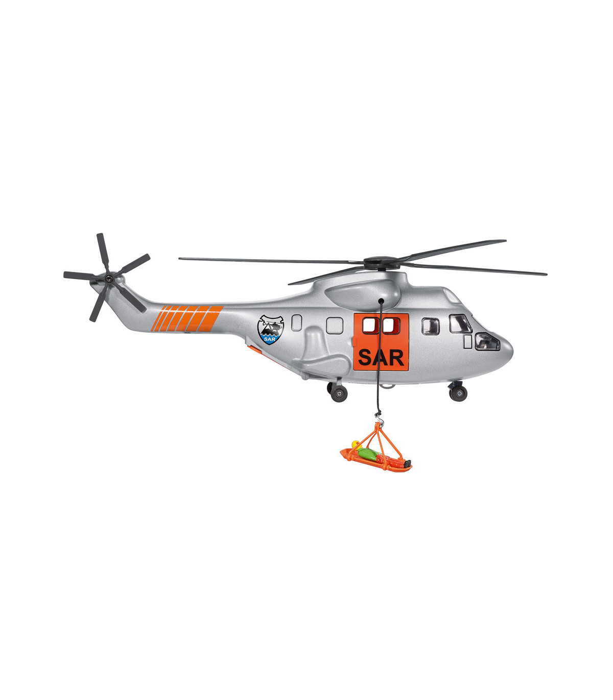 El ruido de los rotores anuncia la llegada del gran helicóptero de rescate. El helicóptero SAR se utiliza en las condiciones más difíciles en el mar y en la montaña. Los socorristas pueden utilizar cabrestantes y camillas para rescatar a las víctimas y brindarles atención médica en el helicóptero. Los helicópteros también se utilizan en zonas de crisis para transportar y entregar mercancías voluminosas. Para ello se pueden abrir las puertas laterales y el portón trasero del helicóptero SIKU. Es tan grande que un vehículo SIKU puede entrar y salir. El helicóptero de transporte SIKU está pintado de gris como el original, sólo las dos grandes puertas laterales son de color naranja brillante. El rotor del helicóptero se puede girar y el tren de aterrizaje se puede extender. El cabrestante se eleva automáticamente durante las maniobras de rescate. Para transportar a los pacientes más lejos está disponible la ambulancia SIKU (2108).