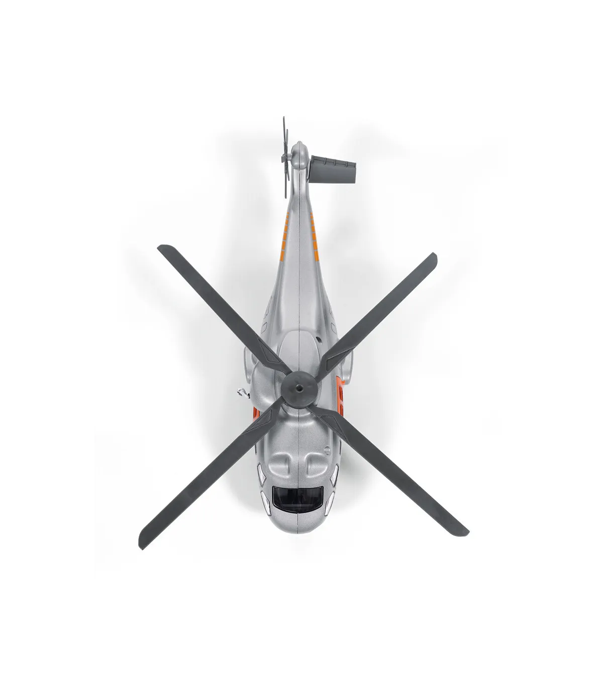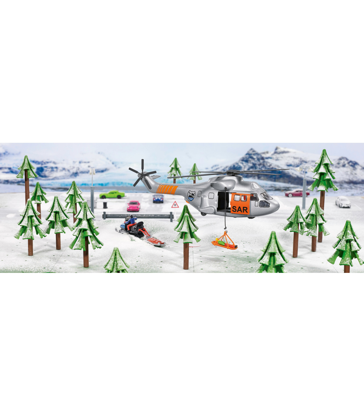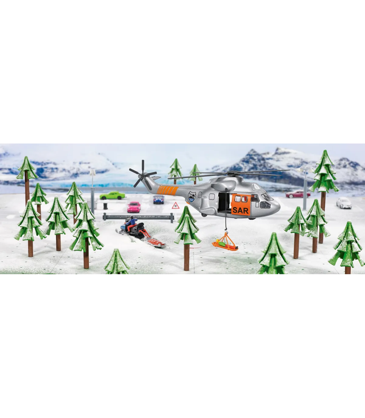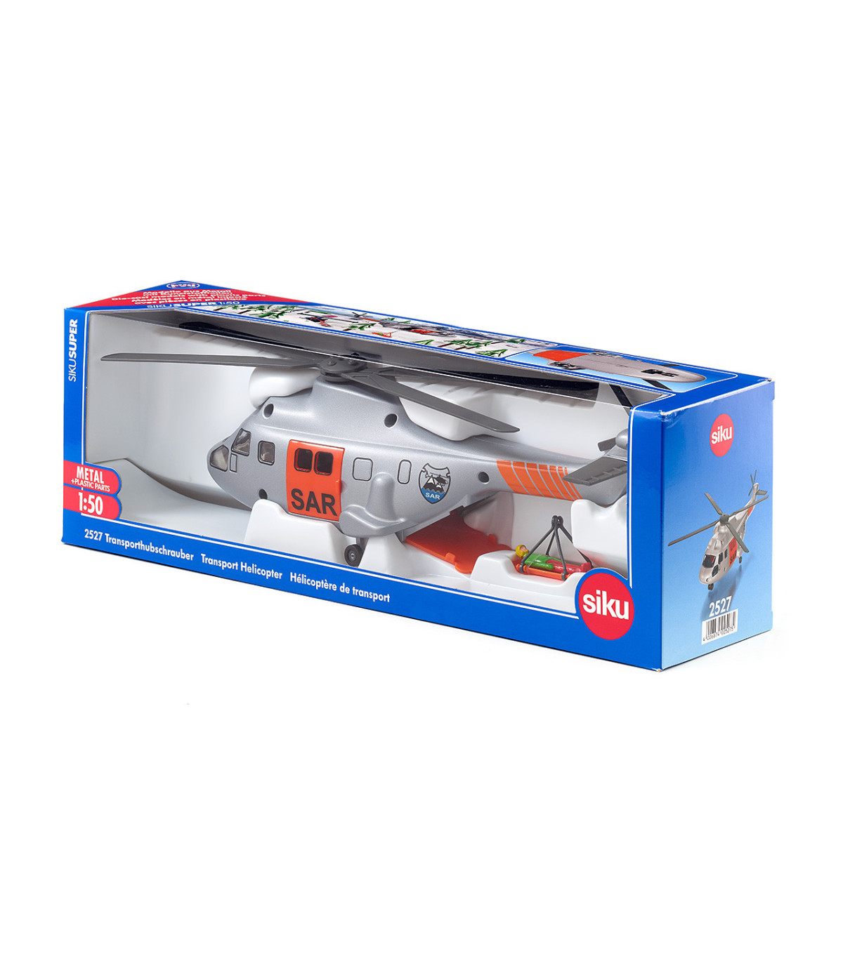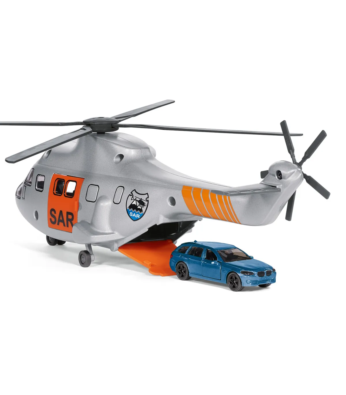 El ruido de los rotores anuncia la llegada del gran helicóptero de rescate. El helicóptero SAR se utiliza en las condiciones más difíciles en el mar y en la montaña. Los socorristas pueden utilizar cabrestantes y camillas para rescatar a las víctimas y brindarles atención médica en el helicóptero. Los helicópteros también se utilizan en zonas de crisis para transportar y entregar mercancías voluminosas. Para ello se pueden abrir las puertas laterales y el portón trasero del helicóptero SIKU. Es tan grande que un vehículo SIKU puede entrar y salir. El helicóptero de transporte SIKU está pintado de gris como el original, sólo las dos grandes puertas laterales son de color naranja brillante. El rotor del helicóptero se puede girar y el tren de aterrizaje se puede extender. El cabrestante se eleva automáticamente durante las maniobras de rescate. Para transportar a los pacientes más lejos está disponible la ambulancia SIKU (2108).