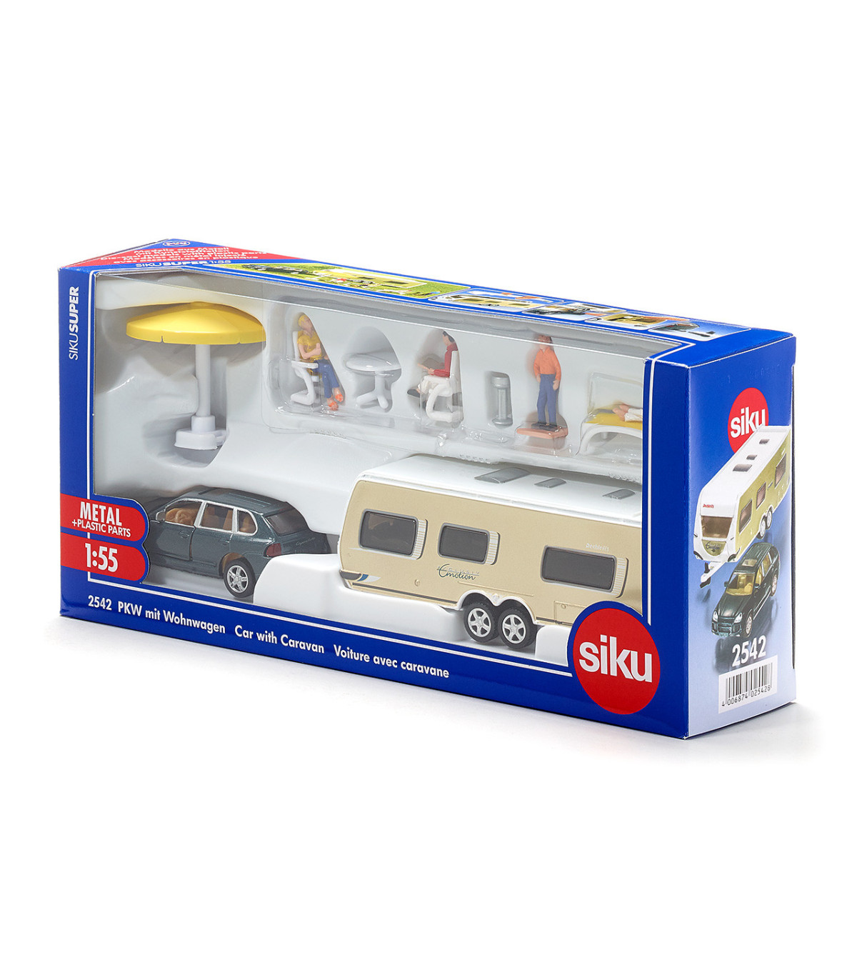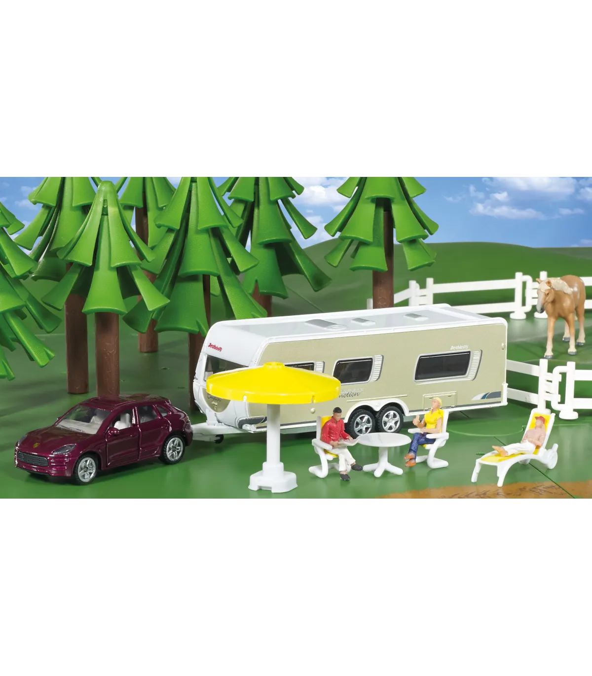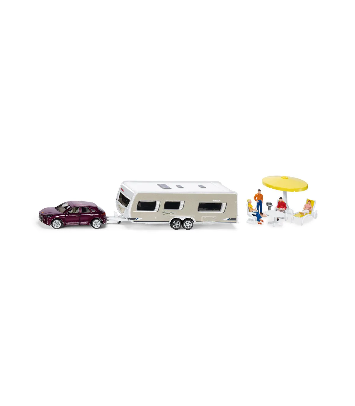 Combinación con un Porsche Macan Turbo como vehículo tractor, la caravana Dethleffs “Exclusiv Emotion” y una amplia gama de accesorios. El Porsche Macan negro se perfeccionó aún más en términos de tecnología de impresión. La cuidada implementación de muchos pequeños detalles en la caravana de Dethleffs, así como la amplia impresión en el modelo, demuestran que este juguete también quedará bien en una vitrina de coleccionista. Otra característica especial de la caravana es el techo desmontable. Esto permite representar escenas de juego también dentro de la caravana con las figuras suministradas. Además de varias figuras, a bordo también se encuentra un equipo de camping casi completo, compuesto por 2 sillas de jardín, una mesa, una sombrilla, una tumbona y una barbacoa.