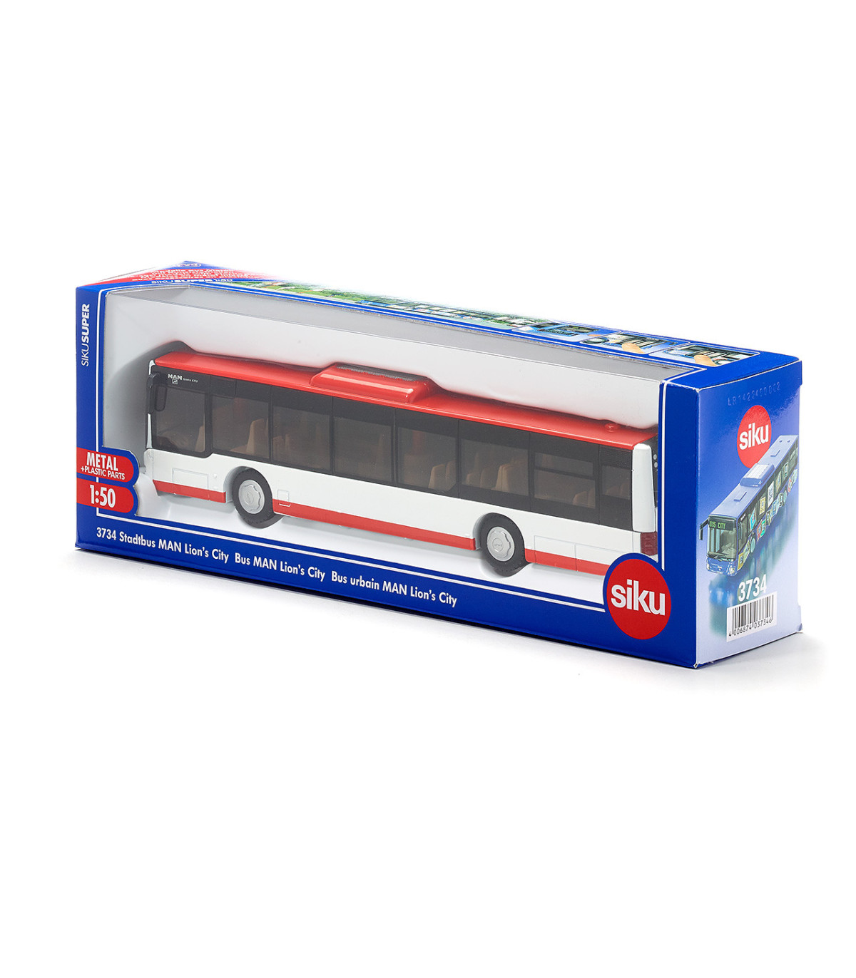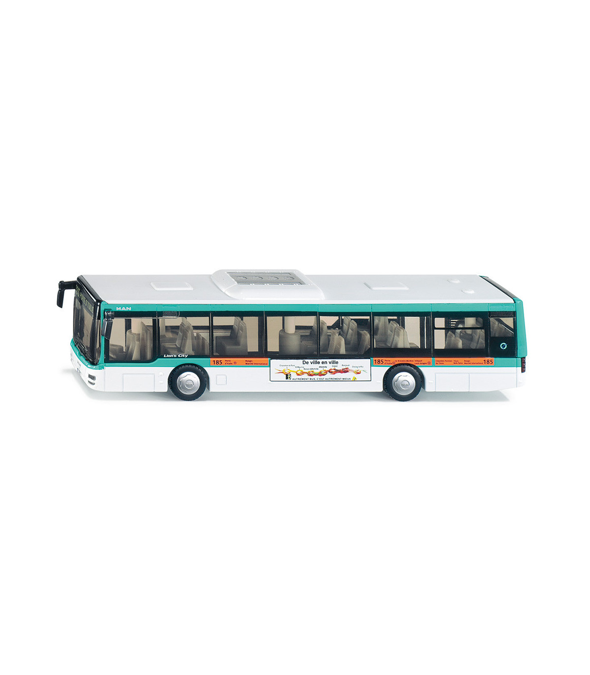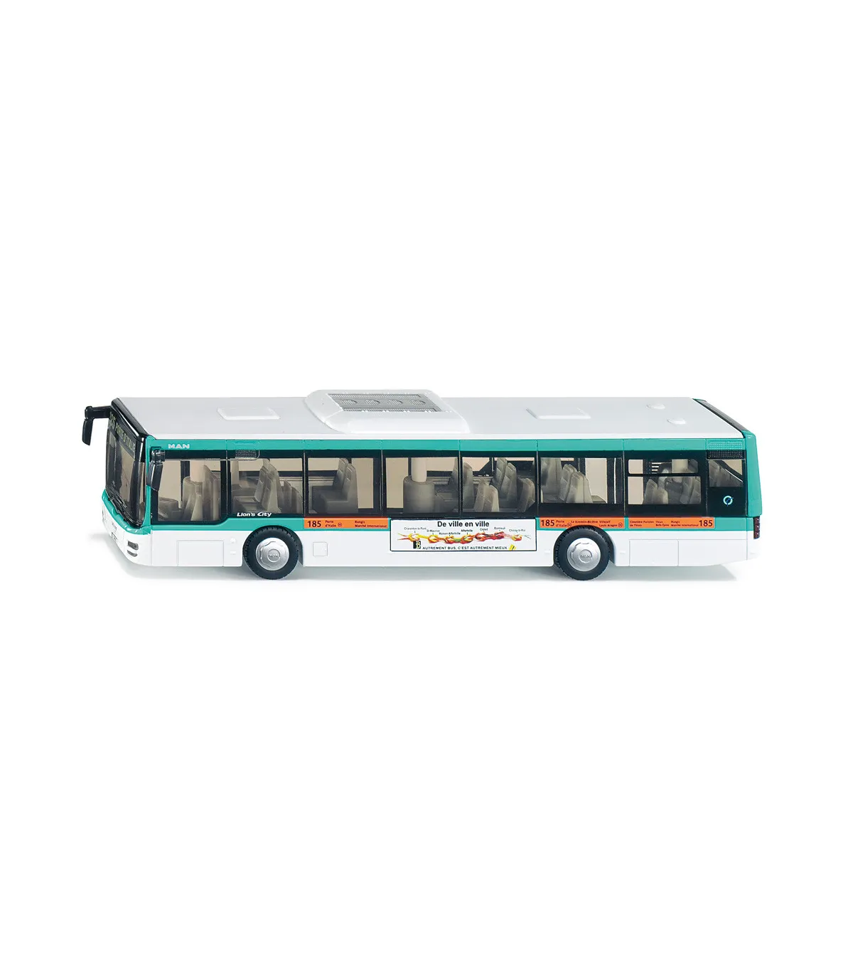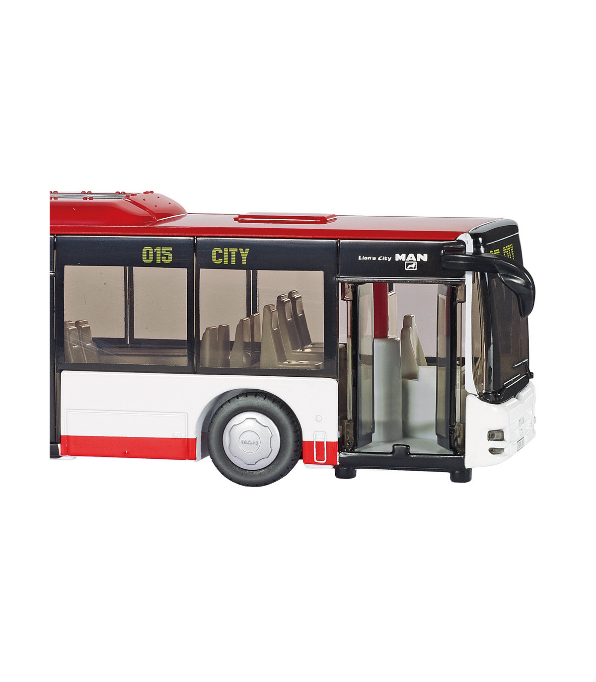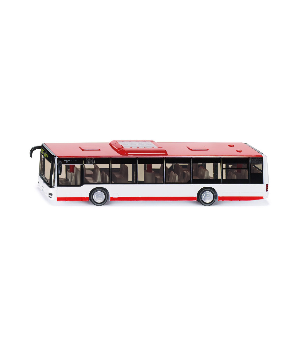 Modelo de autobús muy elaborado del MAN Lions City original en escala 1:50. Ruedas con bandas de rodadura de goma. 2 ejes, el segundo eje con neumáticos gemelos. 2 puertas en el lado derecho del vehículo que se pueden abrir. La trampilla del motor en la parte trasera se puede abrir. Ventanas tintadas. Espejos retrovisores separados y parrilla del radiador empotrada. Luces delanteras y traseras fabricadas en plástico. Estructura de techo con aire acondicionado.