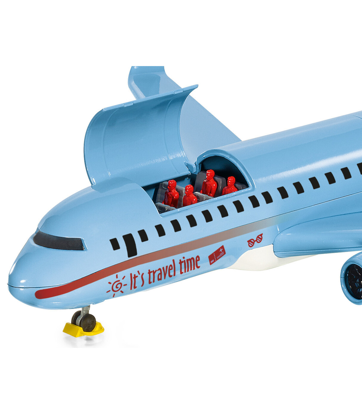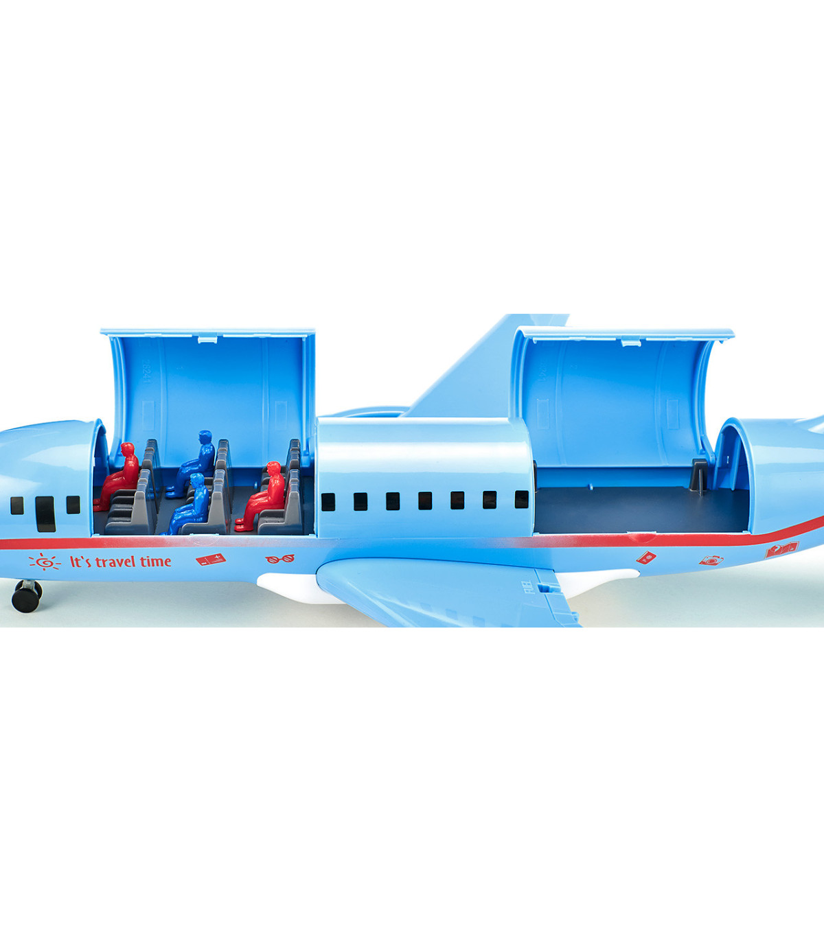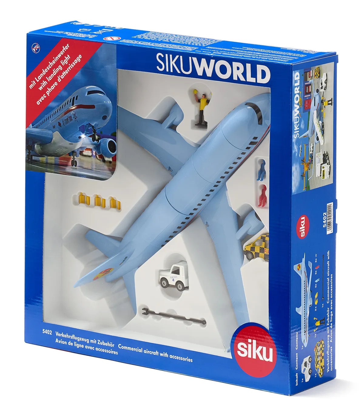 El gran avión de pasajeros SIKUWORLD (38,5 cm) con dos potentes motores está listo para embarcar. ¿Pero quién está sentado y dónde? La tripulación de cabina puede simplemente levantar la trampilla delantera del techo y asignar a los cuatro pasajeros a sus asientos. En el portón trasero hay espacio en el área de carga para su automóvil favorito, que puede llevarse de vacaciones. A pleno impulso, el avión se vuelve cada vez más rápido, despega y el tren de aterrizaje se puede plegar. Prepárese para la aproximación al aterrizaje: despliegue el tren de aterrizaje y encienda las luces de aterrizaje. El LED se apaga automáticamente después de diez minutos de funcionamiento. El avión ha aterrizado. El vehículo de seguimiento acompaña a la aeronave hasta la posición de estacionamiento. El remolcador con barra de remolque ya está listo para el próximo vuelo. El complemento ideal para el avión de pasajeros es el nuevo set de aeropuerto (número de artículo 6312).
