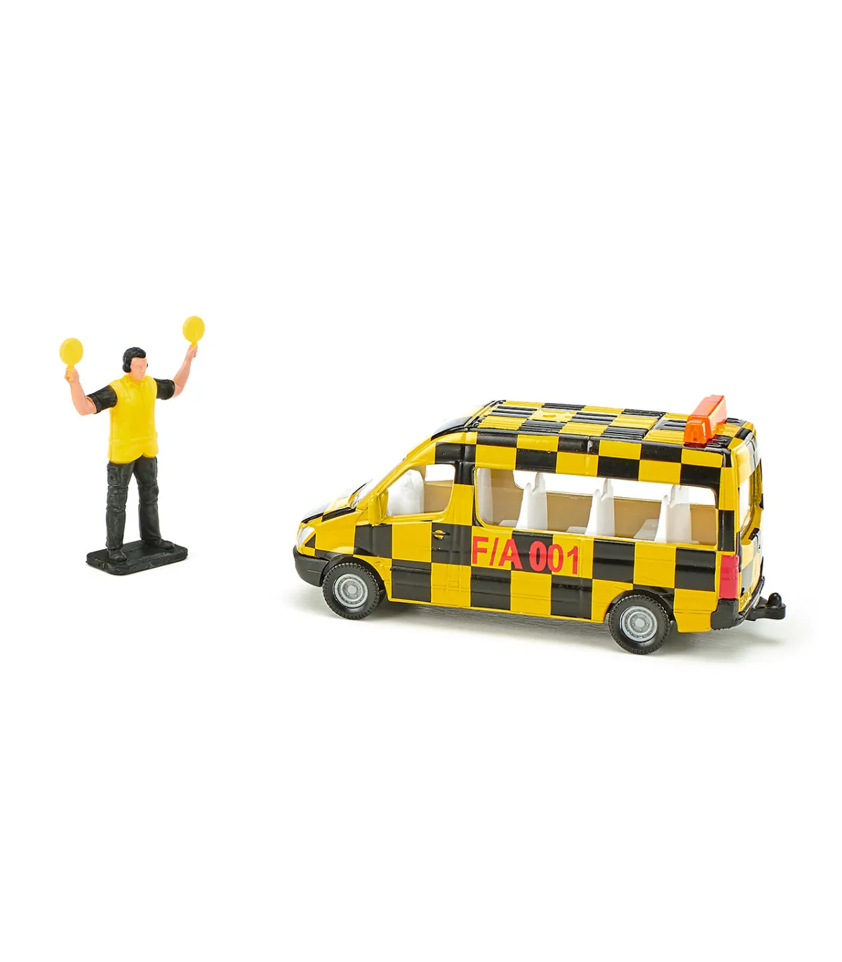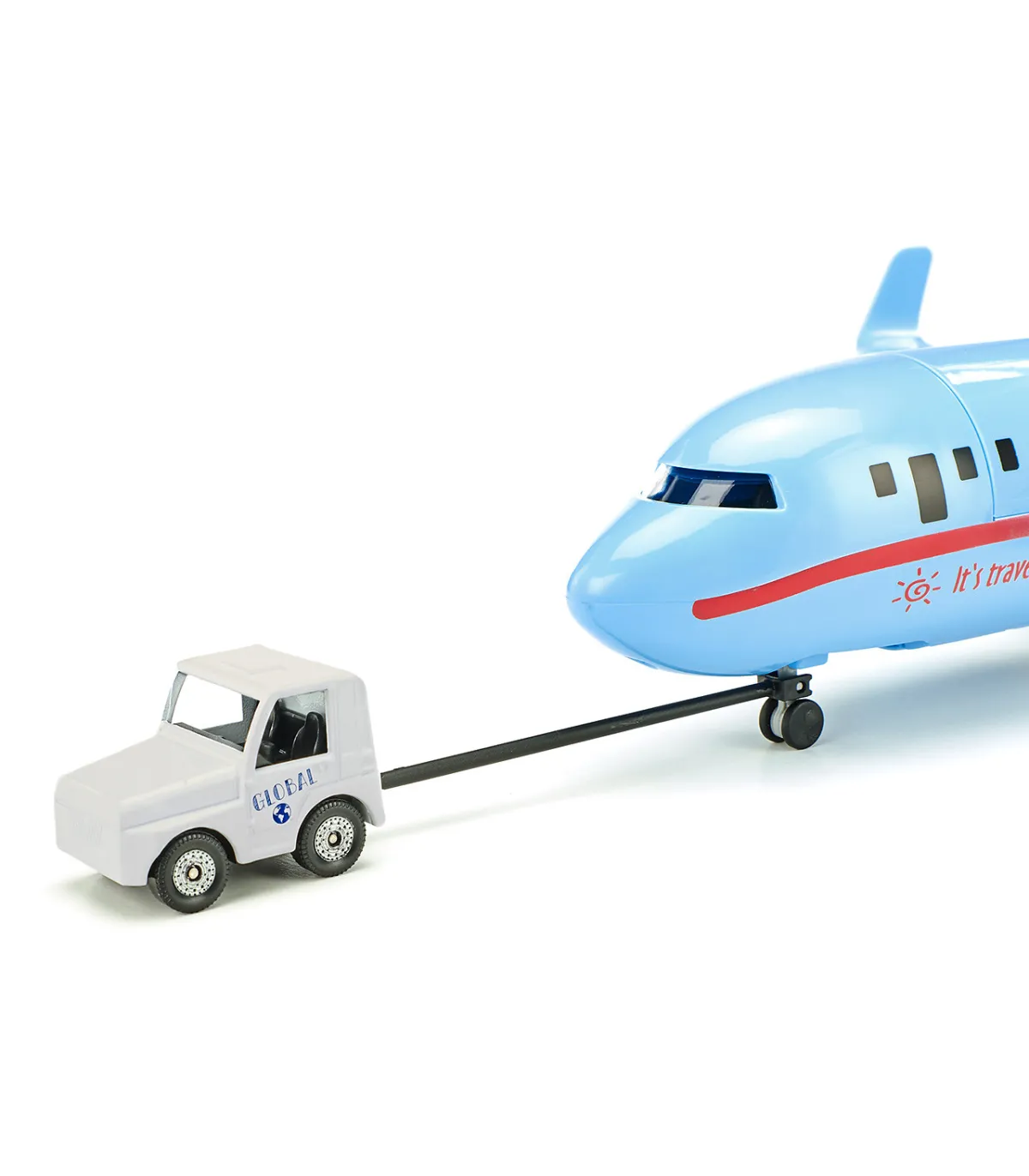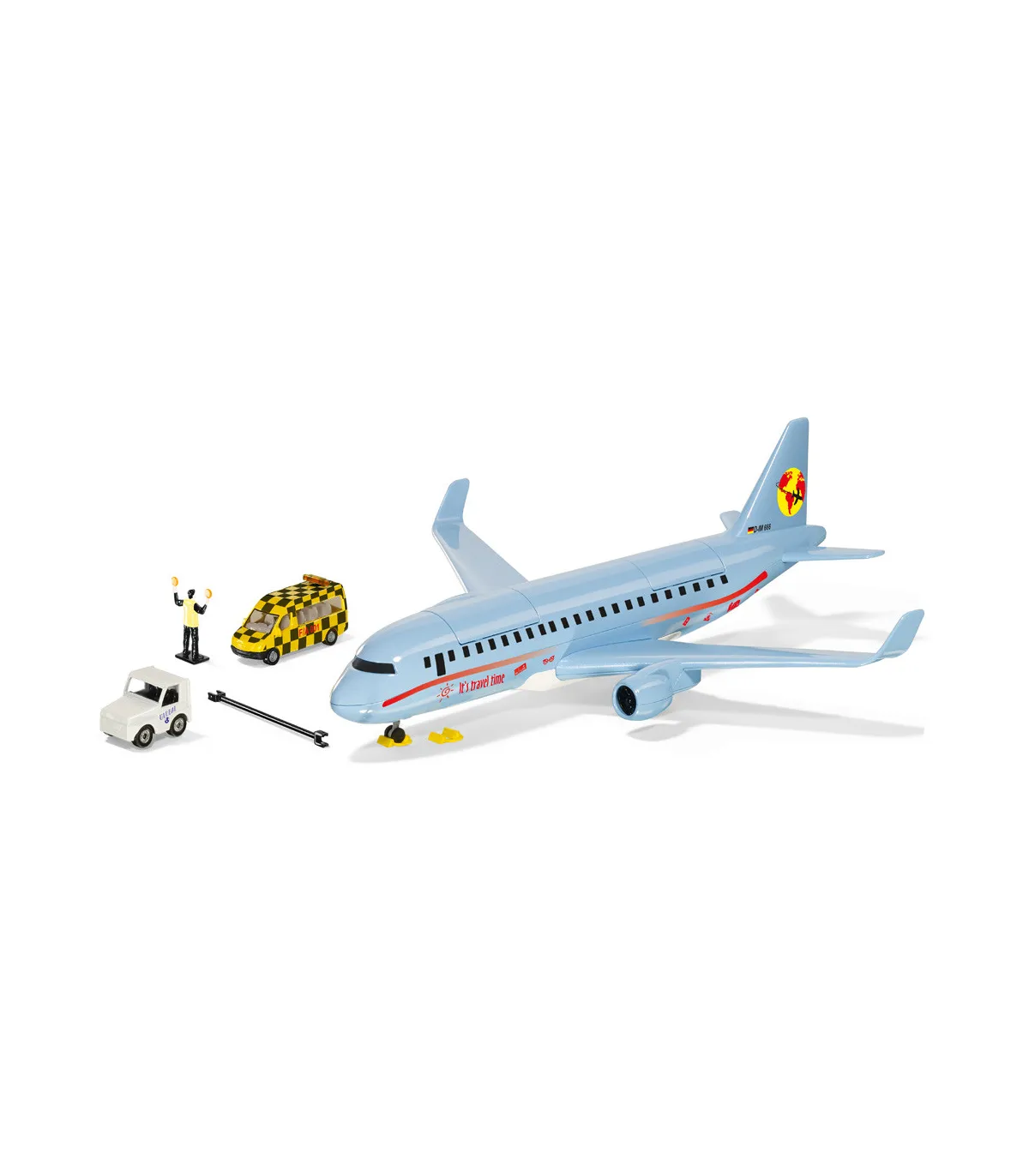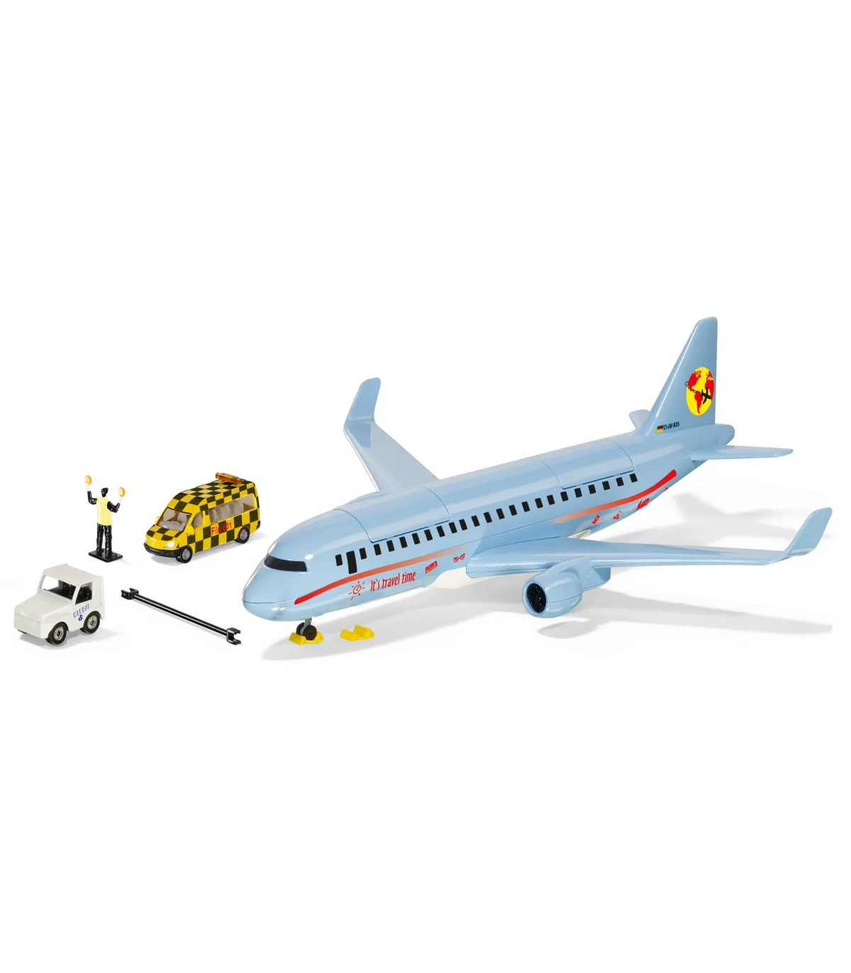El gran avión de pasajeros SIKUWORLD (38,5 cm) con dos potentes motores está listo para embarcar. ¿Pero quién está sentado y dónde? La tripulación de cabina puede simplemente levantar la trampilla delantera del techo y asignar a los cuatro pasajeros a sus asientos. En el portón trasero hay espacio en el área de carga para su automóvil favorito, que puede llevarse de vacaciones. A pleno impulso, el avión se vuelve cada vez más rápido, despega y el tren de aterrizaje se puede plegar. Prepárese para la aproximación al aterrizaje: despliegue el tren de aterrizaje y encienda las luces de aterrizaje. El LED se apaga automáticamente después de diez minutos de funcionamiento. El avión ha aterrizado. El vehículo de seguimiento acompaña a la aeronave hasta la posición de estacionamiento. El remolcador con barra de remolque ya está listo para el próximo vuelo. El complemento ideal para el avión de pasajeros es el nuevo set de aeropuerto (número de artículo 6312).