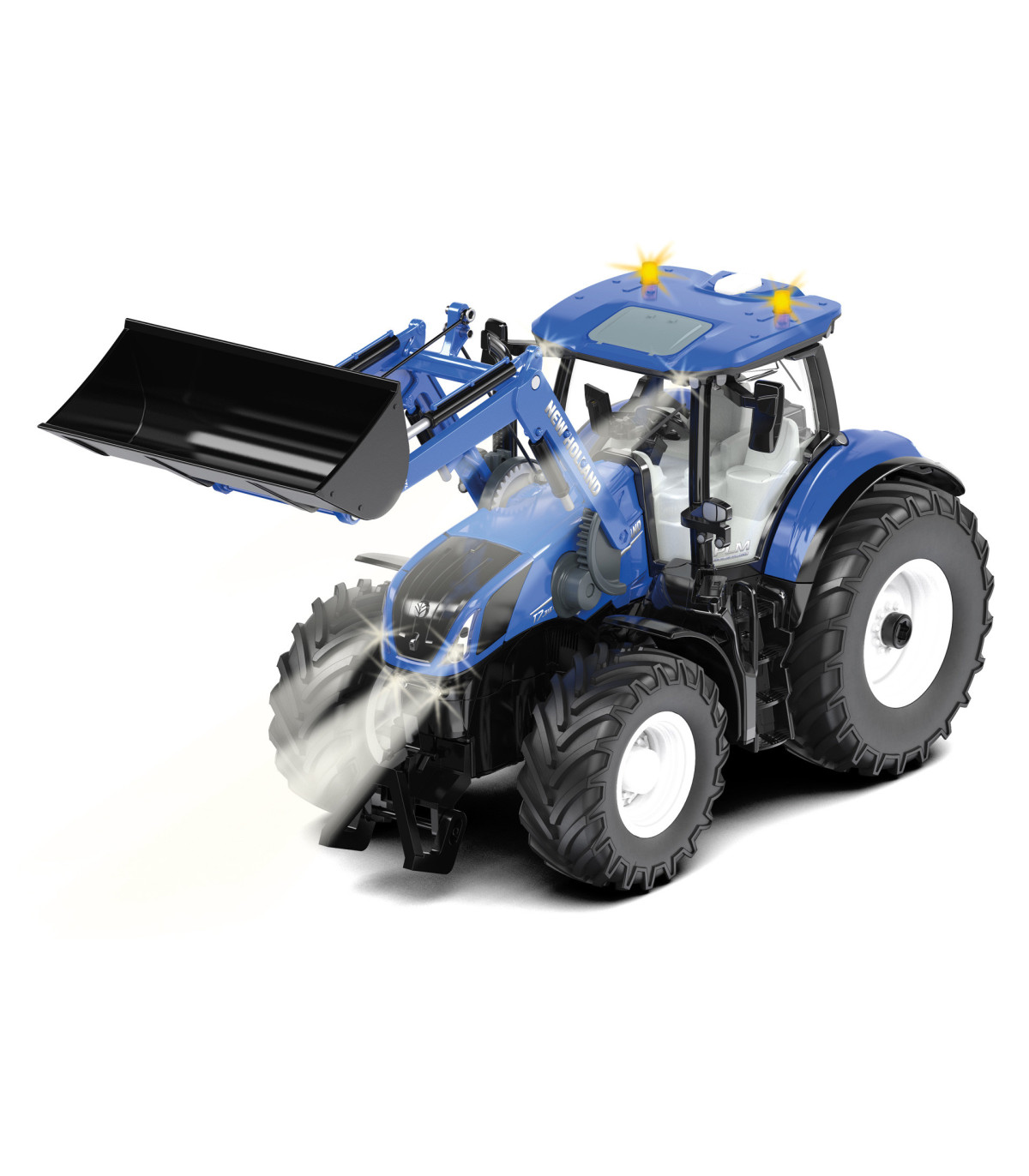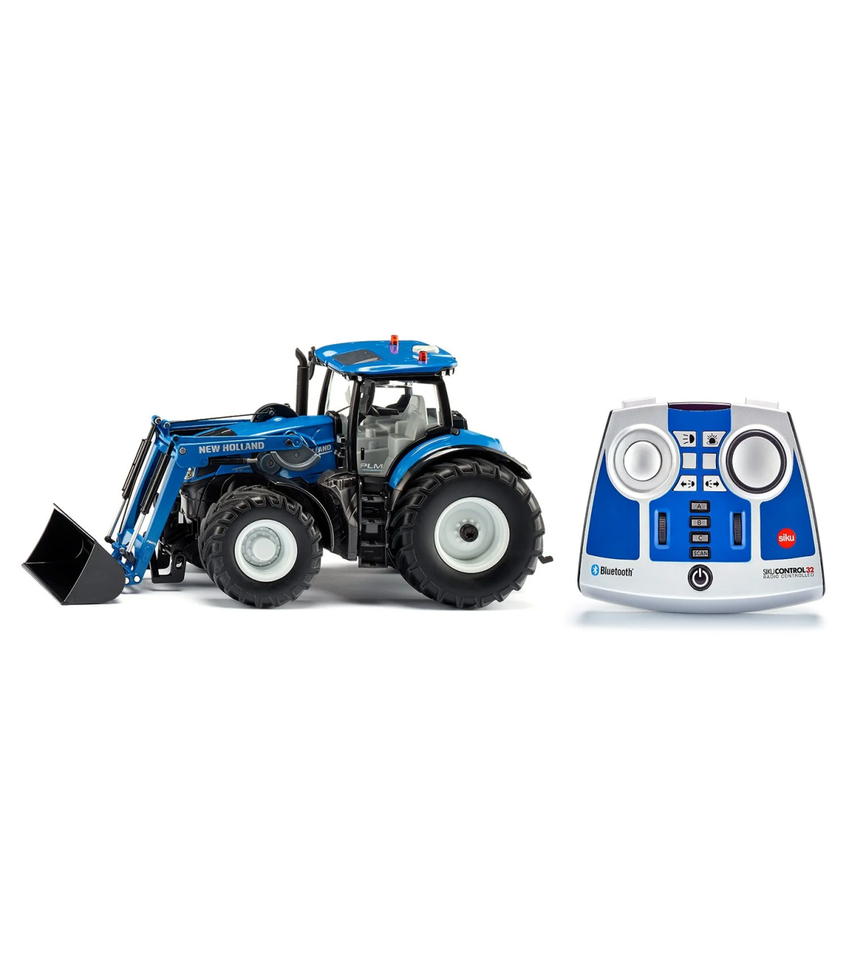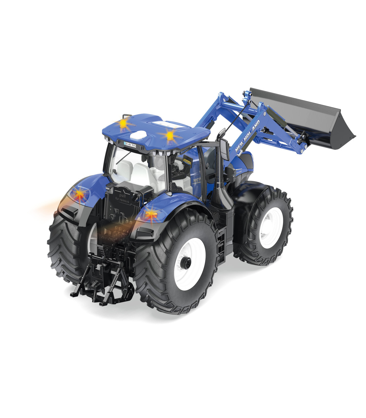 El New Holland T7.315 es el modelo superior de la serie Heavy Duty: seis cilindros y 6,7 litros y 313 CV. El motor potente y al mismo tiempo económico hace que este gran tractor sea un todoterreno en el campo y en la carretera. Con el cargador frontal, el New Holland T7.315 se convierte en una herramienta de trabajo en la granja. El módulo de control remoto SIKUCONTROL permite controlar las 5 marchas, los 12 LED y las numerosas funciones del tractor, como el embrague trasero. La tracción trasera y la dirección se controlan proporcionalmente. Además, el brazo de carga del cargador frontal y del cargador se pueden mover de forma realista. El brazo de carga también puede equiparse con una horquilla para palés. Esto convierte el cargador frontal en una carretilla elevadora. La horquilla se mantiene automáticamente en posición horizontal incluso durante los movimientos de elevación. Todos los tractores SIKUCONTROL equipados con tecnología Bluetooth se pueden controlar con el módulo de control remoto Bluetooth. El control ofrece una amplia gama de opciones para los profesionales: dirección, conducción, acoplamiento trasero electrónico para implementos y remolques, luces de marcha conmutables, intermitentes traseros y luces giratorias conmutables y el control de varios tractores a través de un único módulo de control remoto.