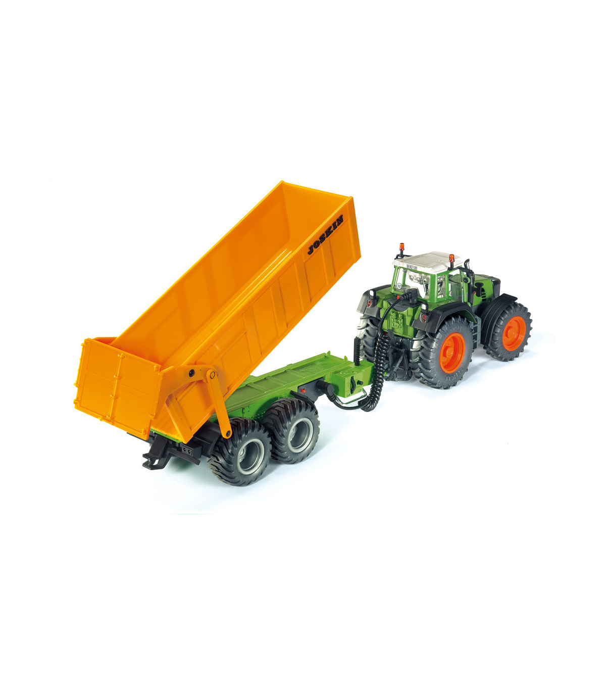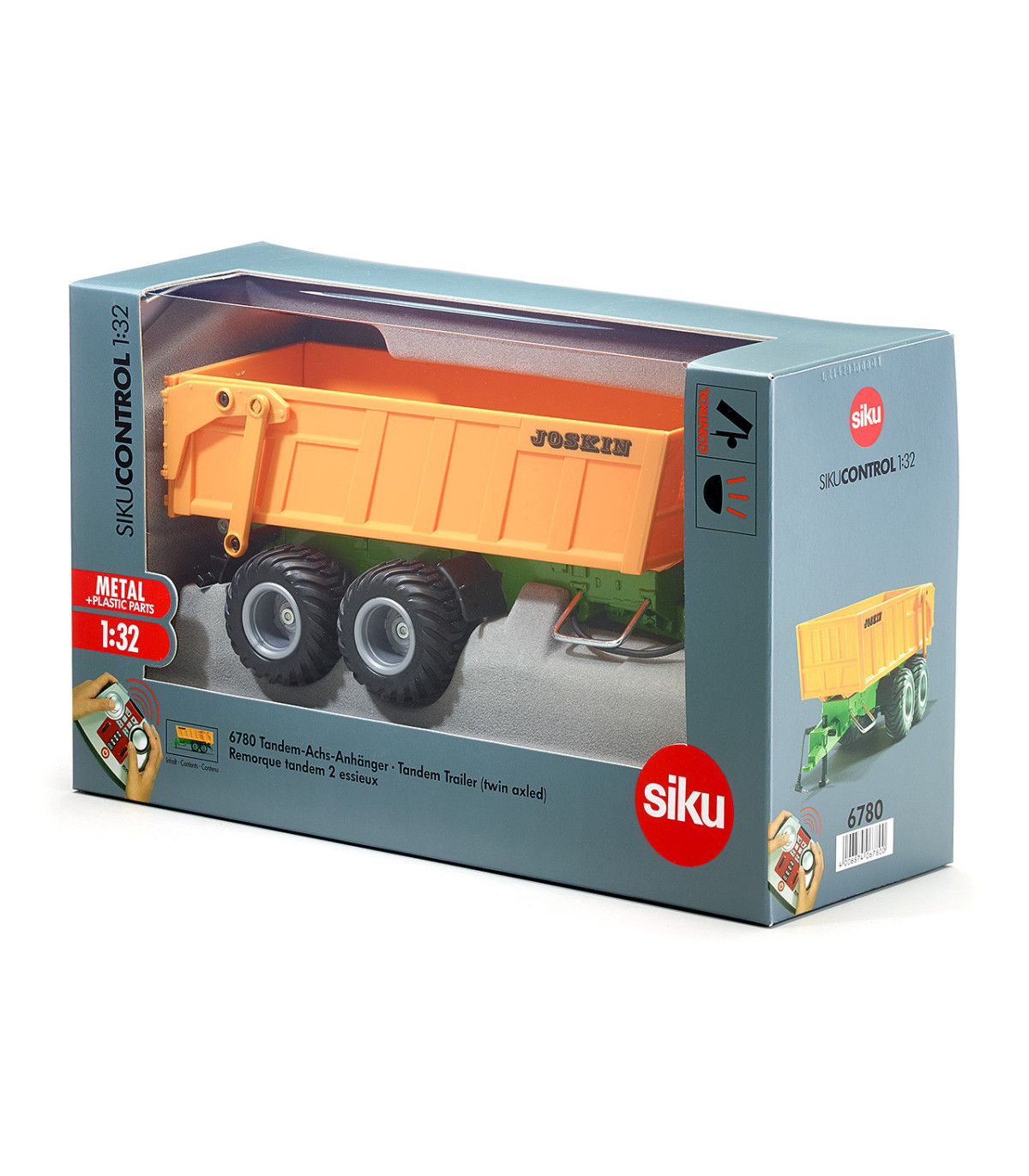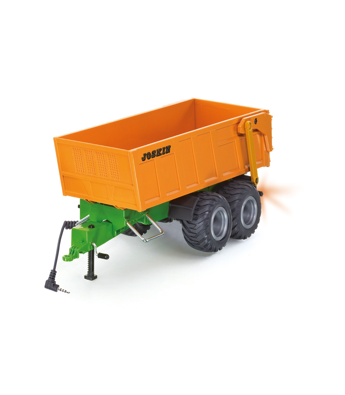 Remolque de eje tándem controlado electrónicamente. La cubeta del remolque se puede inclinar hacia atrás electrónicamente. Para ello se puede utilizar el módulo de control remoto existente. En la zona trasera del remolque, los LED rojos y naranjas proporcionan luces traseras e intermitentes. Este artículo se alimenta desde el remolque al tractor mediante un cable de datos incluido. No se requiere una batería adicional con cargador para el funcionamiento del juego. Atención: la variante del modelo sin fuente de alimentación propia sólo está disponible desde enero de 2012. Si tienes una versión anterior del modelo, todavía tiene su propia fuente de alimentación. Además de la batería Art. 6702 (incluida en el suministro), en este caso también se necesita el cargador Art. 6706 (no incluido en el suministro) para el funcionamiento del juego.