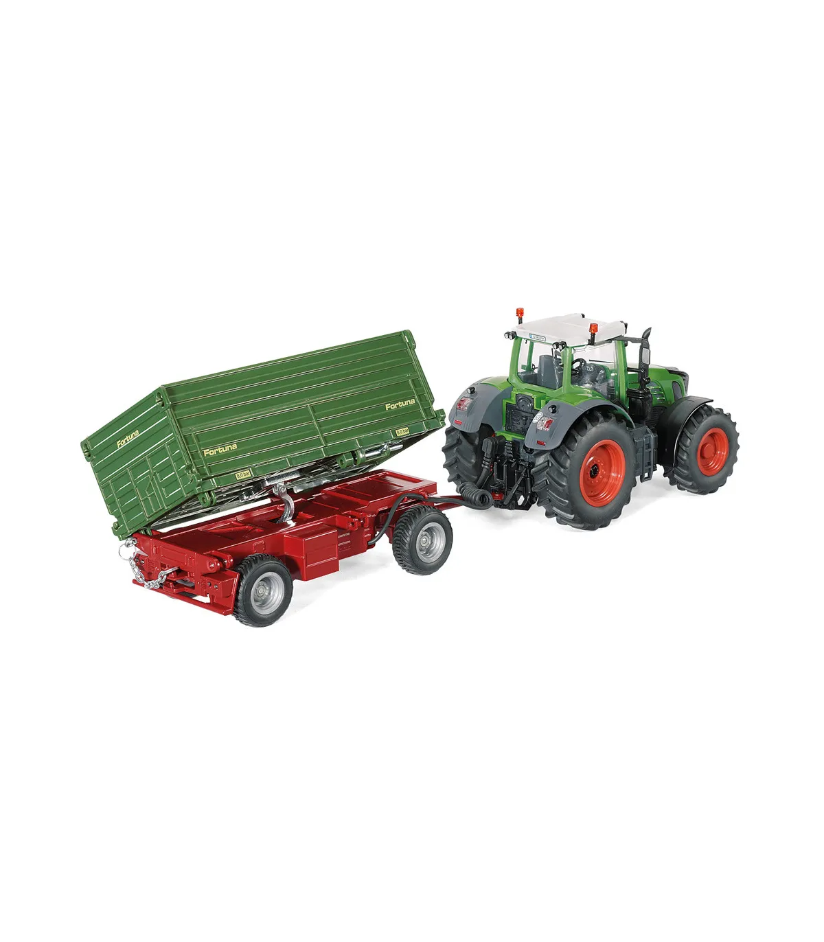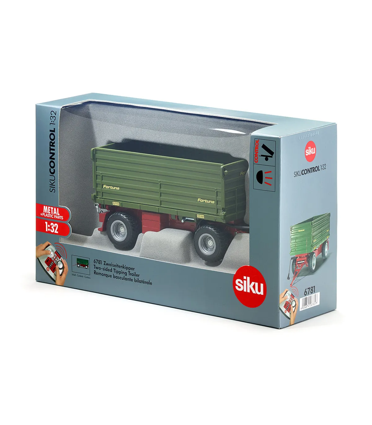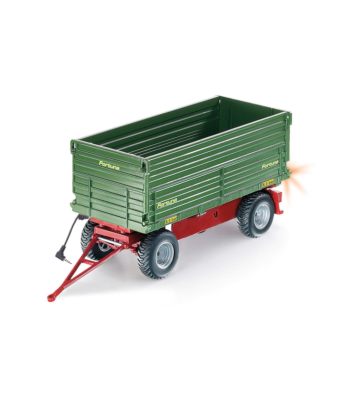 Carro basculante bidireccional controlado electrónicamente con plataforma giratoria y lanza. La cubeta del remolque se puede inclinar electrónicamente tanto hacia la derecha como hacia la izquierda. Para ello se puede utilizar el módulo de control remoto existente. En la zona trasera del remolque, los LED rojos y naranjas proporcionan luces traseras e intermitentes. Este artículo se alimenta desde el remolque al tractor mediante un cable de datos incluido. No se requiere una batería adicional con cargador para el funcionamiento del juego. Atención: la variante del modelo sin fuente de alimentación propia sólo está disponible desde enero de 2012. Si tienes una versión anterior del modelo, todavía tiene su propia fuente de alimentación. Además de la batería Art. 6702 (incluida en el suministro), en este caso también se necesita el cargador Art. 6706 (no incluido en el suministro) para el funcionamiento del juego.