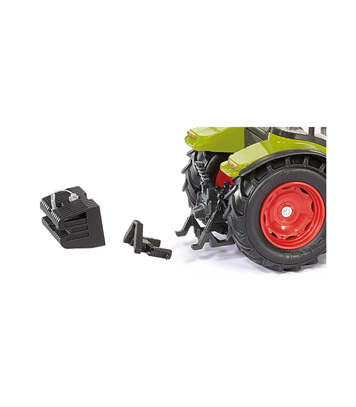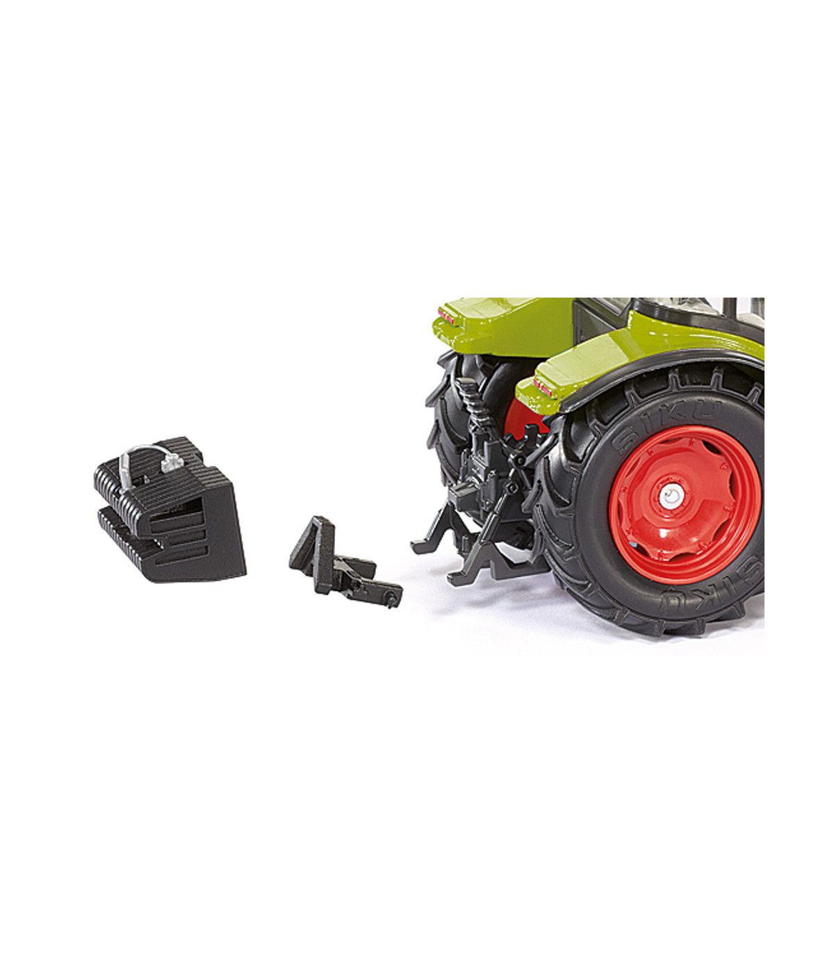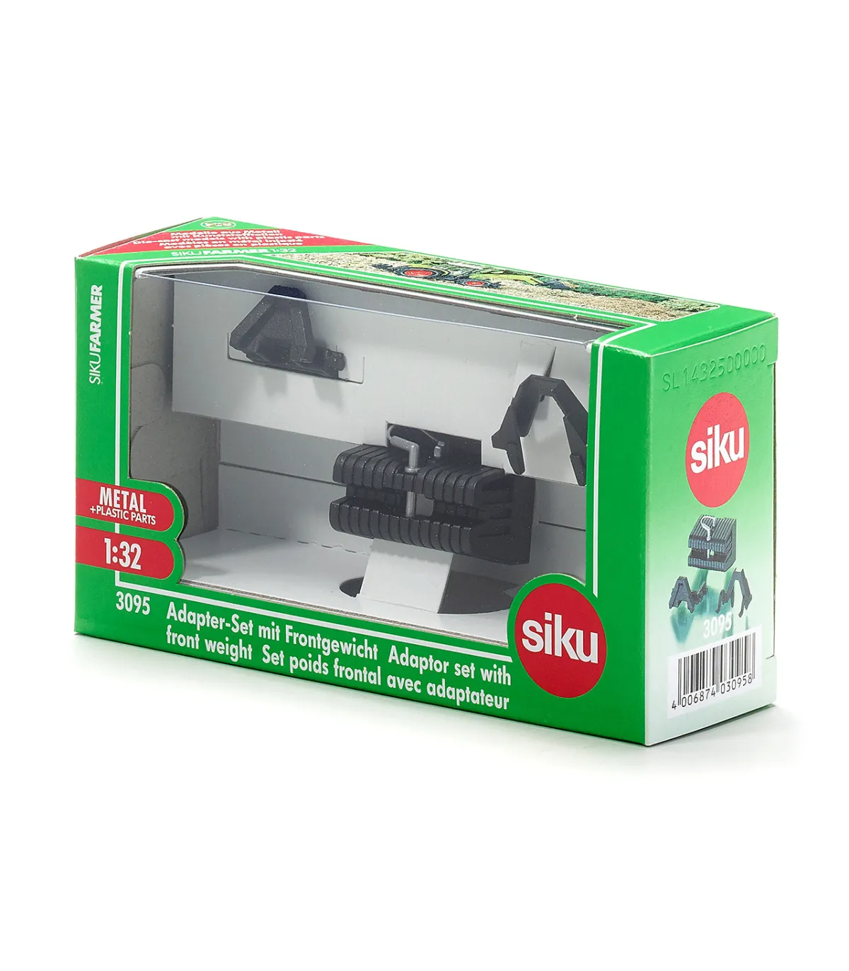 Accesorio compuesto por un juego de adaptadores para el enganche delantero y trasero de los tractores SIKUFarmer 1:32 y un contrapeso delantero de metal. El juego de adaptadores invierte la funcionalidad del soporte delantero y trasero del tractor SIKUFarmer 1:32. En el enganche trasero también se pueden colgar los aperos delanteros o el peso delantero.