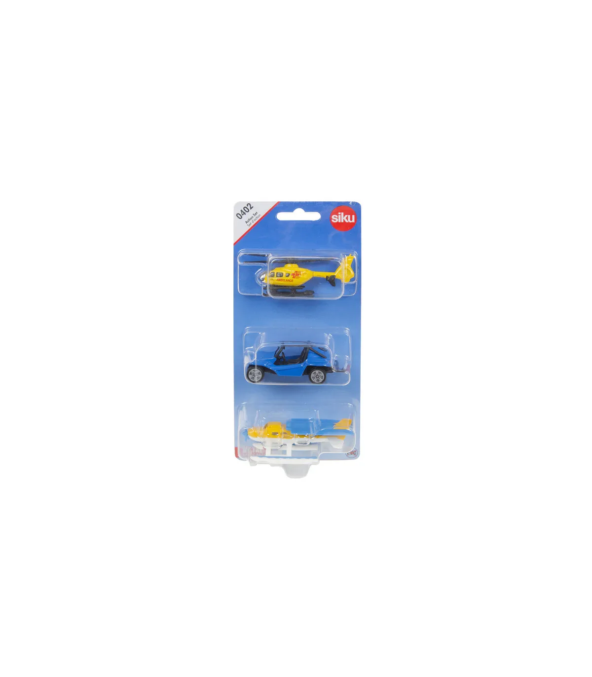 Conjunto de acciones compuesto por: helicóptero de rescate Eurocopter EC 135 (modelo 1996-2013) (cf: 0856) + buggy de peligro / buggy HAZ (chasis acortado de VW Beetle 1200 con carrocería de GRP, 9 Billfner: Autohanusich K Rudolfhor 9 2000 Hamburg 28 (1968-1983) o Buggy-Center-Hamburg Gisela Kühn Stadtbahnstraße 94 2000 Hamburg 65 (1983-1990) o cambio de nombre a GmbH en la misma dirección (1990-1992), motor: VW boxer Otto de cuatro cilindros con 1192 cm3 y 34 CV, distancia entre ejes 2027 mm, longitud 3210 mm, modelo 1968-1992, año de fabricación 1972) (cf. 1057, versión 3) + hidroavión (cf. Cessna Skyhawk, monotipo four-172a - avioneta motorizada, fuselaje hundido con ventana trasera,