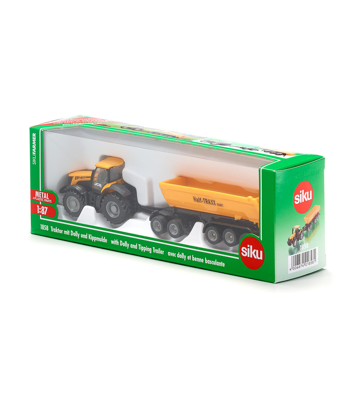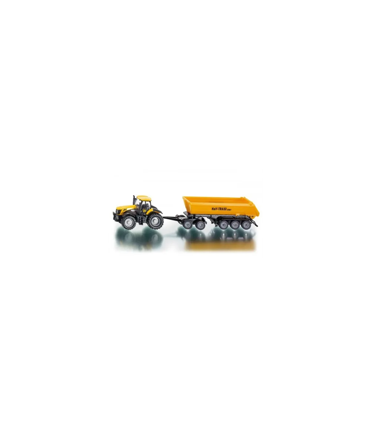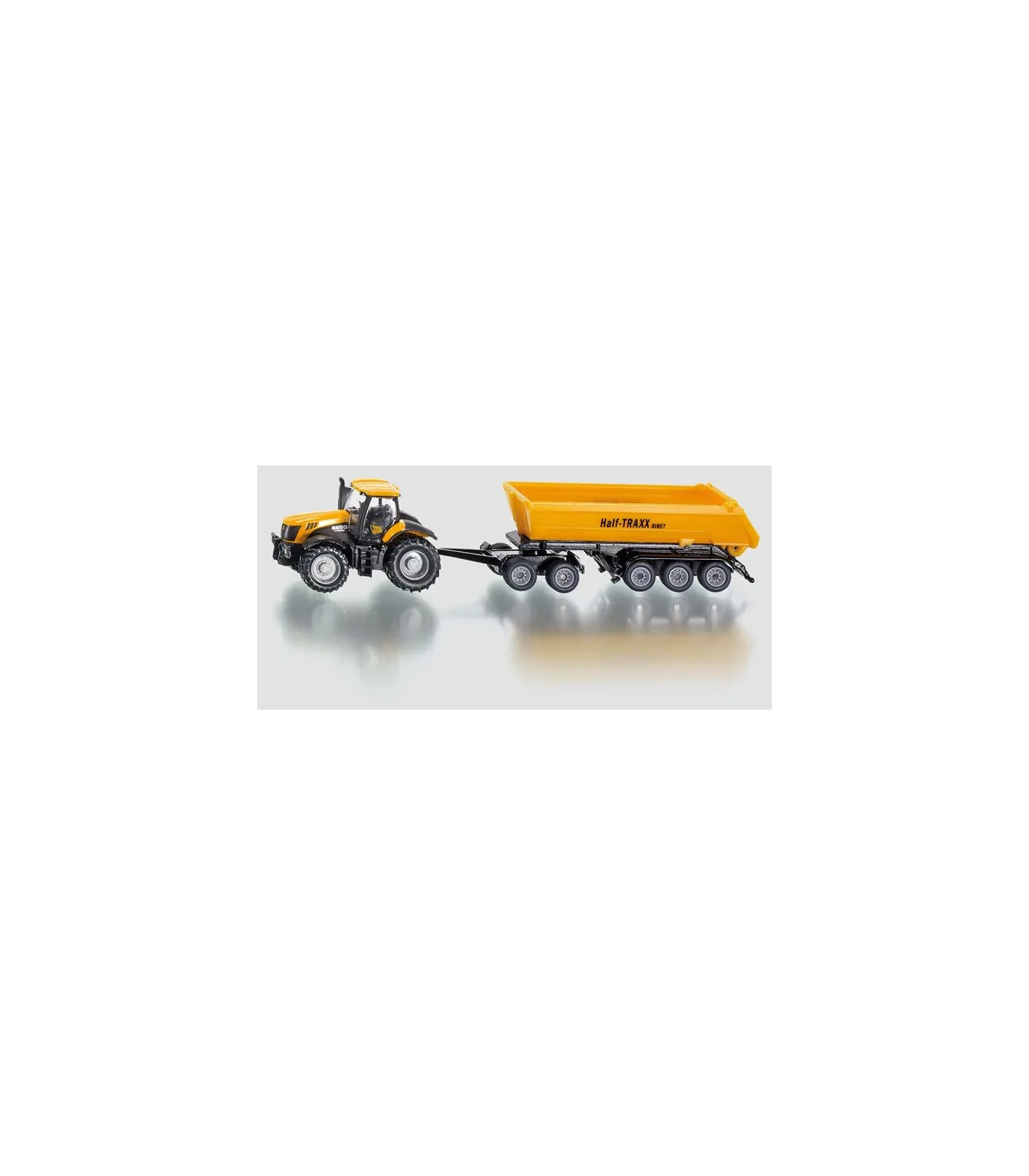 Esta combinación a escala 1:87 adaptada a los niños se centra en el transporte rápido de productos agrícolas a granel. La rápida JCB 8250 remolca un camión volquete de 3 ejes montado sobre un chasis de plataforma rodante de 2 ejes. El conjunto de vehículos está equipado con llantas originales y neumáticos de plástico antideslizante con el perfil original.
