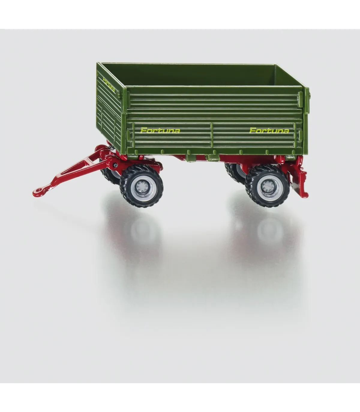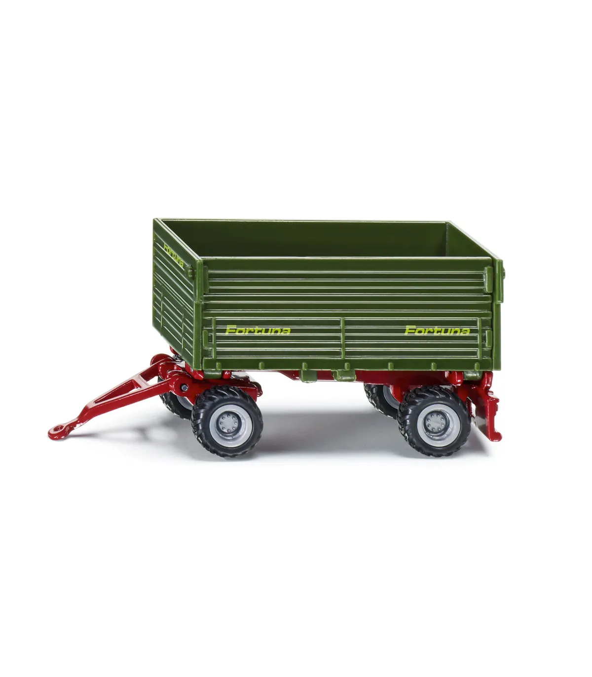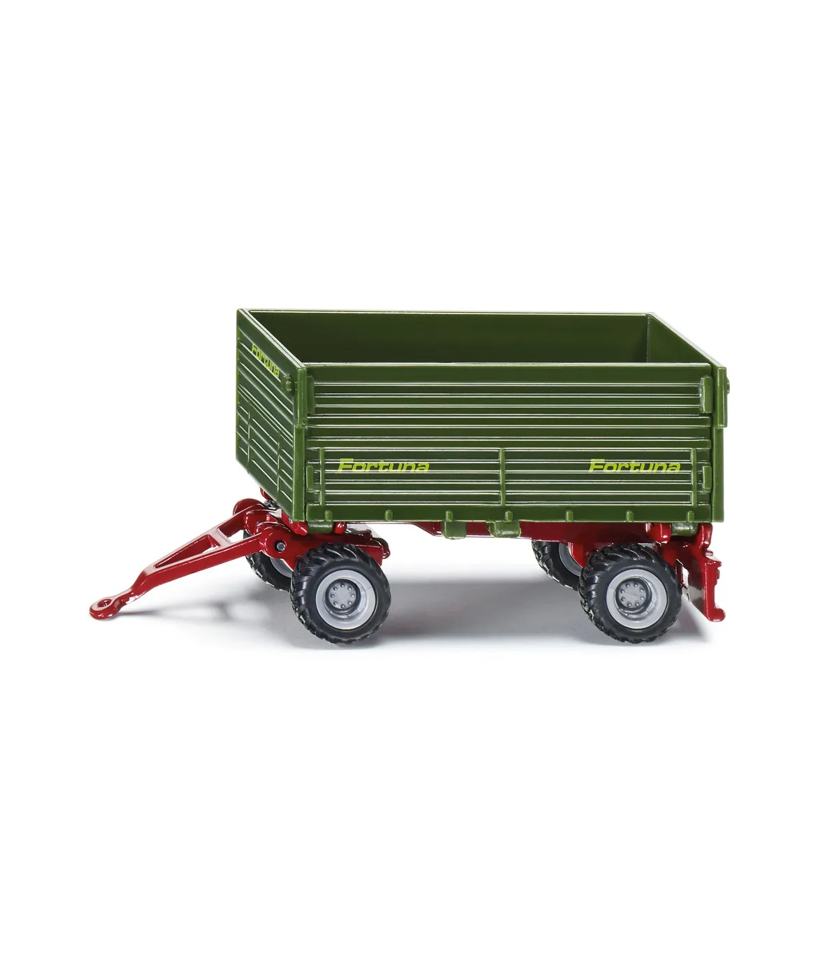 Remolque plataforma giratoria de dos ejes marca Fortuna. Chasis con articulación giratoria y lanza de tracción de metal, cuerpo de plástico. La cubeta se puede inclinar hacia un lado y se puede abrir la pared lateral correspondiente.