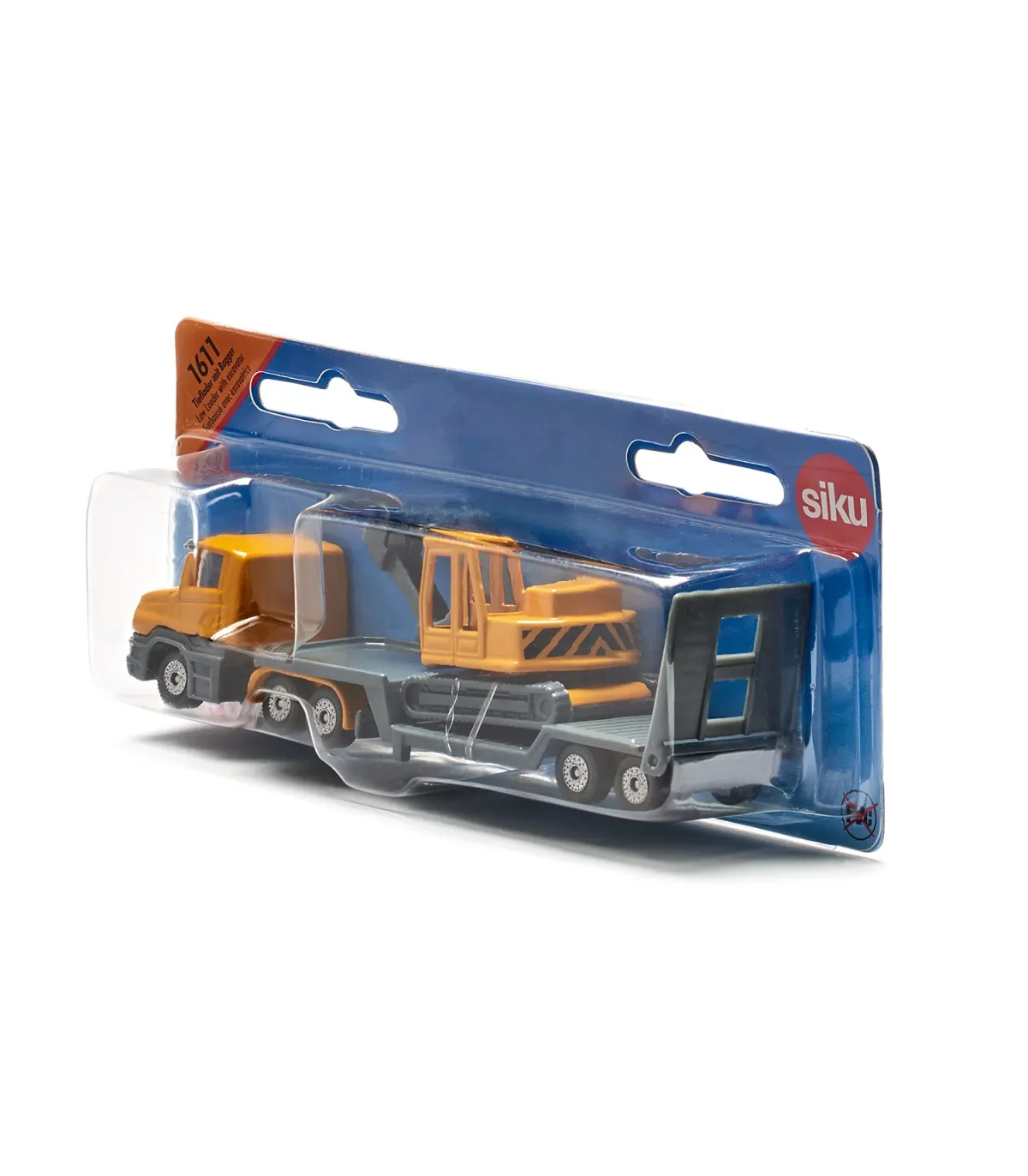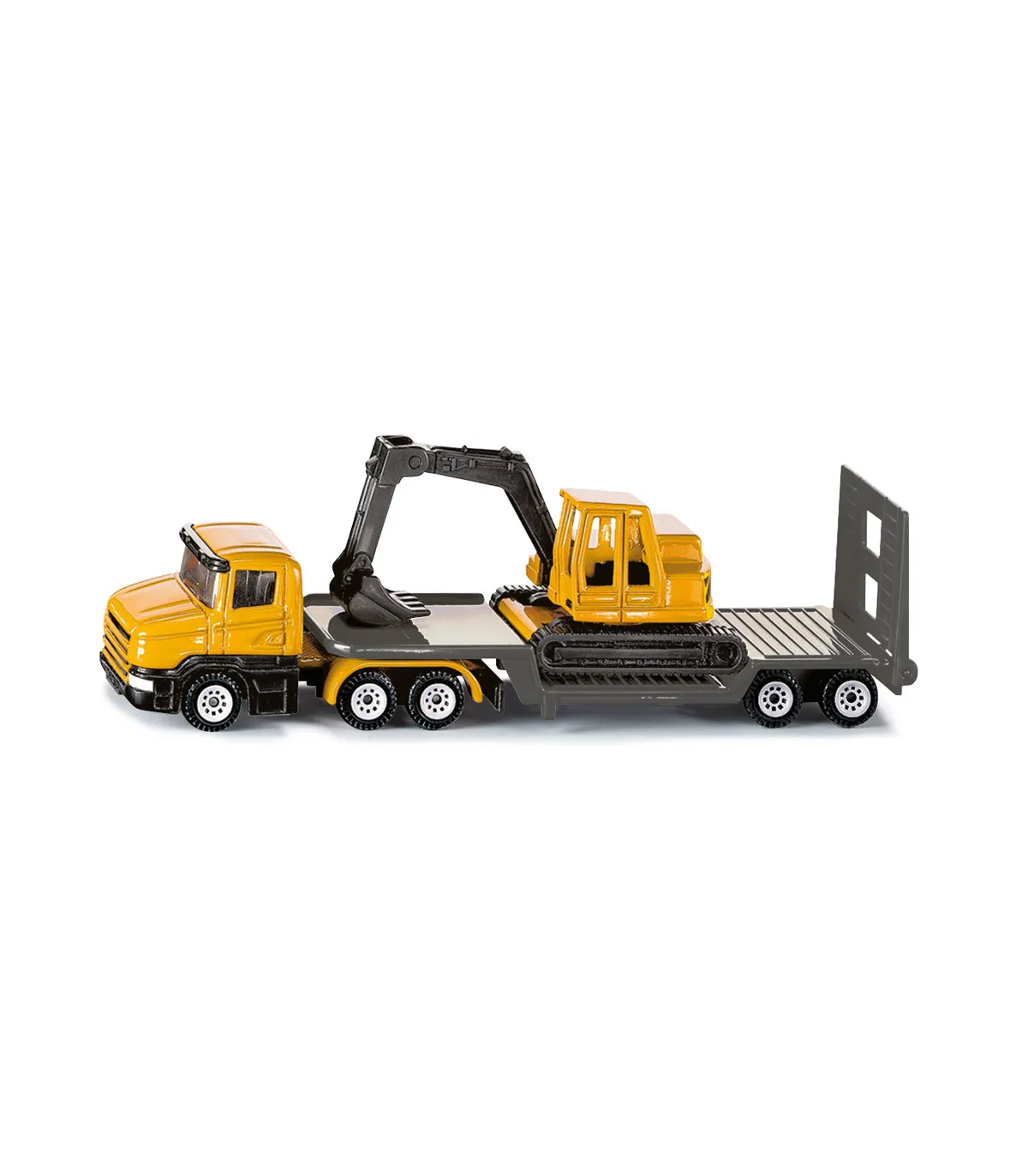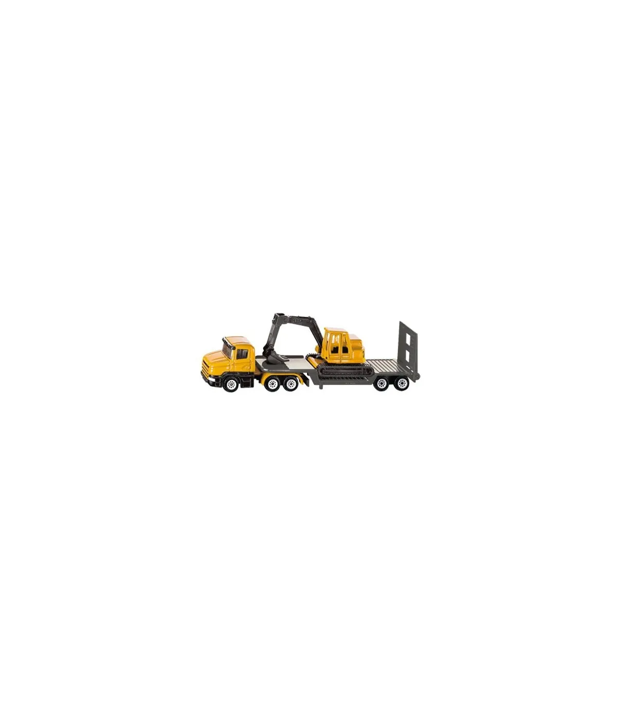 Remolque fabricado con precisión para transportar la excavadora SIKU. Las piezas de metal y plástico, los neumáticos de goma y la protección trasera garantizan un transporte libre de la máquina. La excavadora incluida en el set es un modelo único que refleja la apariencia real, con piezas móviles. Es un modelo atractivo para los entusiastas de los vehículos de construcción de todas las edades.