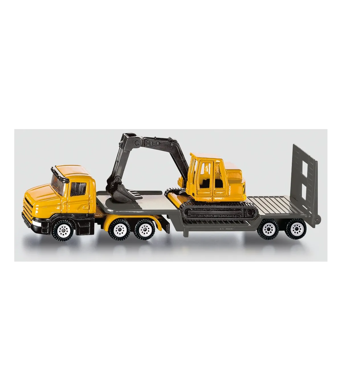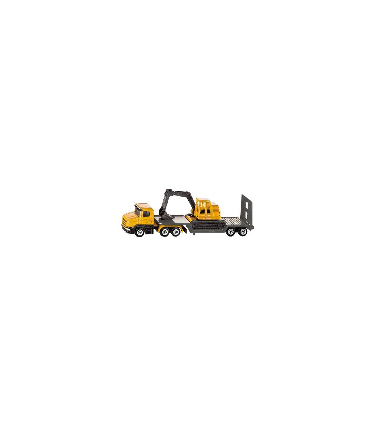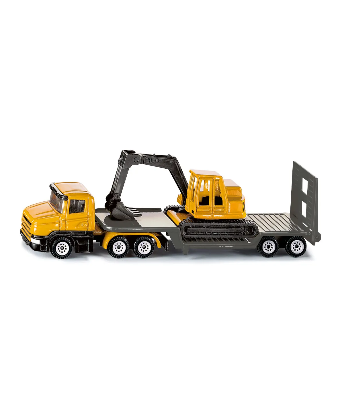 Remolque fabricado con precisión para transportar la excavadora SIKU. Las piezas de metal y plástico, los neumáticos de goma y la protección trasera garantizan un transporte libre de la máquina. La excavadora incluida en el set es un modelo único que refleja la apariencia real, con piezas móviles. Es un modelo atractivo para los entusiastas de los vehículos de construcción de todas las edades.