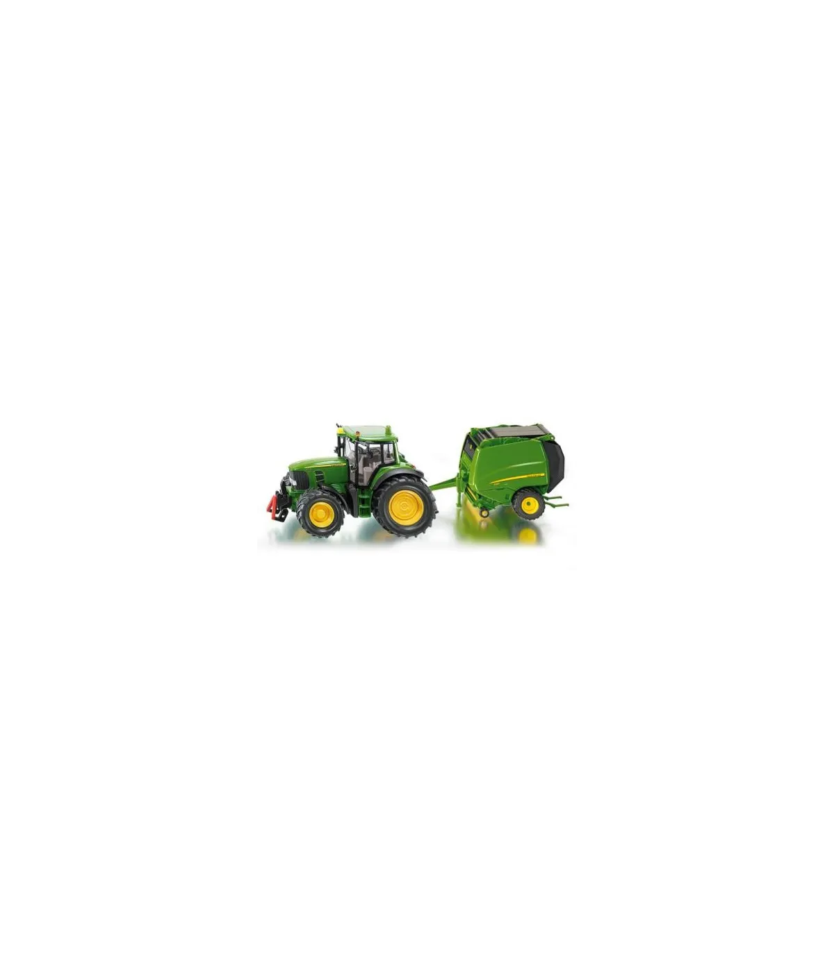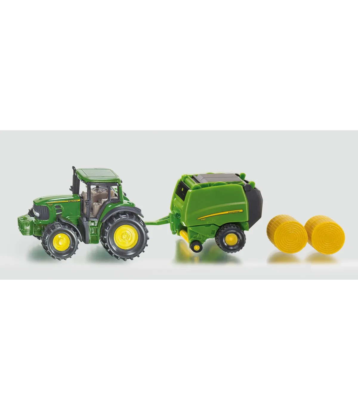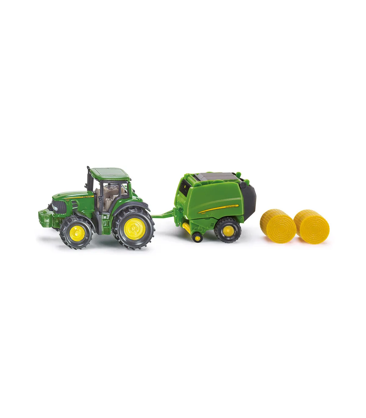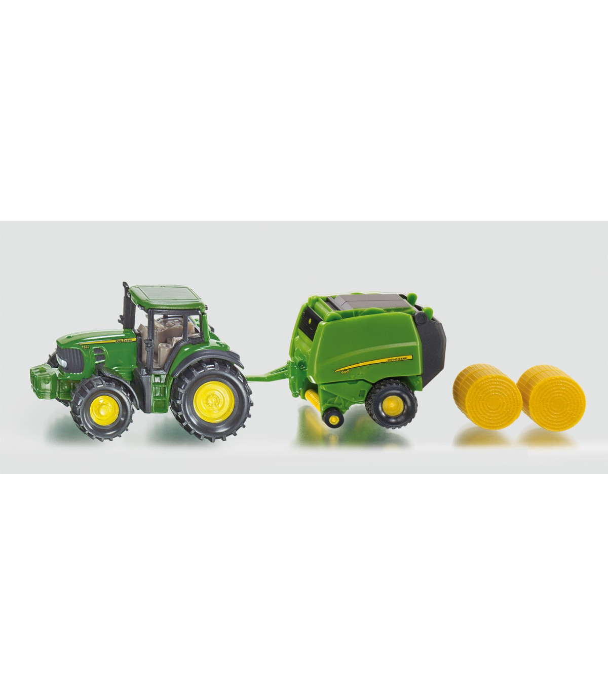 Implementación elegante de la combinación John Deere del tractor 7530 con la galardonada empacadora 990. La cabina del tractor es extraíble. Al abrir la trampilla situada en la parte trasera de la empacadora se puede ver la paca redonda incluida como accesorio.