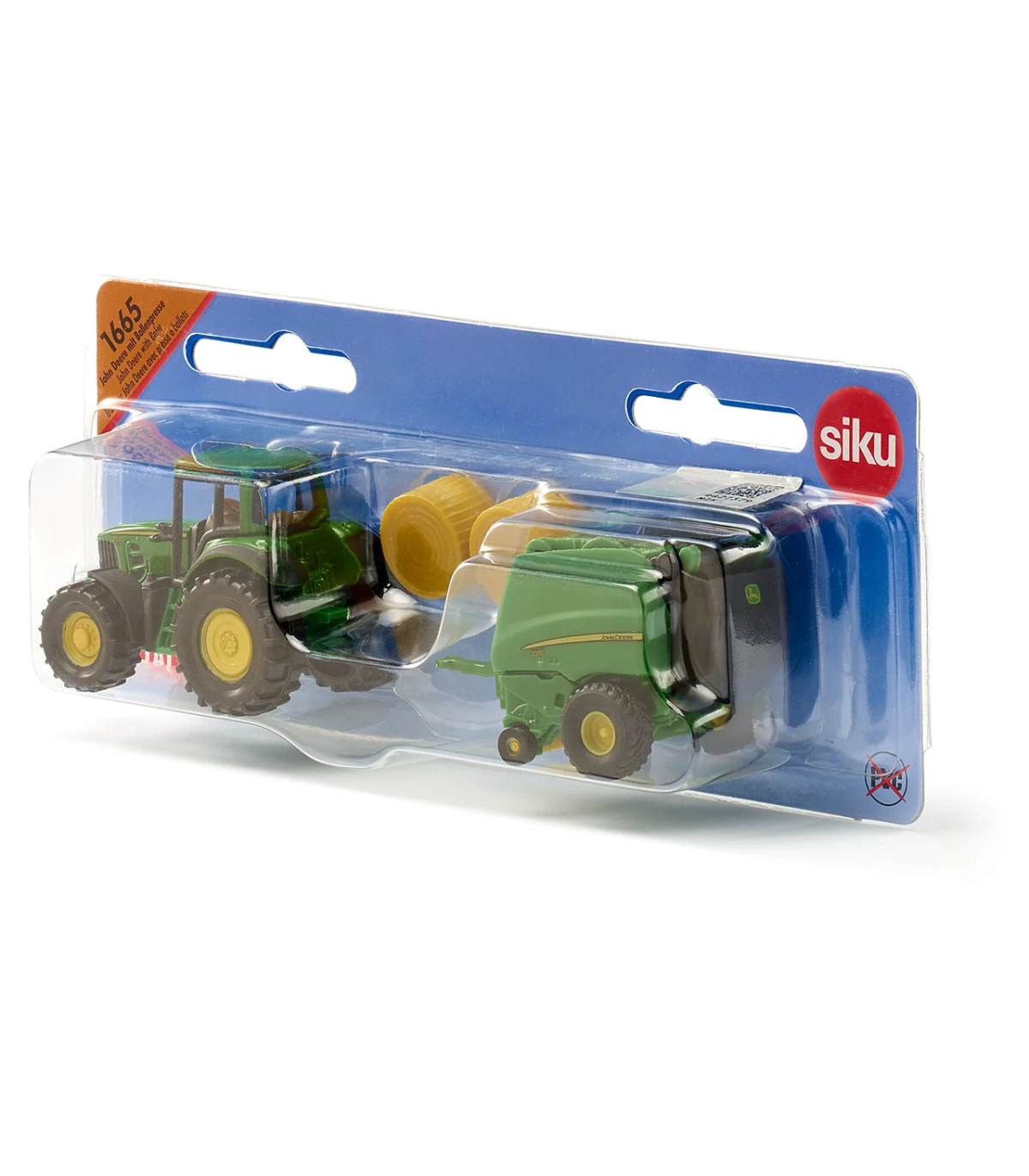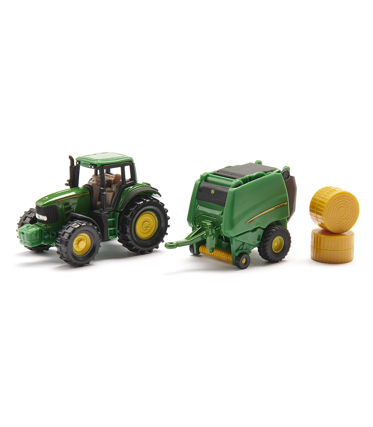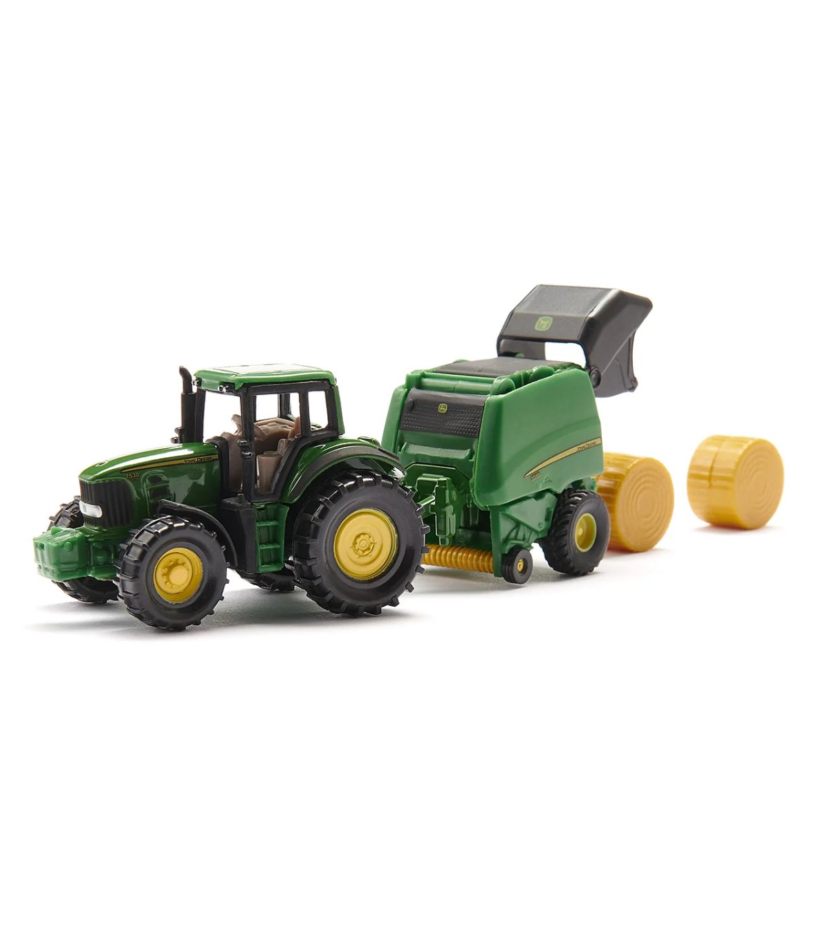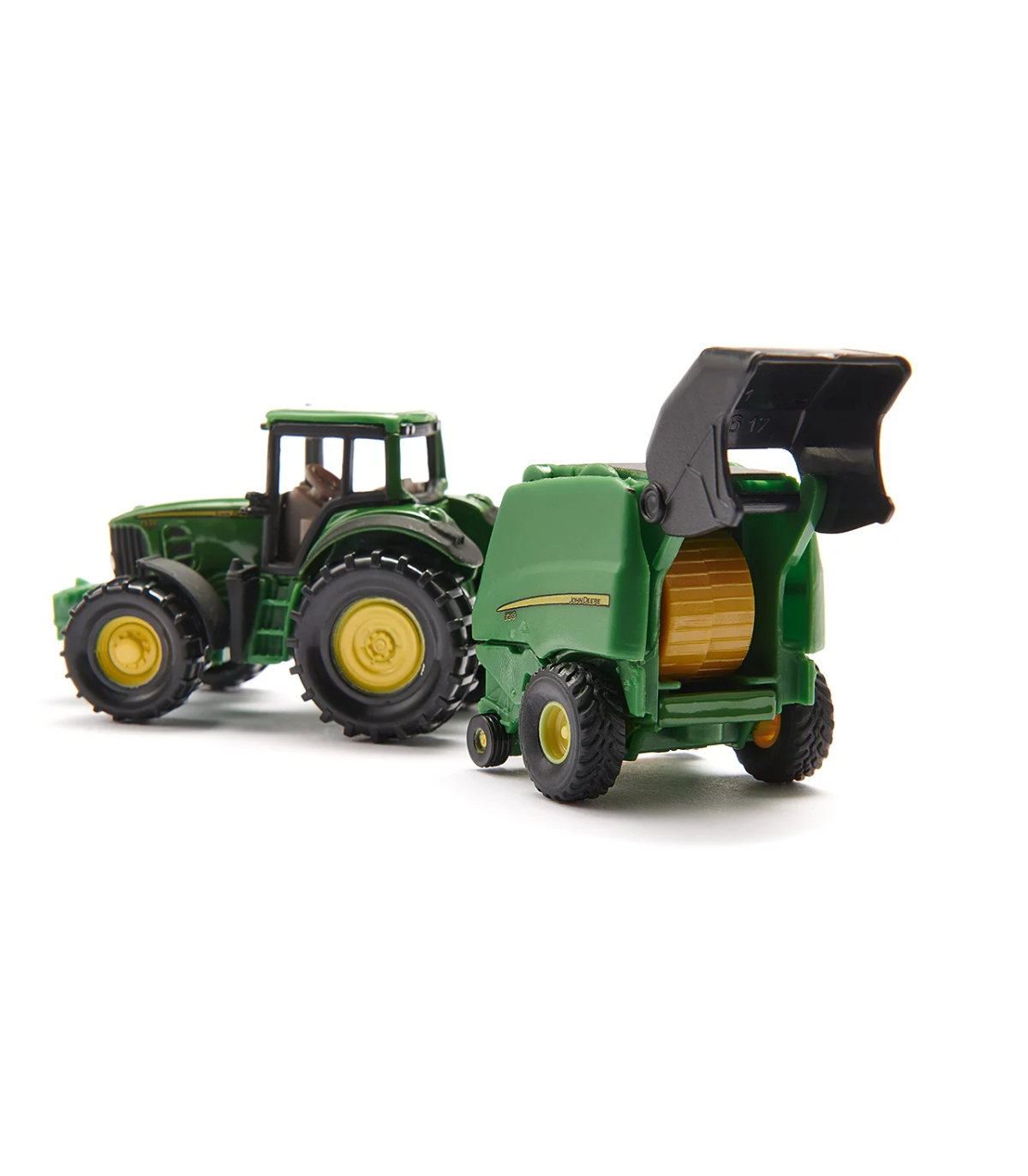 Implementación elegante de la combinación John Deere del tractor 7530 con la galardonada empacadora 990. La cabina del tractor es extraíble. Al abrir la trampilla situada en la parte trasera de la empacadora se puede ver la paca redonda incluida como accesorio.