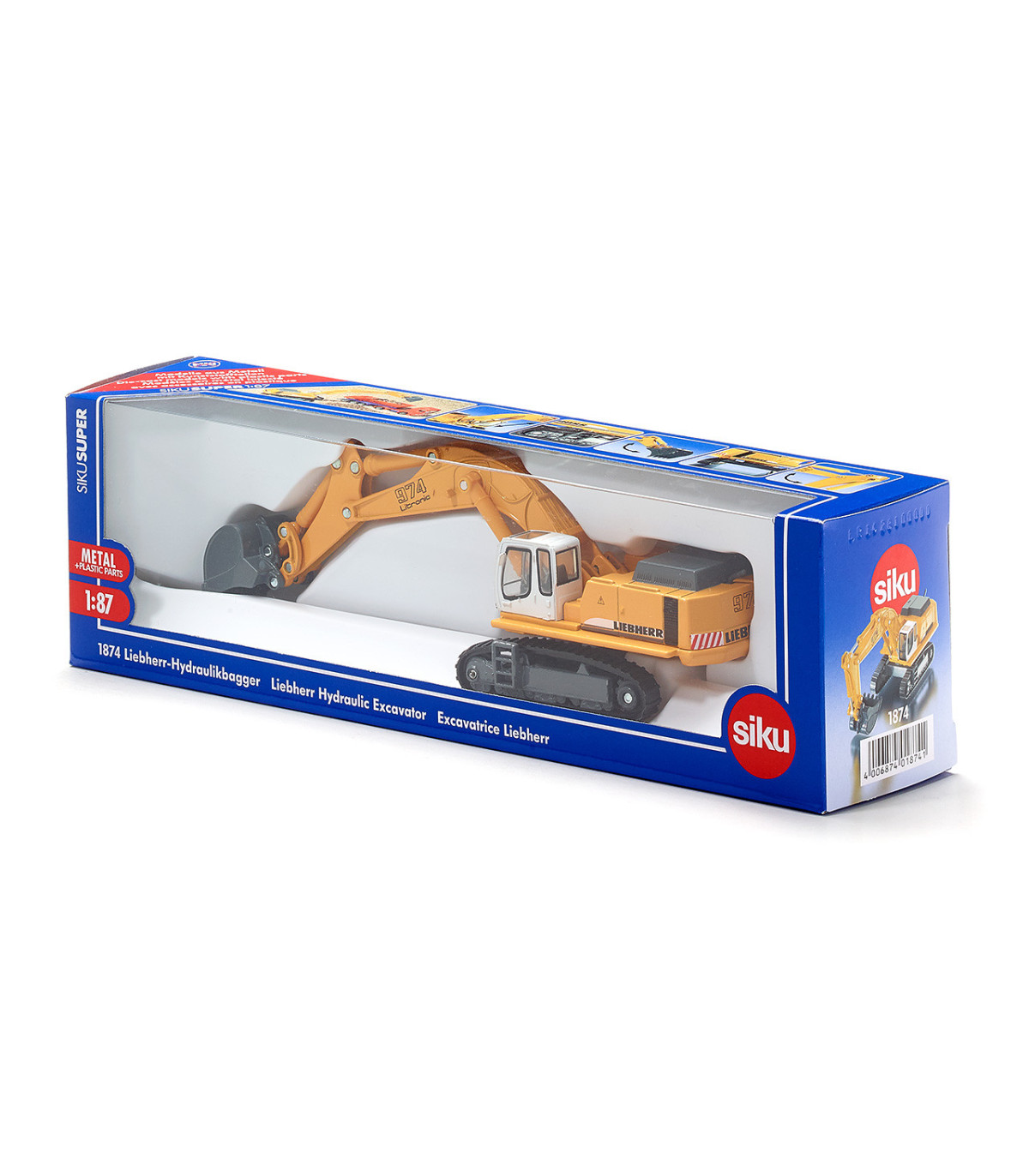 La excavadora hidráulica Liebherr serie R974 fue la inspiración para este modelo 1:87. El tamaño del original se desprende claramente de las dimensiones de este modelo, que está en la típica escala HO. El vehículo, fabricado casi en su totalidad de metal, está equipado con cadenas móviles de plástico. La góndola con brazo de excavadora móvil y pala puede girar 360 grados y está impresa fielmente al original. El modelo es una joya para cualquier habitación infantil en obras, maquetas de trenes o vitrinas de coleccionista.