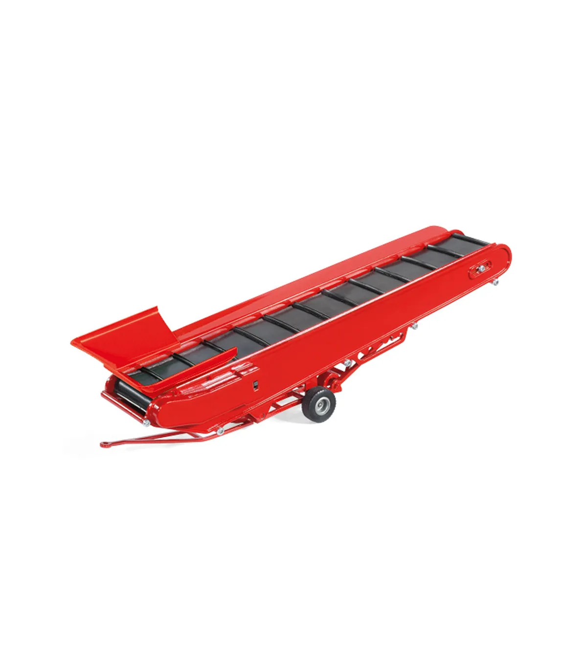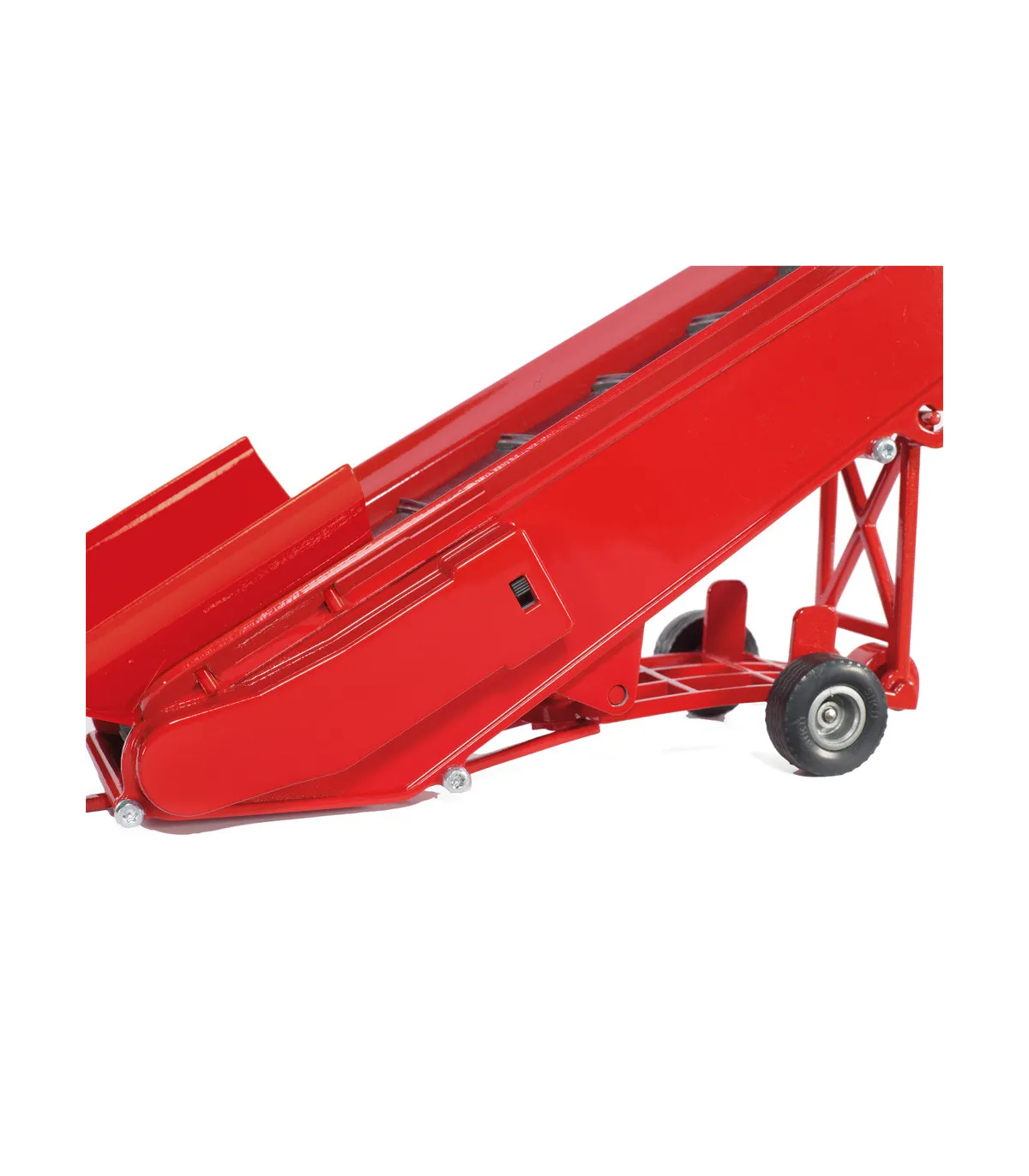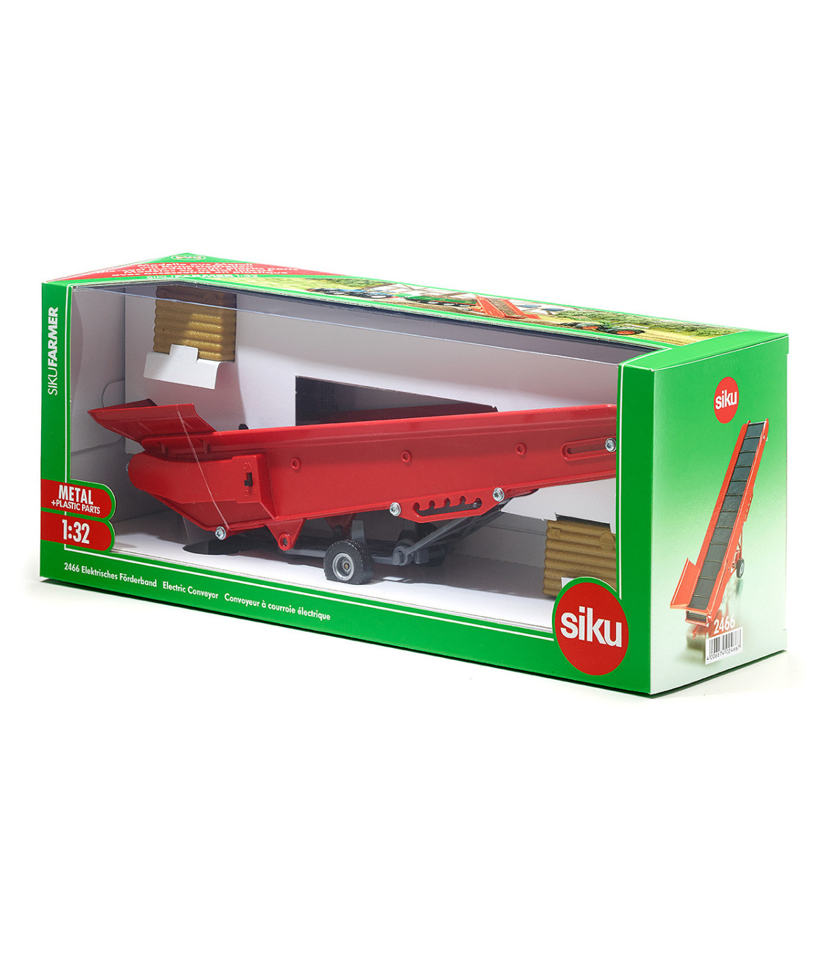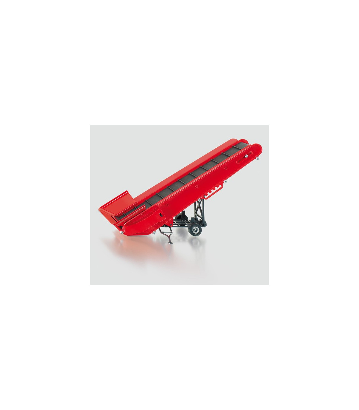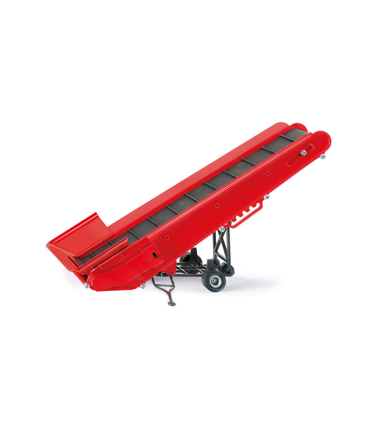 Con la nueva cinta transportadora eléctrica, las tareas de carga en la granja de la habitación de los niños se convierten en un verdadero placer. La cinta transportadora que funciona con pilas (2 pilas AAA) se activa mediante un simple interruptor de encendido/apagado. El material sólo se transporta en una dirección desde la tolva, hacia arriba o hacia atrás (dependiendo de la posición angular de la cinta). La posibilidad de ajustar el ángulo permite crear un recorrido de cinta transportadora utilizando varias cintas transportadoras colocadas una detrás de otra. La cinta se llena a través de un embudo en el que se puede verter el material de los remolques SIKU. La tolva y el chasis de un solo eje con lanza son de metal. El marco que rodea la cinta transportadora es de plástico. La cinta transportadora se puede colocar en posición horizontal para el transporte. Gracias a la barra de tiro, ahora se puede colgar en cualquier tractor SIKU y transportar a una nueva ubicación.