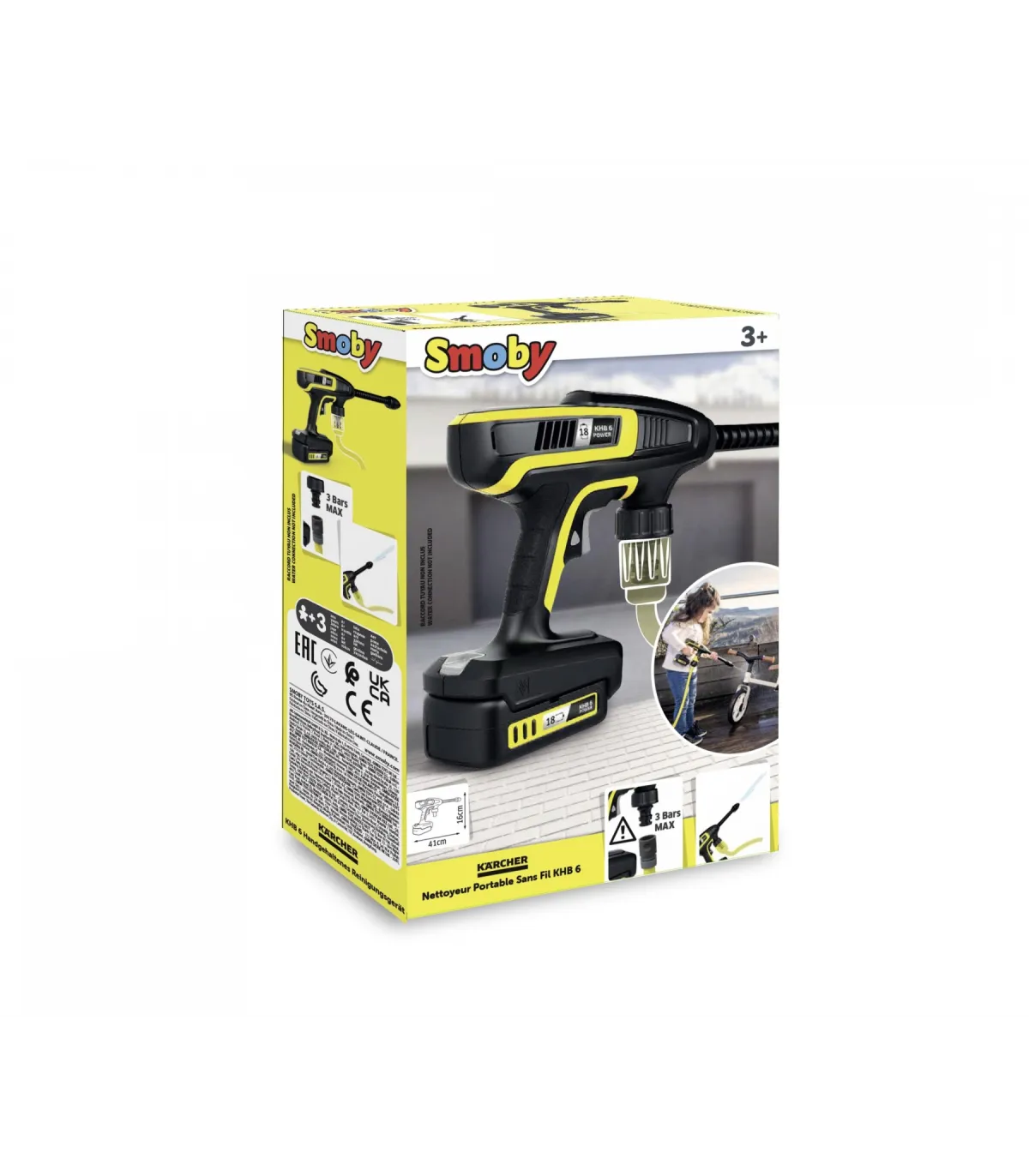 La limpiadora de media presión Smoby es una réplica detallada de la gran KHB 6 original de Kärcher, equipada con una conexión para una manguera de jardín estándar para una función de chorro de agua apta para niños.