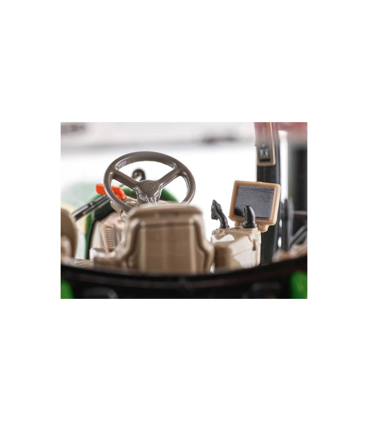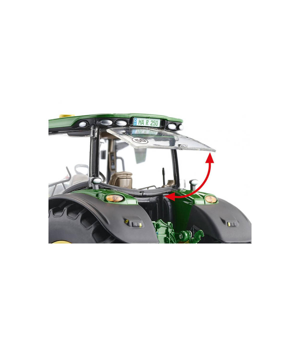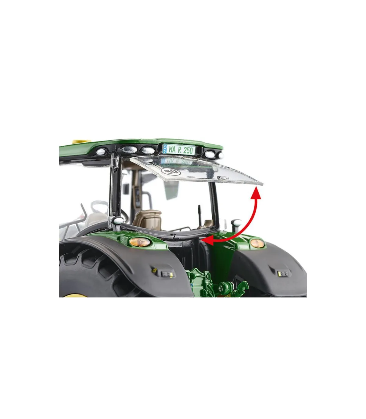 El capó se puede abrir para que, gracias a la representación detallada, se pueda ver el potente motor de forma prototípica. El modelo tiene eslabones superiores e inferiores móviles. El enganche de remolque está diseñado como enganche de remolque. El peso delantero se puede quitar por delante. Se pueden abrir ambas puertas laterales y la ventana trasera de la cabina. El eje pendular también se puede controlar mediante el volante. Ambos retrovisores exteriores son plegables. El interior de la cabina con todos los instrumentos es modelo. La pantalla se encuentra ahora al nivel del pilar A. Las placas de matrícula, las señales de advertencia y las luces, así como las conexiones hidráulicas, reciben una impresión delicada. La parte trasera también parece estar reproducida de forma muy realista y los neumáticos tienen una banda de rodadura rugosa.