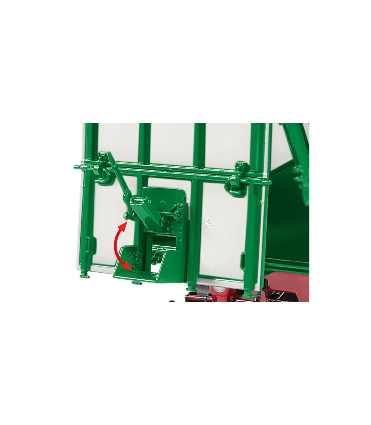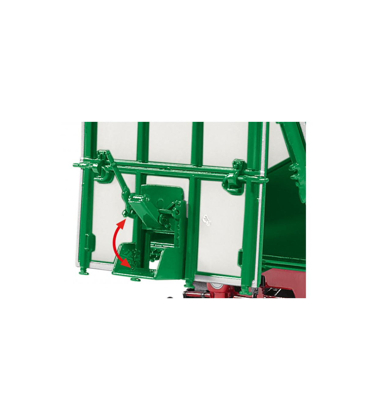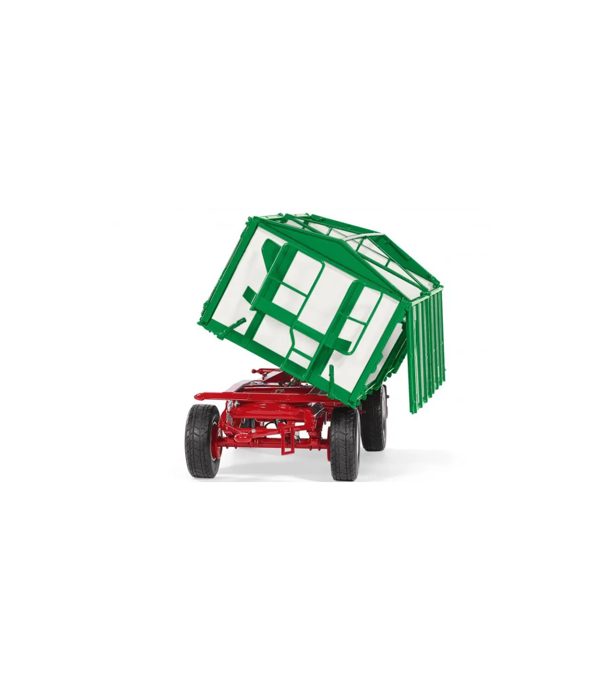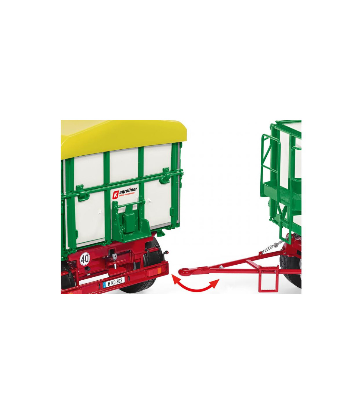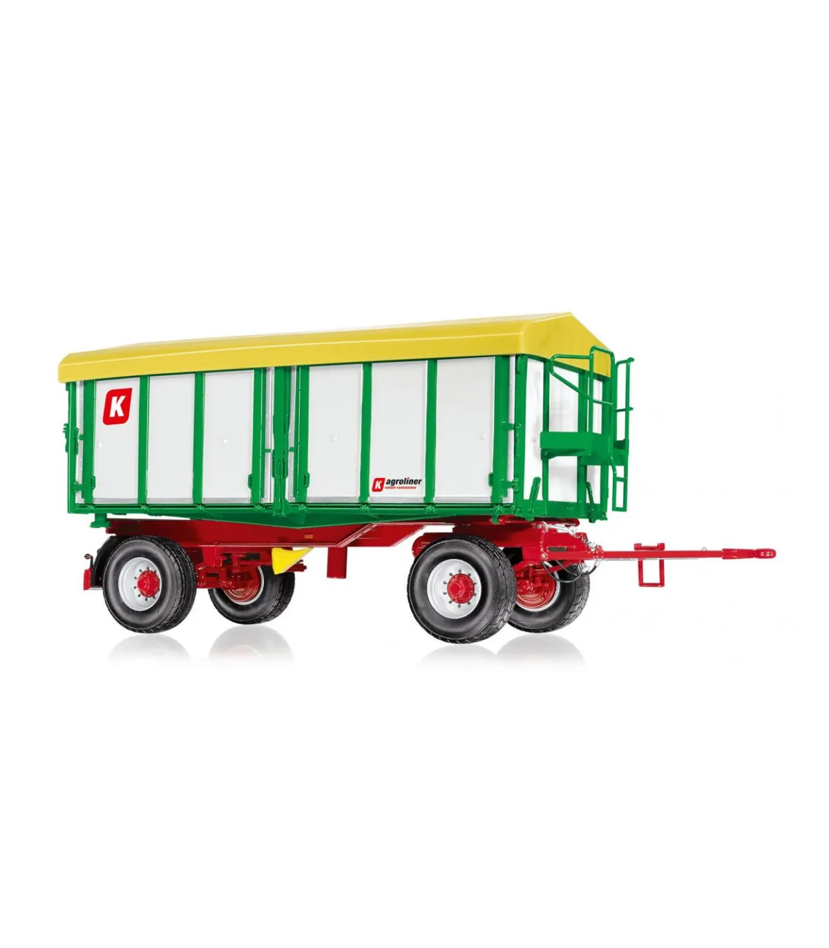 WIKING también ha trasladado la autenticidad del modelo a la escala 1:32. El chasis con plato giratorio y lanza es de zinc. Mientras que la plataforma con sus paredes laterales parece tener un diseño auténtico, la delicada impresión de la marca completa el aspecto original. Los neumáticos tienen el perfil típico de la carretera y WIKING ha reducido el tamaño de las llantas al modelo original de Kröger. Las ballestas de los ejes simulan la función realista del resorte. El cilindro de elevación tiene capacidades telescópicas y giratorias completas. La plataforma delantera del remolque está reproducida con delicadeza. El parachoques trasero parece de metal y completa la detallada apariencia con un enganche de remolque instalado en el centro con el típico aspecto de enganche de remolque. La iluminación trasera del remolque está hecha de plástico, al igual que los guardabarros.